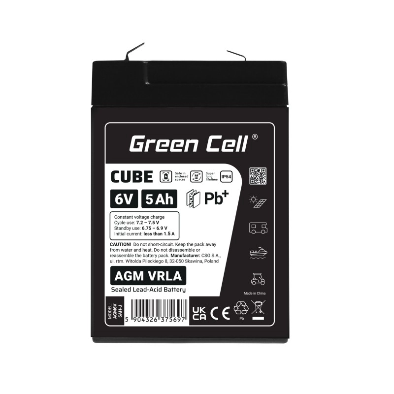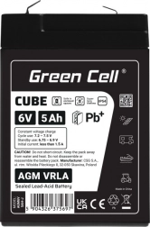 UNIVERZÁLNÍ a odolná olověná baterie GREEN CELL CUBE s kapacitou 5 Ah a napětím 6 V využívá moderní technologii AGM VRLA, kde je elektrolyt vázán ve skelné rohoži. Díky tomu je zcela uzavřená a bezúdržbová, bez rizika úniku a s možností provozu v různých polohách.