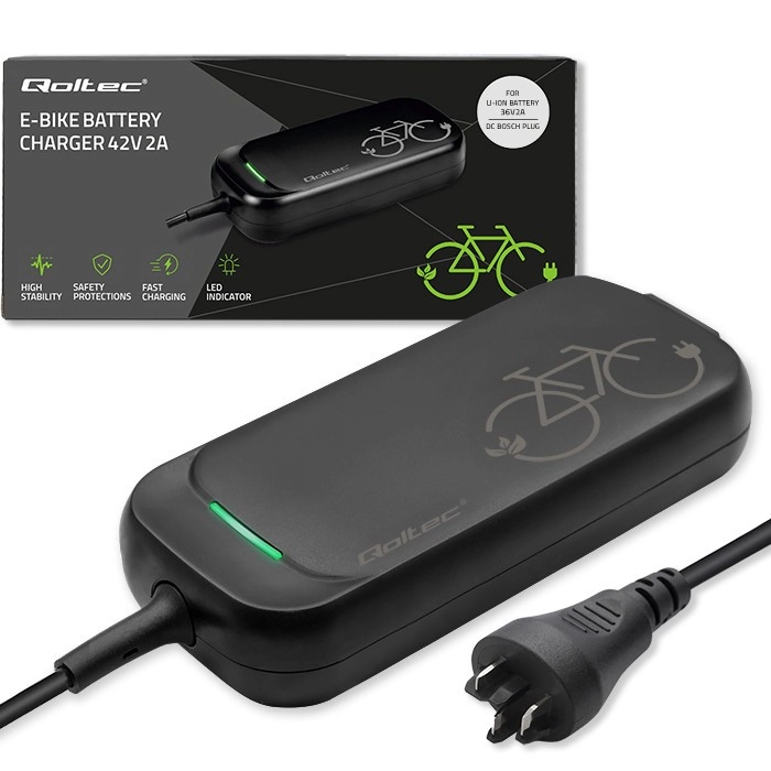 Kompaktní nabíječka Qoltec pro e‑bike s konektorem BOSCH nabízí napětí 42 V, proud 2 A a výkon 84 W pro akumulátory 36 V Li‑ion. Nabíjí z běžné zásuvky 230 V, má LED indikaci stavu a splňuje IP54 pro odolnost proti prachu a stříkající vodě. Integrovaná elektronika zajišťuje bezpečné a efektivní nabíjení bez rizika přebití.