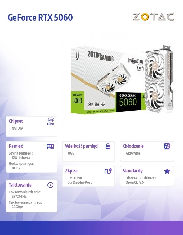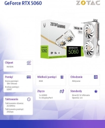 Vychutnejte si moderní PC hraní s kartou ZOTAC GAMING GeForce RTX 5060 Twin Edge OC White – kompaktním modelem s továrním přetaktováním, který kombinuje vysoký výkon, nízké teploty a elegantní bílé provedení. Díky architektuře NVIDIA Blackwell a technologiím jako DLSS 4 a ray tracing získáte vyšší snímkové frekvence a detailní obraz i v náročných hrách.