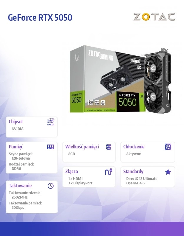 ZOTAC GAMING GeForce RTX 5050 Twin Edge OC je navržena pro hráče, kteří hledají kompaktní, ale výkonnou grafickou kartu. Moderní architektura NVIDIA Blackwell a technologie DLSS 4 umožňují vyšší snímkové frekvence, čistší obraz a plynulejší hraní ve Full HD i QHD.