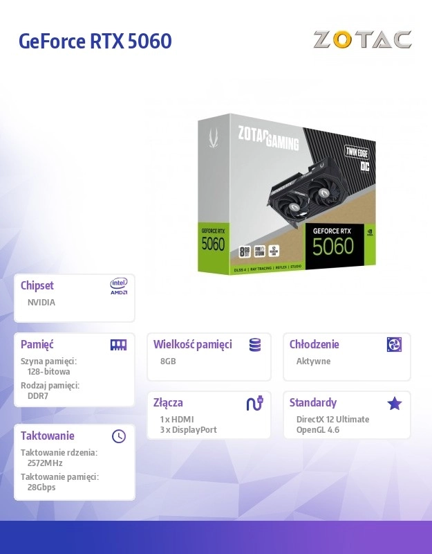 Užijte si plynulé hraní a akceleraci AI s kartou ZOTAC GAMING GeForce RTX 5060 Twin Edge OC. Moderní architektura NVIDIA Blackwell, pokročilé ray tracingové jednotky a technologie DLSS 4 dodají vysoké FPS i ve vysokém rozlišení, zatímco rychlá paměť GDDR7 zajistí bleskové nahrávání textur a stabilní výkon.