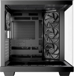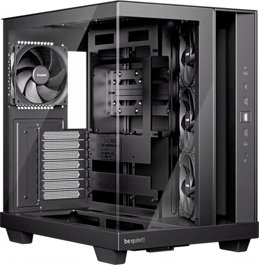 Z výroby osazené 4 ventilátory Pure Wings 3 120 mm PWM – boční s obrácenými lopatkami pro čistý vzhled, optimalizované lopatky pro vysoký průtok a nízké turbulence.
