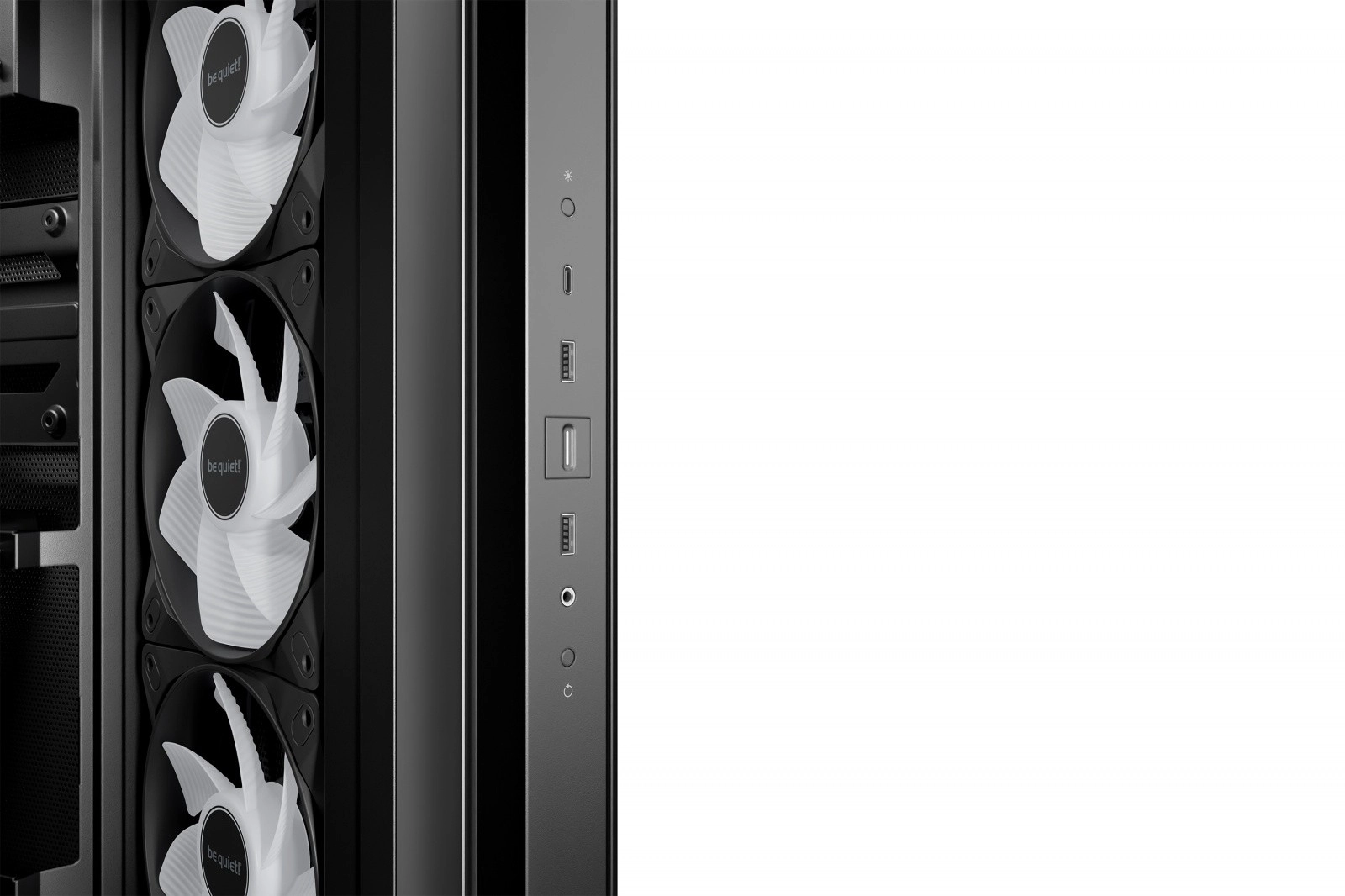 Čtyři Light Wings LX 120 mm PWM (zadní + boční s obrácenými lopatkami) poskytují vysoký průtok vzduchu a působivé ARGB osvětlení s 16 LED v náboji rotoru. Integrované tlačítko ARGB v I/O panelu nabízí předvolené efekty a barvy, přičemž přibalený 6kanálový ARGB/PWM hub nechává 4 volné porty pro další zařízení.