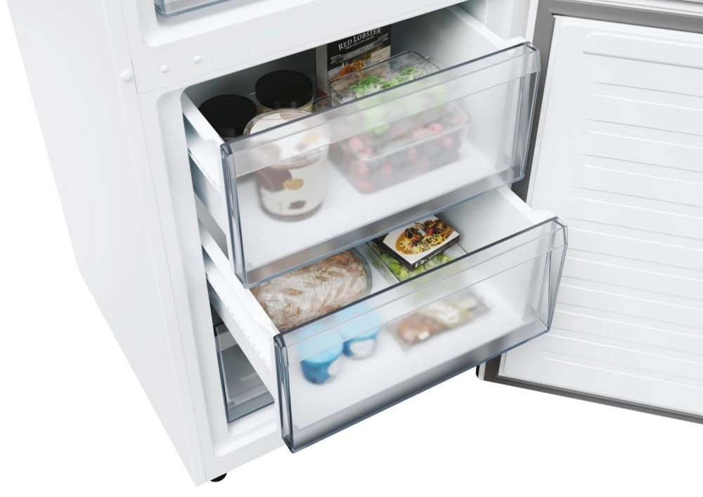 Tři prostorné a průhledné zásuvky v mrazáku umožňují rychlou orientaci i ukládání objemnějších balení bez zbytečného hledání.