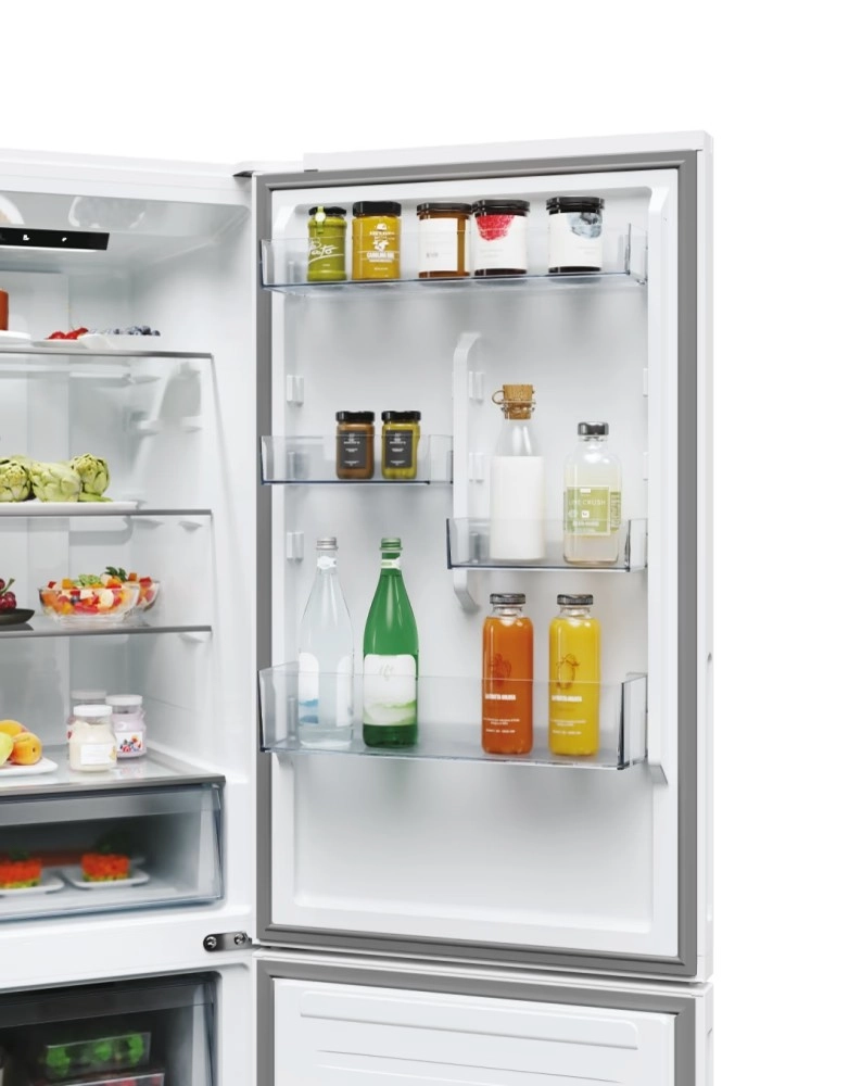 Tato volně stojící chladnička s mrazákem dole kombinuje čistý minimalistický design s promyšlenou vnitřní organizací. Průhledné boxy a nastavitelné police umožní přehledné uložení nápojů, ovoce, zeleniny i hotových jídel, zatímco jasné LED světlo zajistí perfektní viditelnost v každém rohu.