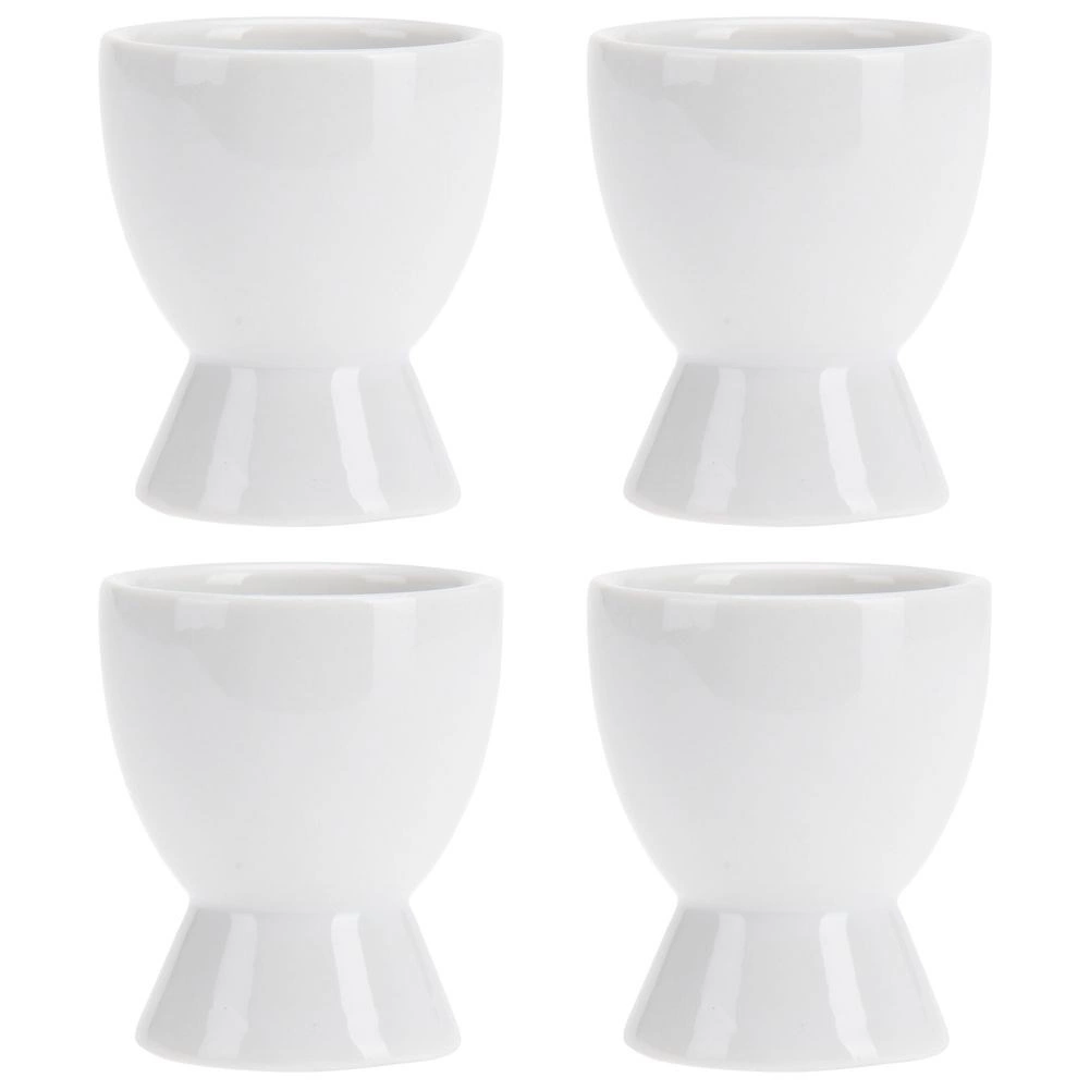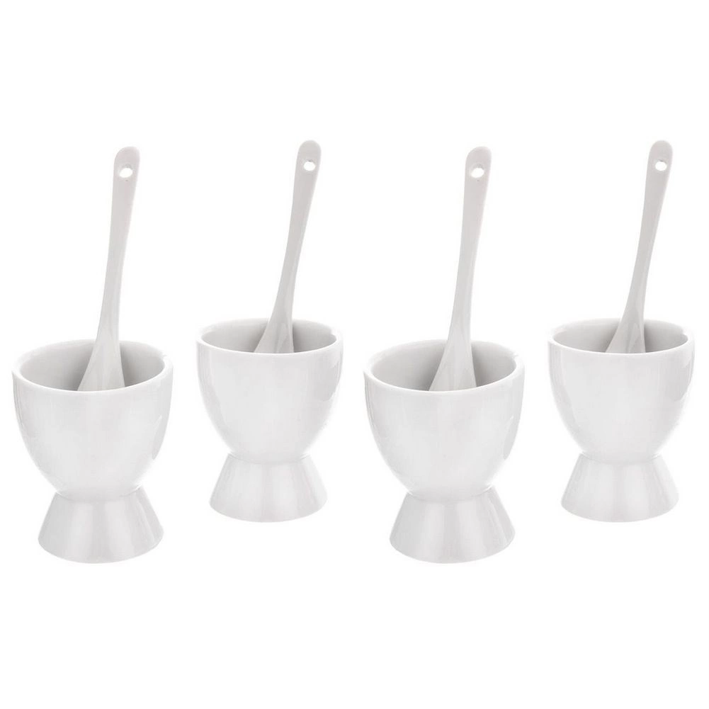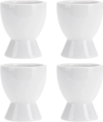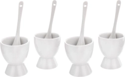 Elegantní sada čtyř bílých porcelánových stojánků na vejce s odpovídajícími lžičkami pro pohodlné servírování a konzumaci. Stojánky mají klasický tvar a nadčasový design, který se hodí k jakékoli jídelní sadě. Vysoce kvalitní porcelán je odolný, snadno se čistí a je vhodný do myčky nádobí.