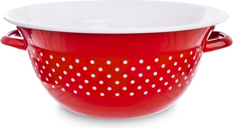 Emalovaná mísa s uchyty v oblíbeném retro stylu se skvěle hodí na hnětení těsta, míchání surovin i přípravu salátů. Odolná ocel s kvalitní emajlovou vrstvou je hygienická, chuťově neutrální a bezpečná pro každodenní kontakt s potravinami. Elegantní červené provedení s bílými puntíky ozdobí každou kuchyň i jídelní stůl.