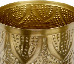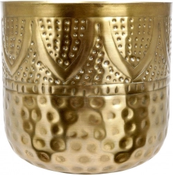 Elegantní zlatý obal na květináč o rozměrech 19 × 18 cm je perfektním doplňkem pro domov, kancelář, balkon i terasu. Precizně provedený tepaný a embosovaný vzor vytváří sofistikovaný efekt, který zvýrazní krásu živých i umělých rostlin a obohatí každý interiér, zejména ve stylu glamour.