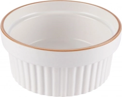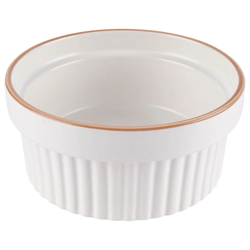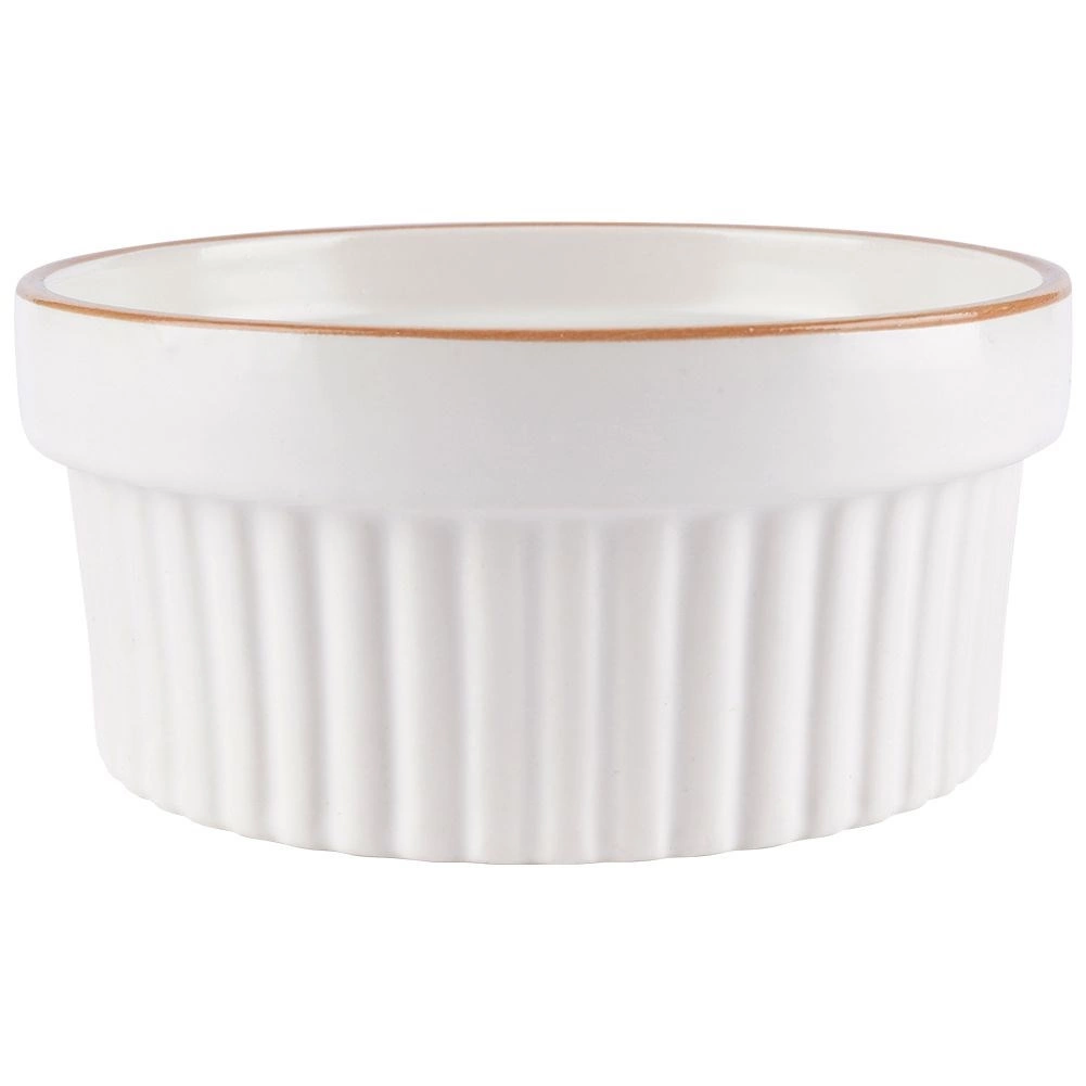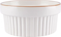 Bílé porcelánové ramekiny s jemným béžovým lemem a vertikálním žebrováním dodají vašim dezertům i slaným pokrmům profesionální vzhled.