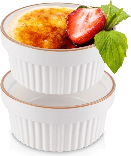 Praktická sada dvou porcelánových ramekinek o průměru 11 cm a objemu 275 ml je ideální pro každodenní pečení i servírování. Odolná keramika je žáruvzdorná, vhodná do trouby, mikrovlnky, mrazáku i myčky nádobí. Klasický žebrovaný design v bílé barvě s decentním béžovým lemem se hodí na každý stůl a perfektně zvýrazní dezerty i slané zapékané pokrmy.