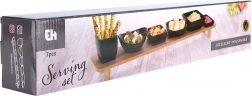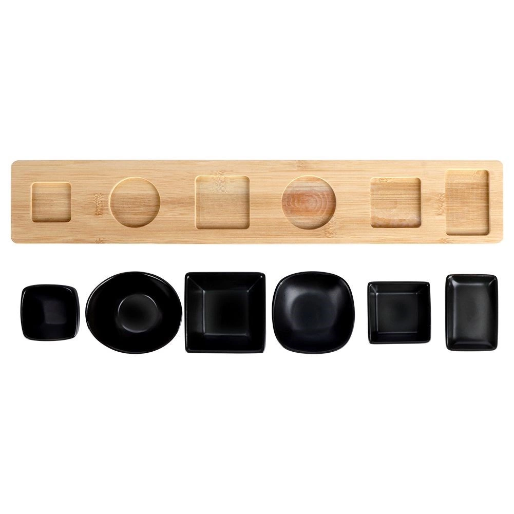 Tato designová sada spojí praktičnost a estetiku při každodenním servírování. Šest keramických misek v černé barvě doplňuje pevný bambusový podstavec na nohách, který vše přehledně zorganizuje a elegantně pozvedne nad stůl. Díky přesně tvarovaným vybráním zůstanou misky na svém místě i při přenášení.