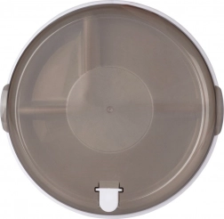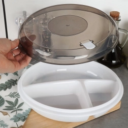 Dělený talíř s průhledným kouřovým víkem je ideální pro přehledné servírování a ohřev. Tři přihrádky různé velikosti udrží chutě a vůně odděleně, takže si vychutnáte každou část jídla bez mísení. Ventilační otvor ve víku minimalizuje kondenzaci, zabraňuje rozstřikům a pomáhá udržet šťavnatost pokrmů.