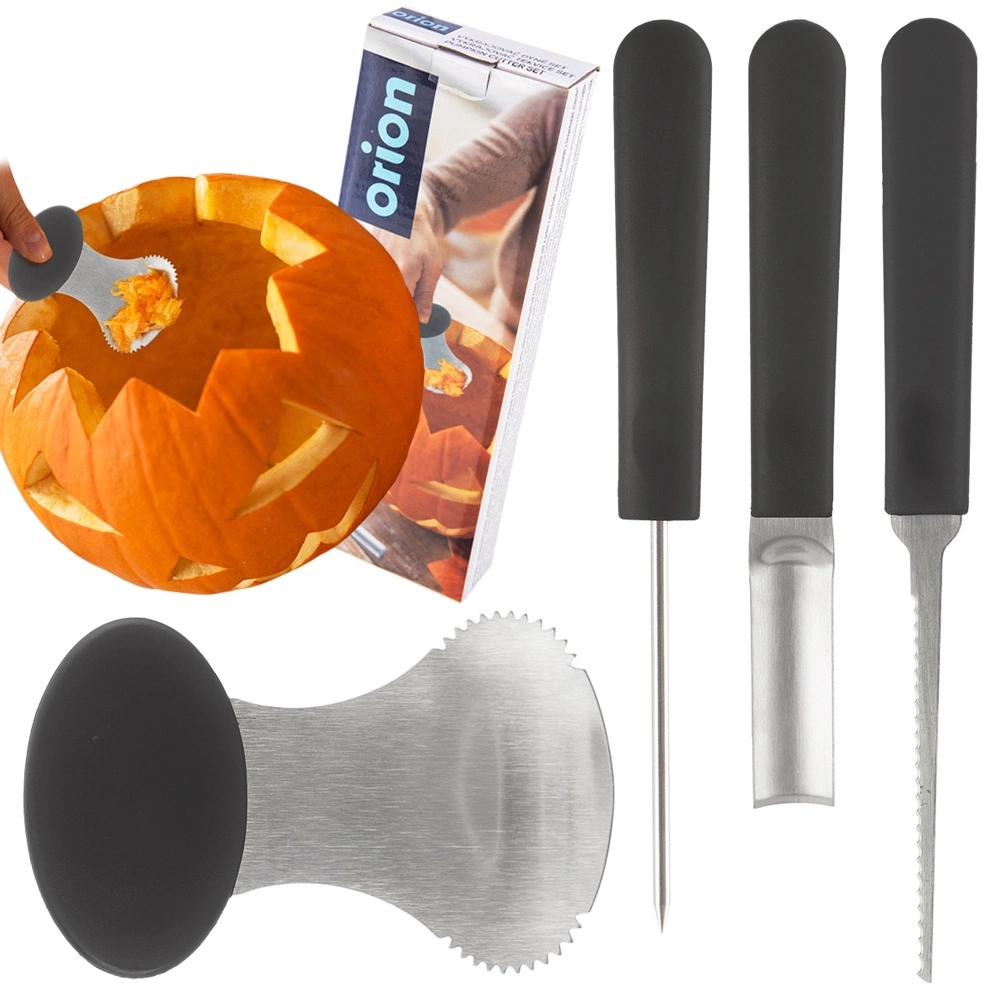 Objevte snadné a bezpečné dlabání dýní, melounů a dalšího ovoce se sadou 4 nástrojů. Obsahuje špachtli, bodec, profilované dláto a zoubkovaný nůž pro přesné vyřezávání, rychlé odstranění dužiny a pohodlné držení. Vyrobeno z nerezové oceli a odolného plastu, vhodné do myčky nádobí.