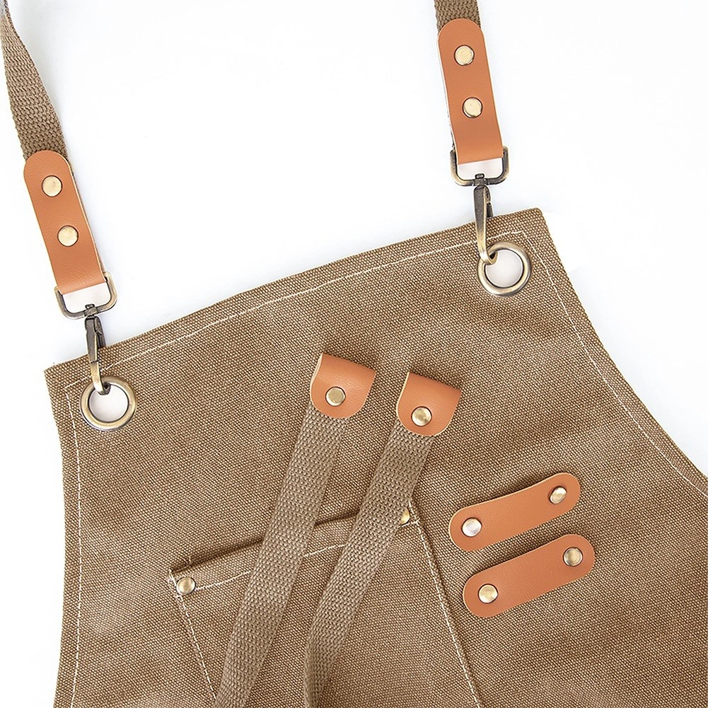 Promyšlená konstrukce s křížovými popruhy na zádech rovnoměrně rozkládá váhu a drží zástěru bezpečně na místě. Přední dvojitá kapsa a menší přihrádka pojmou kuchyňské i pracovní drobnosti, zatímco dvě poutka jsou ideální na tužku či nástroj.