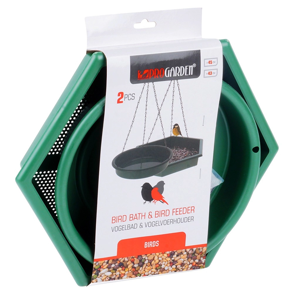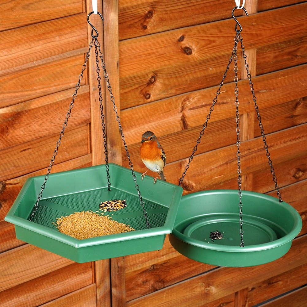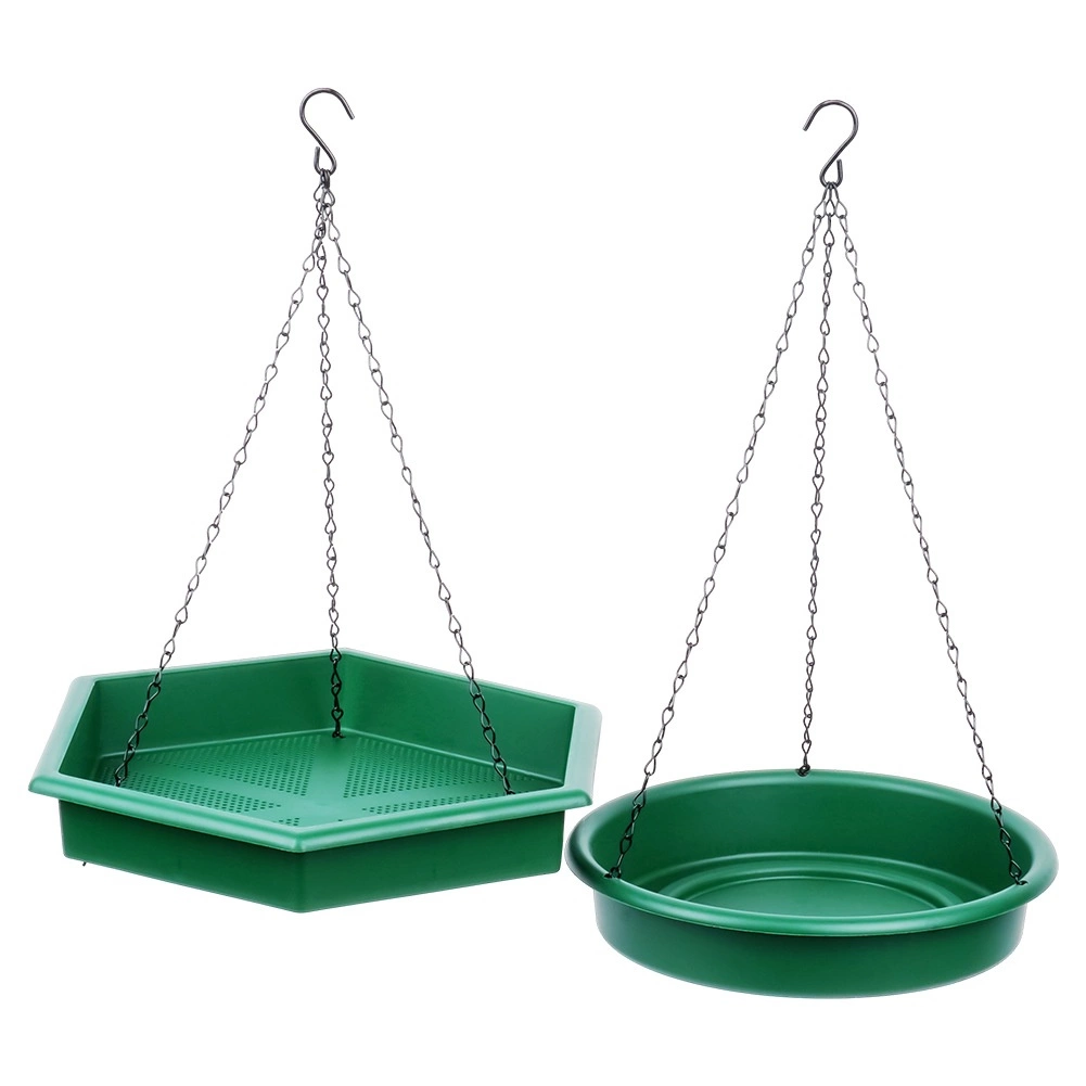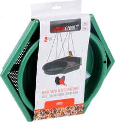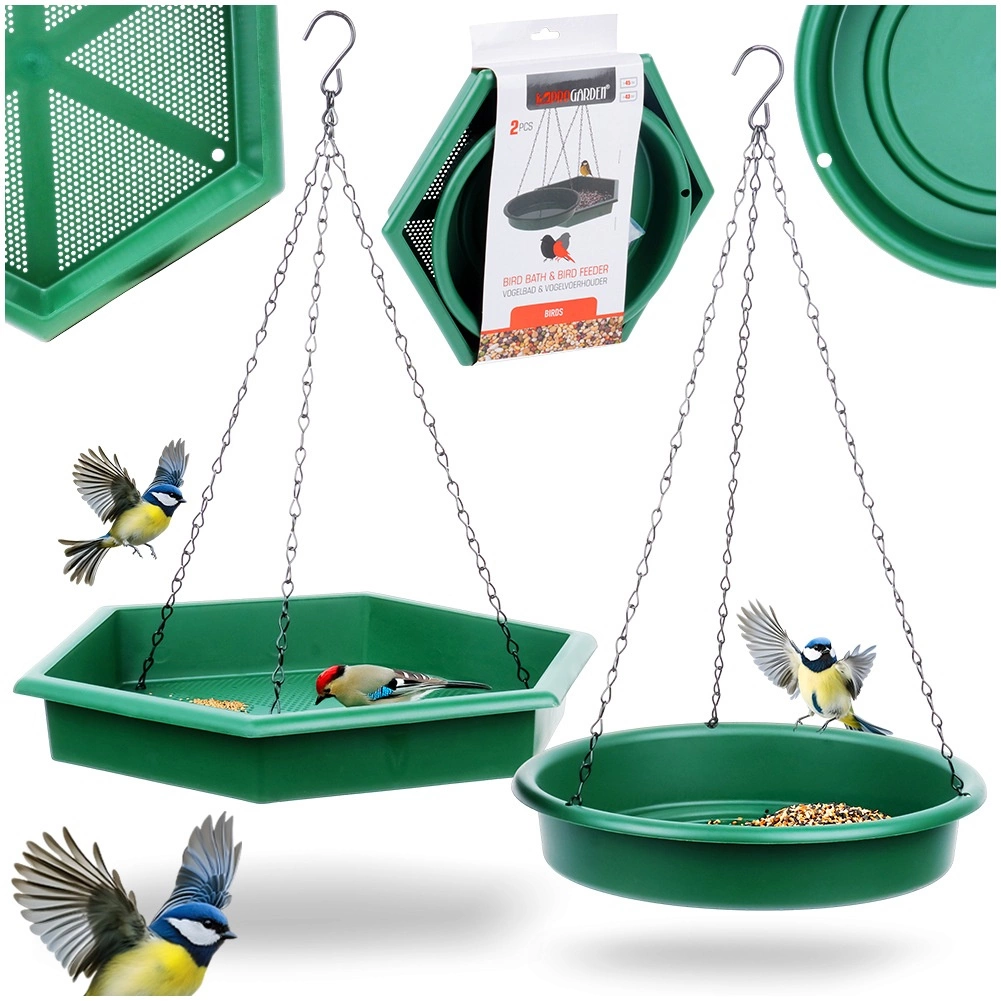 Sada 2v1 kombinuje prostorné krmítko (cca 32 × 28 cm) s perforovaným dnem pro odtok vody a kulaté pítko (průměr cca 25 cm) pro čerstvou vodu. Oba podnosy zavěsíte během chvilky na větev, balkon či zahradní hák. Odolný plast a pevné kovové řetízky zaručují dlouhou životnost a stabilitu i v proměnlivém počasí.