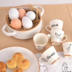 Odolná keramika v bílé barvě s hnědým lemem a kropeným povrchem se krásně vyjímá na každém stole.