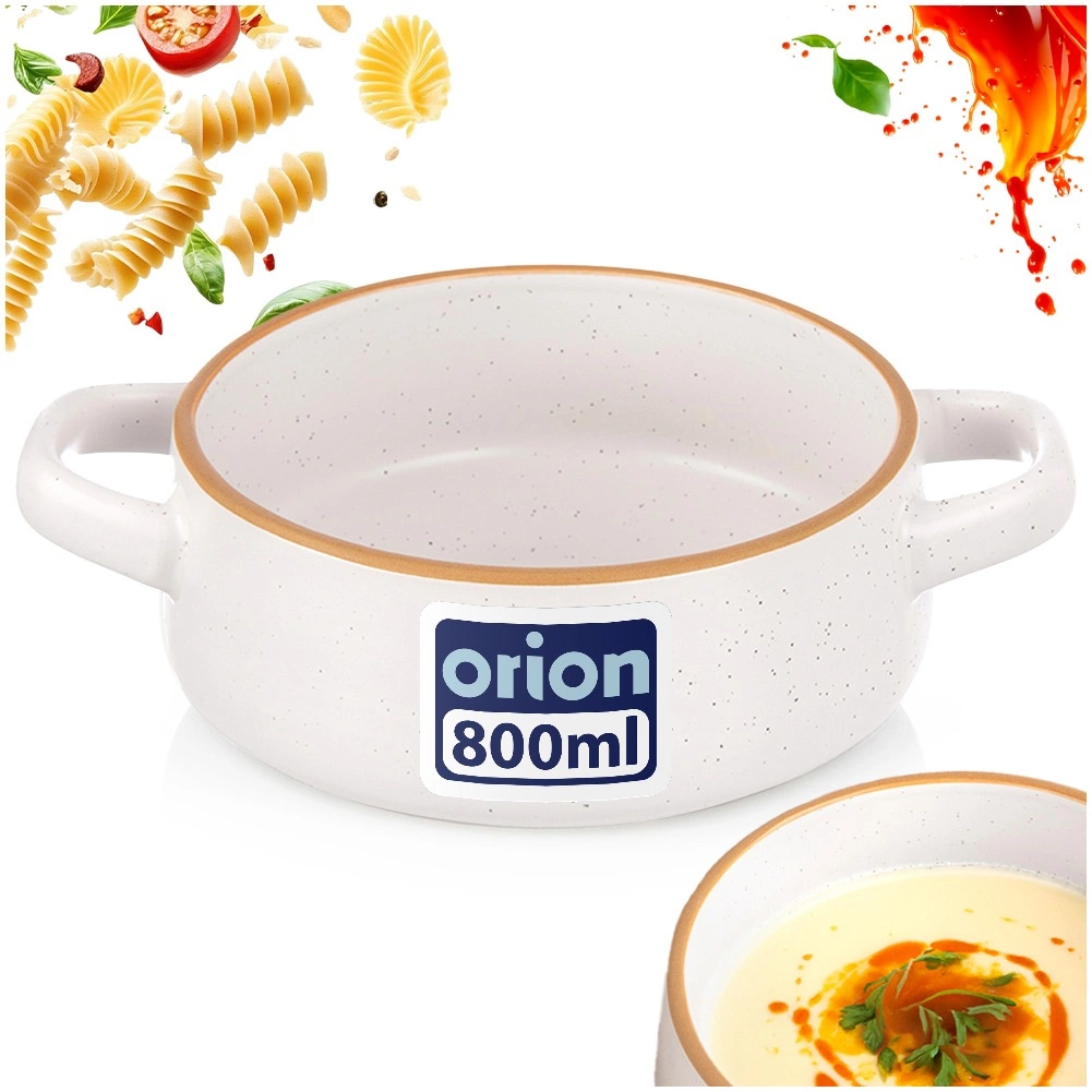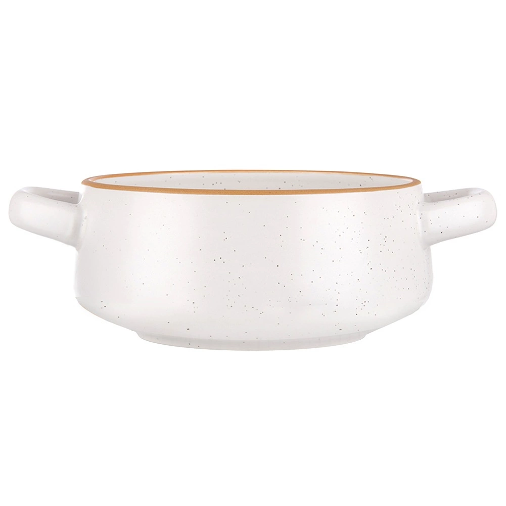 Praktická keramická miska na polévku o objemu 800 ml s bočními uchy pro bezpečné přenášení a servírování. V elegantním bílém provedení s hnědým lemem a jemným kropením se skvěle hodí na polévky, vývary i krémy, ale také na snídaňové cereálie, jogurt, ovoce či saláty. Je vhodná do myčky nádobí i mikrovlnné trouby a díky pevnému keramickému zpracování se snadno udržuje.