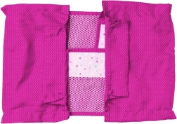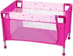Růžová postýlka s kovovým rámem je ideální pro hraní doma i venku. Je přenosná a lehká.