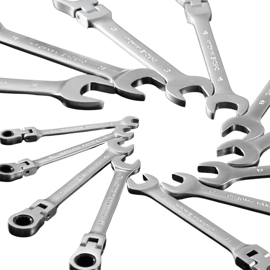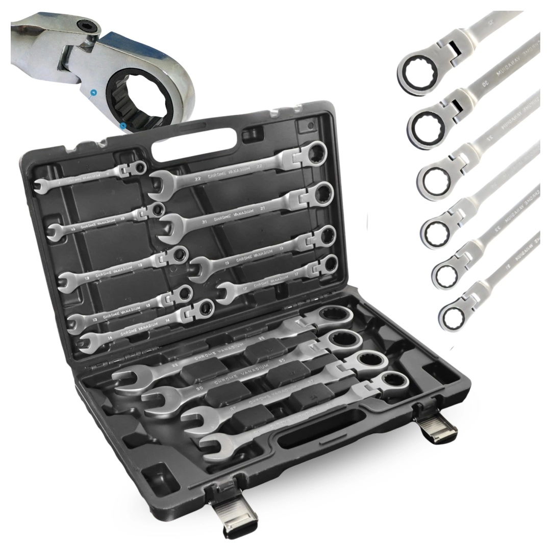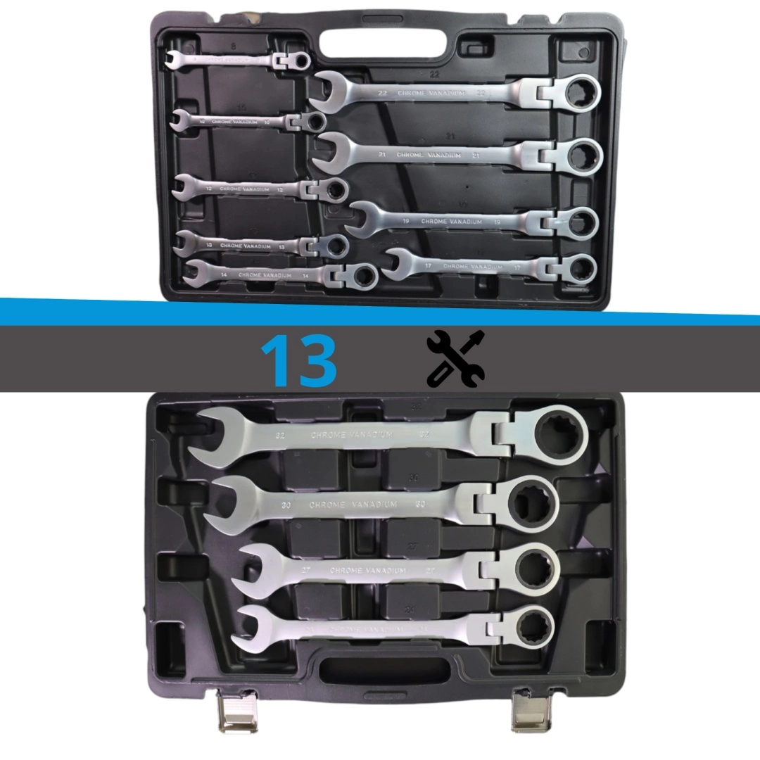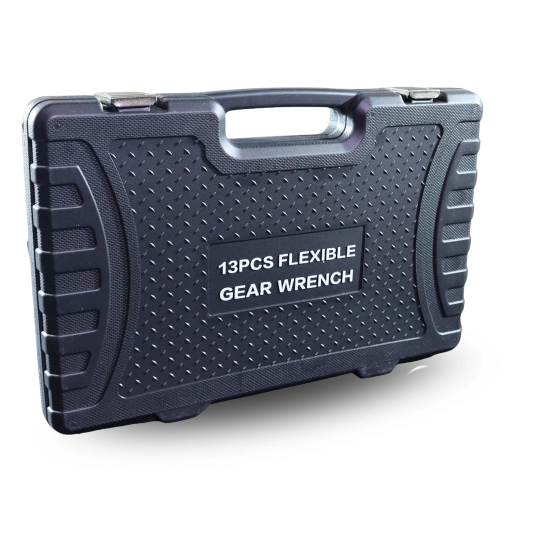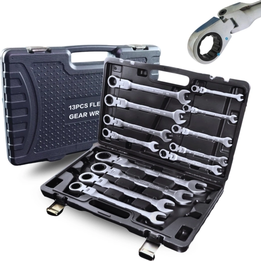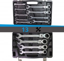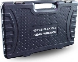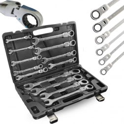 Profesionální sada 13 flexibilních ráčnových klíčů pro rychlé utahování a povolování šroubů i v těsných prostorech. Otočné kloubové hlavy, jemný ráčnový mechanismus a odolná chrom‑vanadiová ocel (CrV) zajišťují dlouhou životnost, přesnost a pohodlnou práci. Součástí je pevný plastový kufr pro bezpečné uložení a přenos.