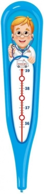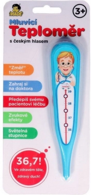 Světelná stupnice vám napoví, jak na tom plyšák je, a český hlas vám poradí, co dělat, stačí jen stisknout hrot teploměru. Teploměr je vyroben z plastu, má modro-bílou barvu a motiv veselého doktora. Rozvíjí fantazii a kreativitu vašich nejmenších, kteří si tak se zvířátky, sourozenci nebo s kamarády mohou hrát na doktora.