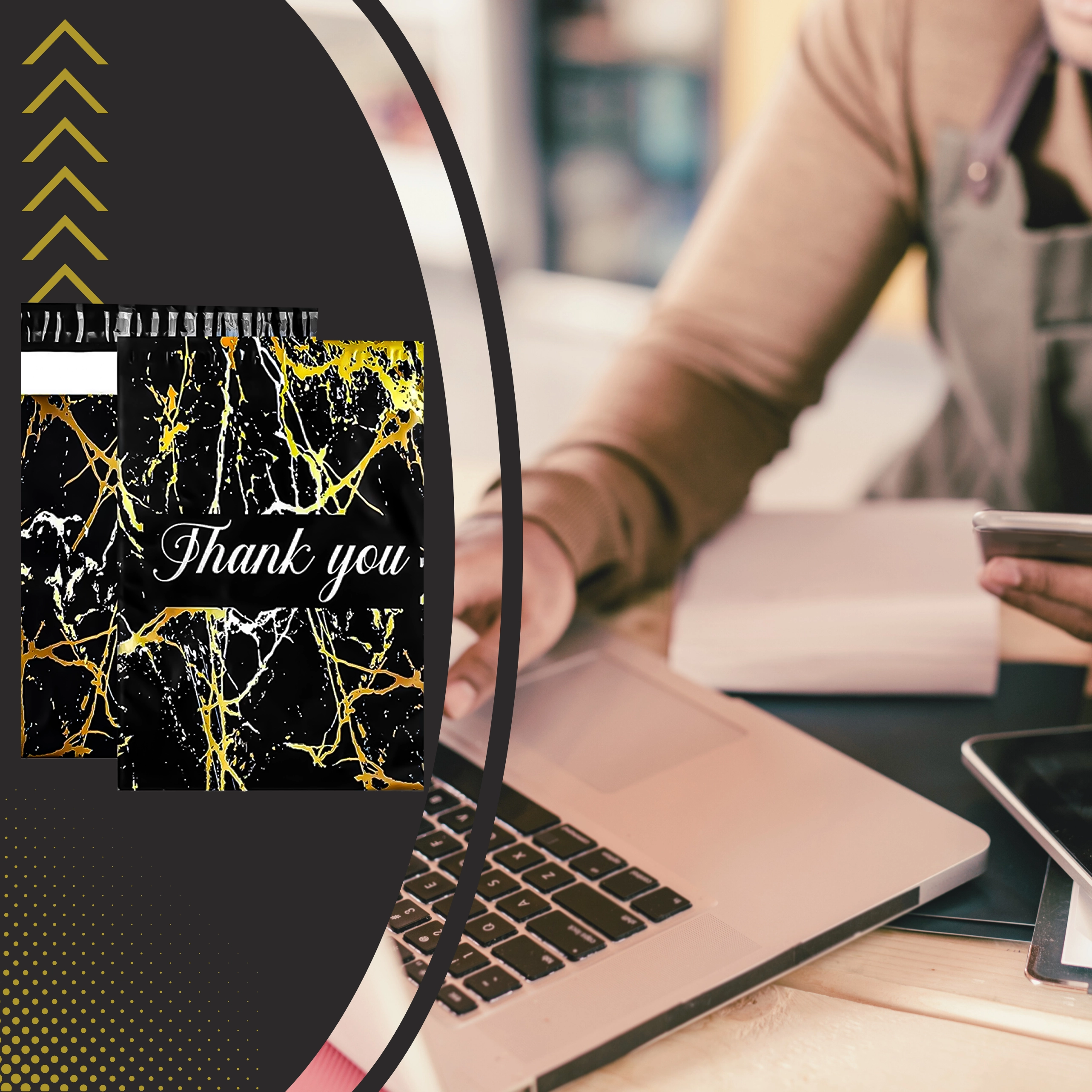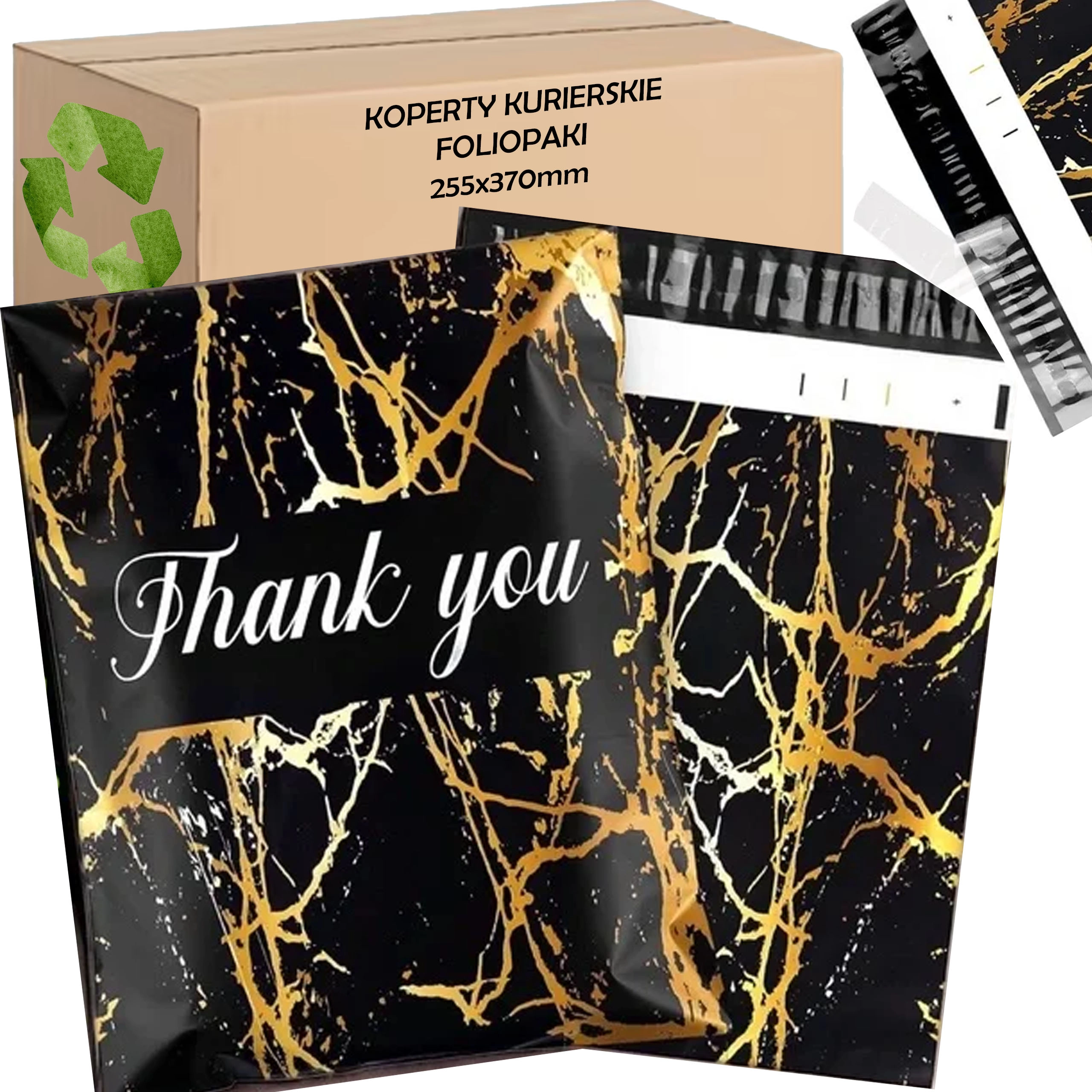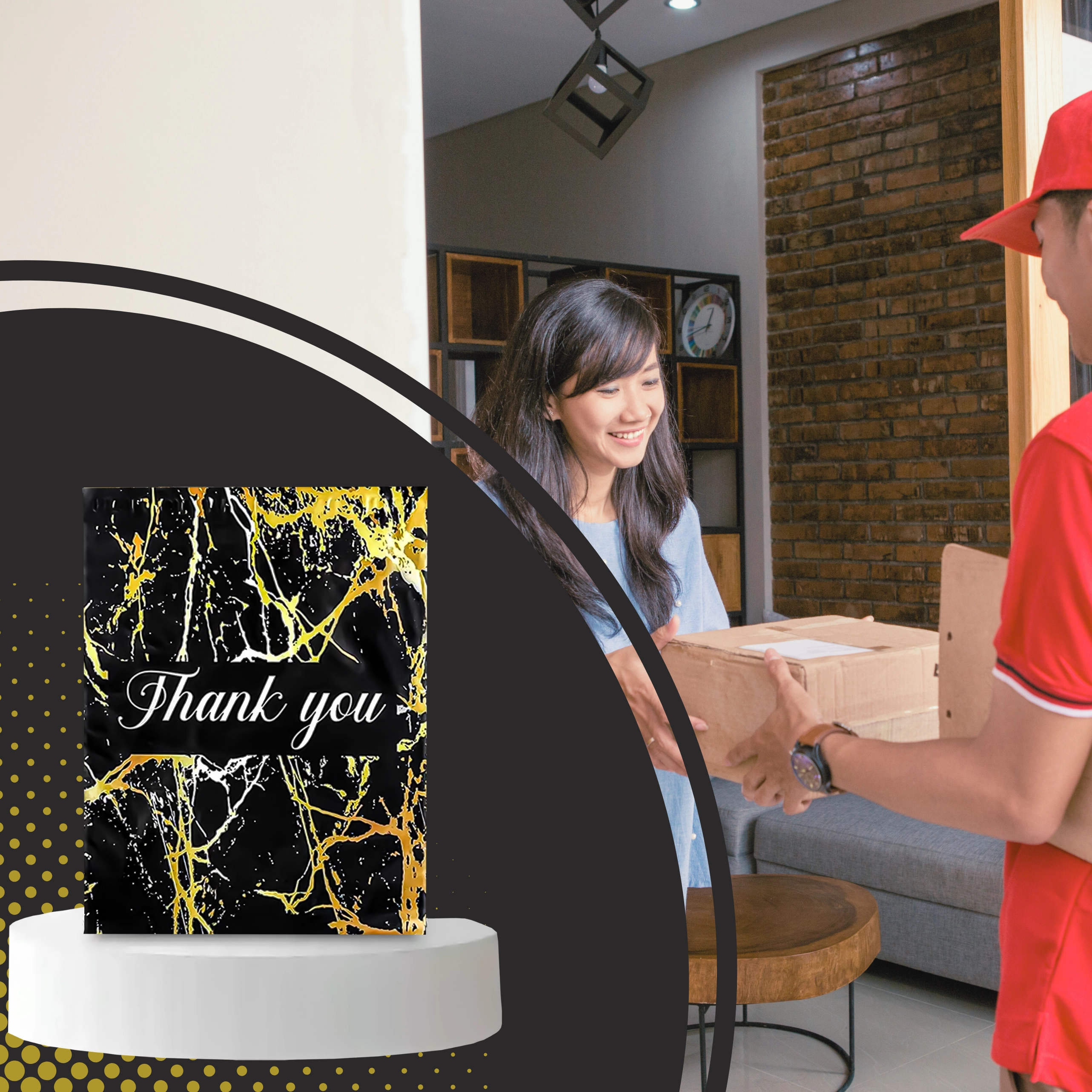Hledáte spolehlivé obalové řešení pro své zásilky? Tyto kurýrní foliopaky kombinují odolnost, bezpečnost a profesionální vzhled. Matně černý povrch s motivem zlatého mramoru a poděkováním Thank You působí reprezentativně a posiluje zážitek z nákupu.