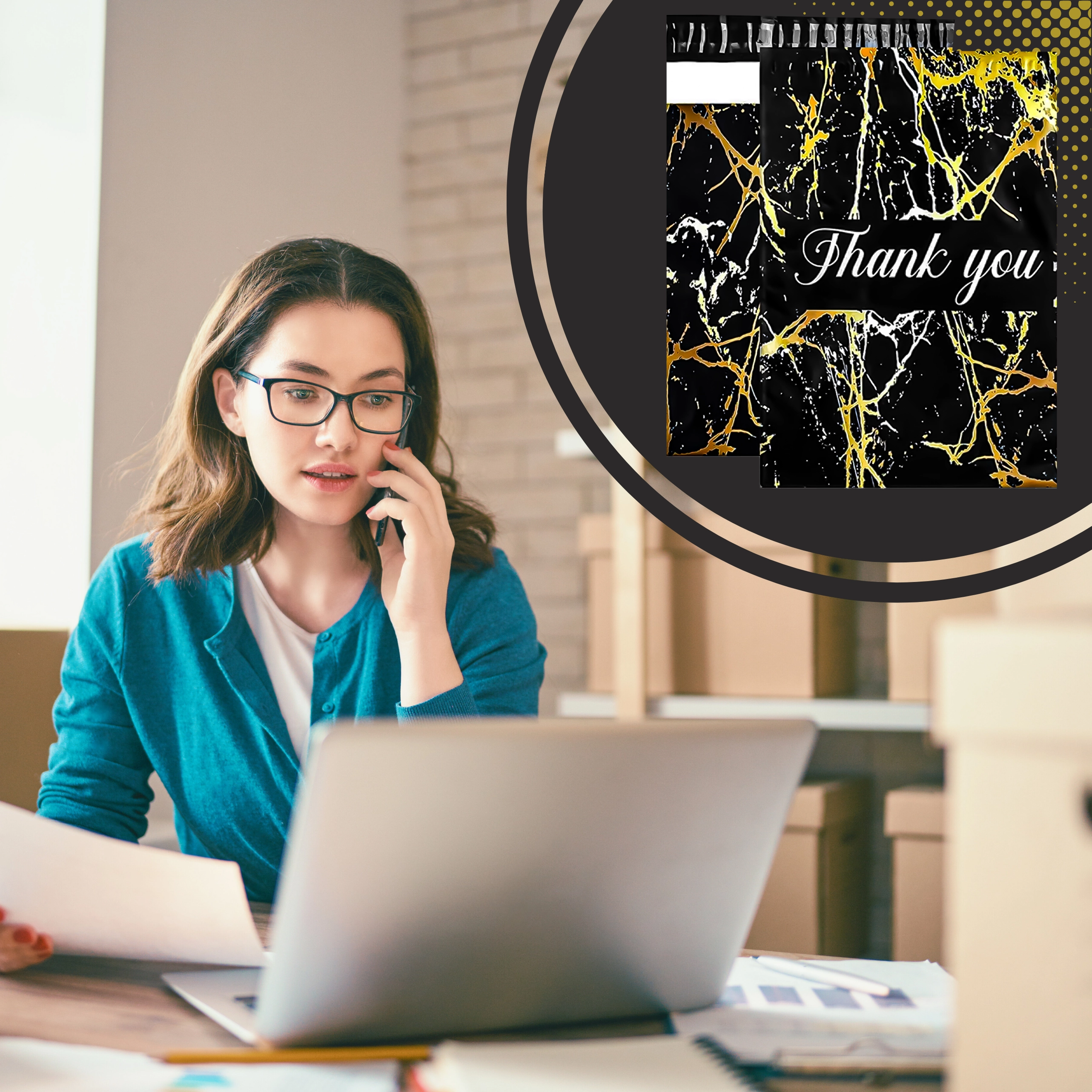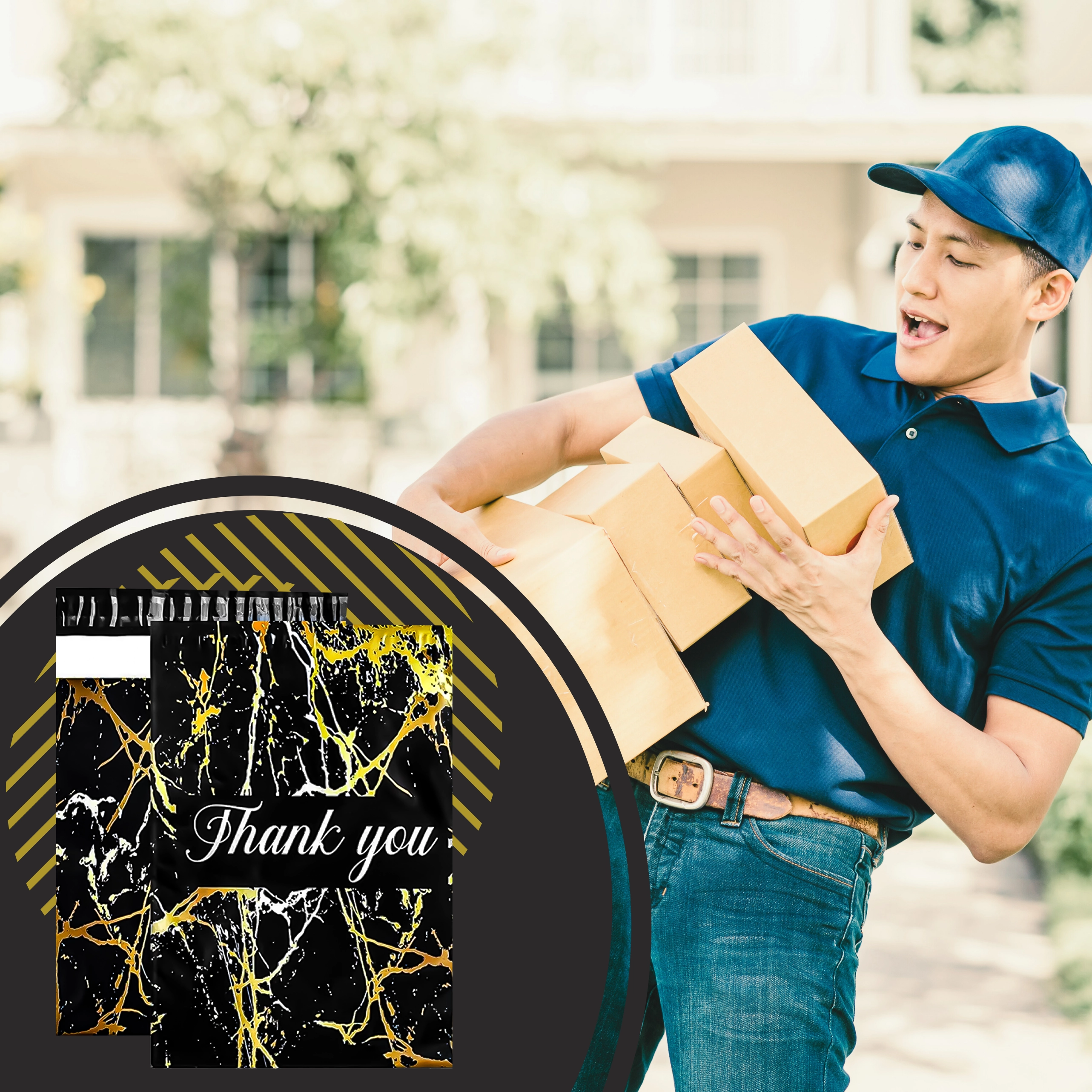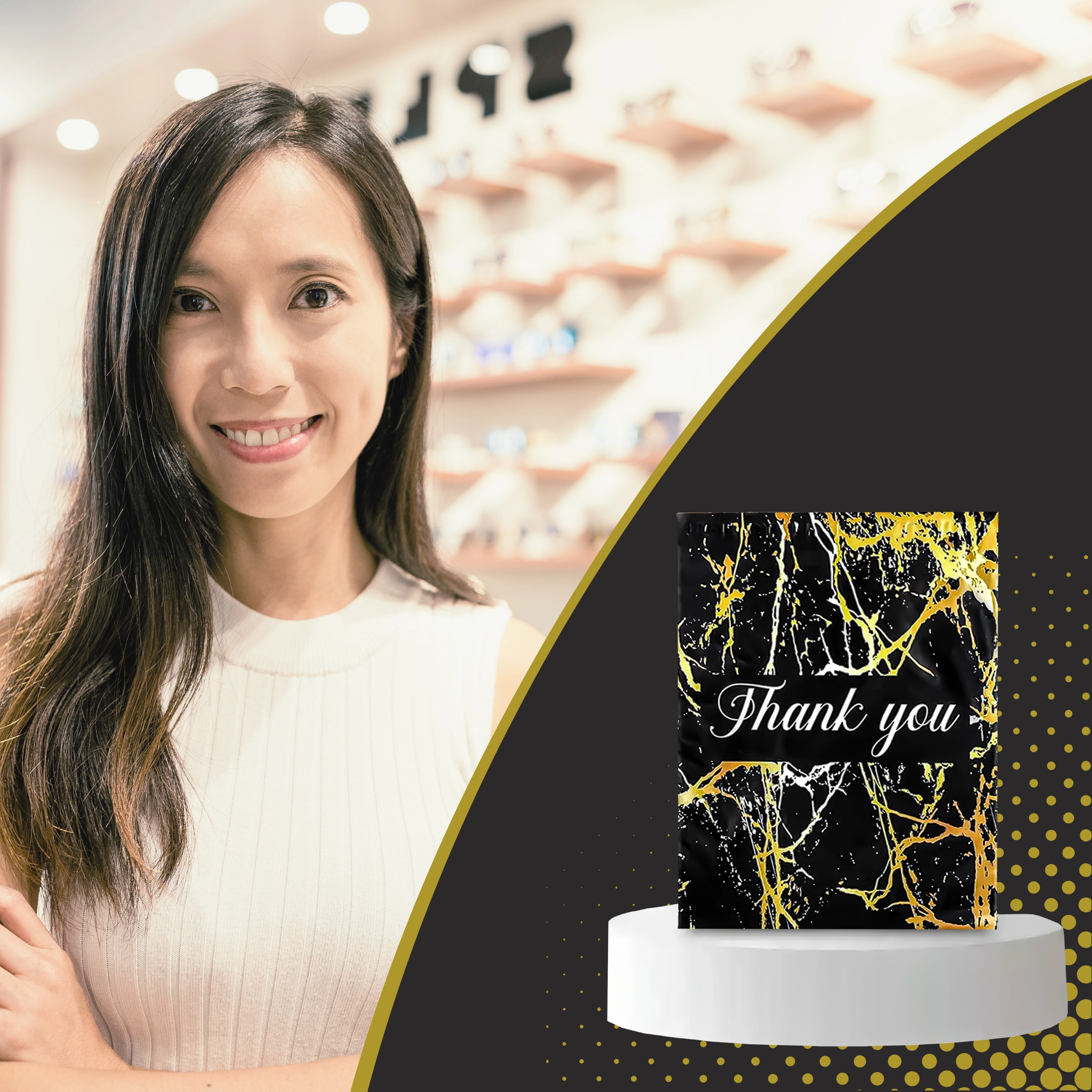 Hledáte spolehlivé obalové řešení pro své zásilky? Tyto kurýrní foliopaky kombinují odolnost, bezpečnost a profesionální vzhled. Matně černý povrch s motivem zlatého mramoru a poděkováním Thank You působí reprezentativně a posiluje zážitek z nákupu.