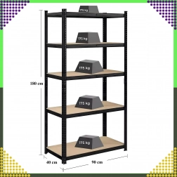 Tento pevný regál s ocelovým rámem a pěti policemi je ideální pro garáže, dílny, sklady i sklepy. Díky nosnosti 175 kg na polici bezpečně uložíte těžké předměty, zatímco kompaktní půdorys 90 × 40 cm šetří místo. Černé provedení působí moderně a snadno zapadne do každého prostředí.