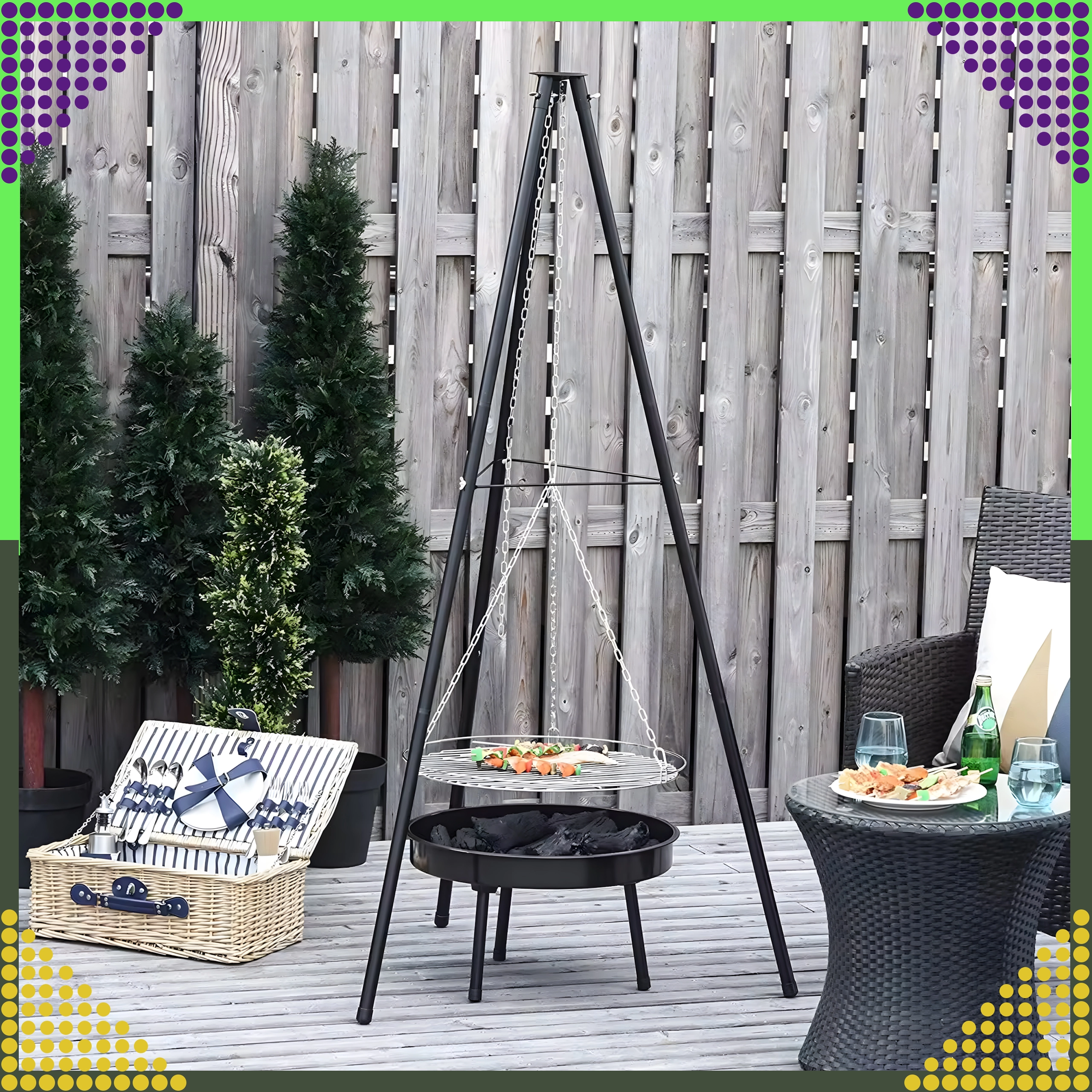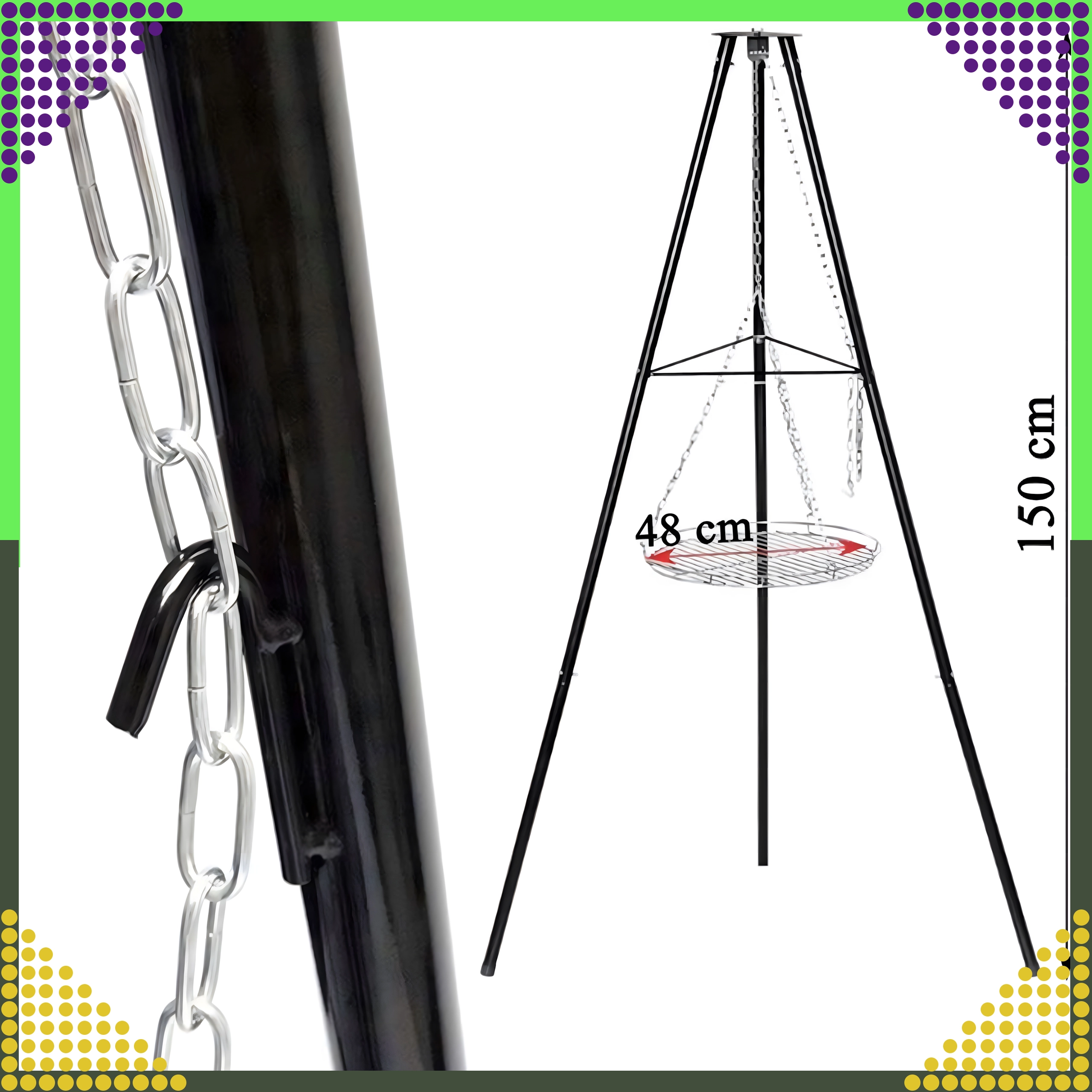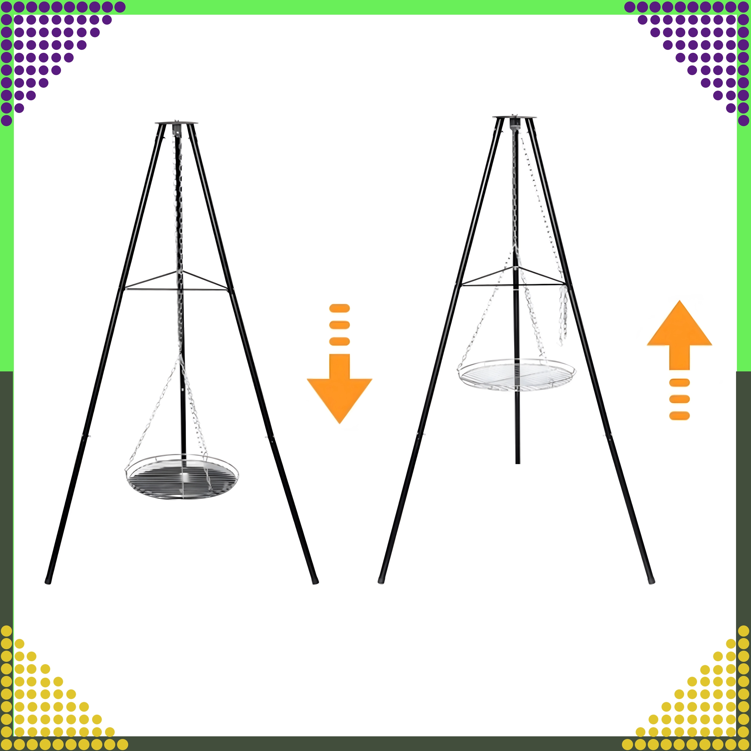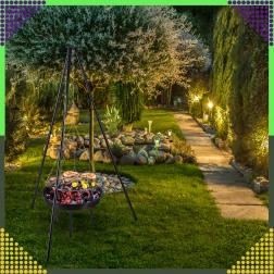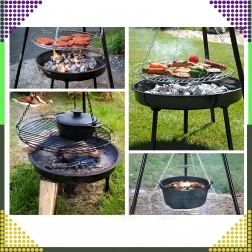 Tento elegantní a odolný zahradní trojnožkový gril je skvělým řešením pro všechny, kteří chtějí grilovat nad otevřeným ohněm, ale nemají stálé místo pro ohniště. Výškově nastavitelný rošt (Ø 50 cm) se zavěšením na řetězech umožňuje přesnou kontrolu teploty a rovnoměrné propečení masa i zeleniny. Stabilní třínohá konstrukce z práškově lakované oceli je odolná vůči vysokým teplotám a snadno se udržuje.