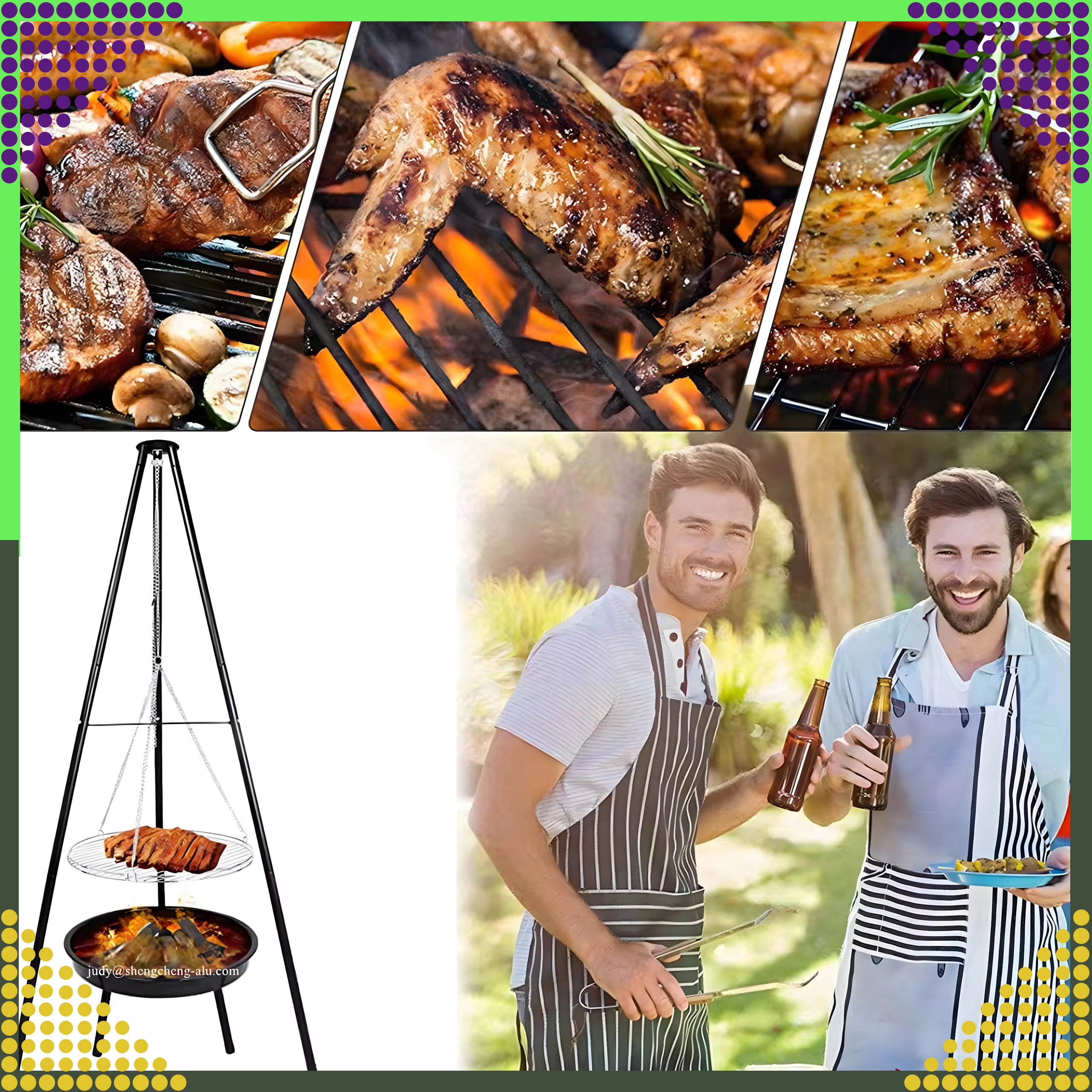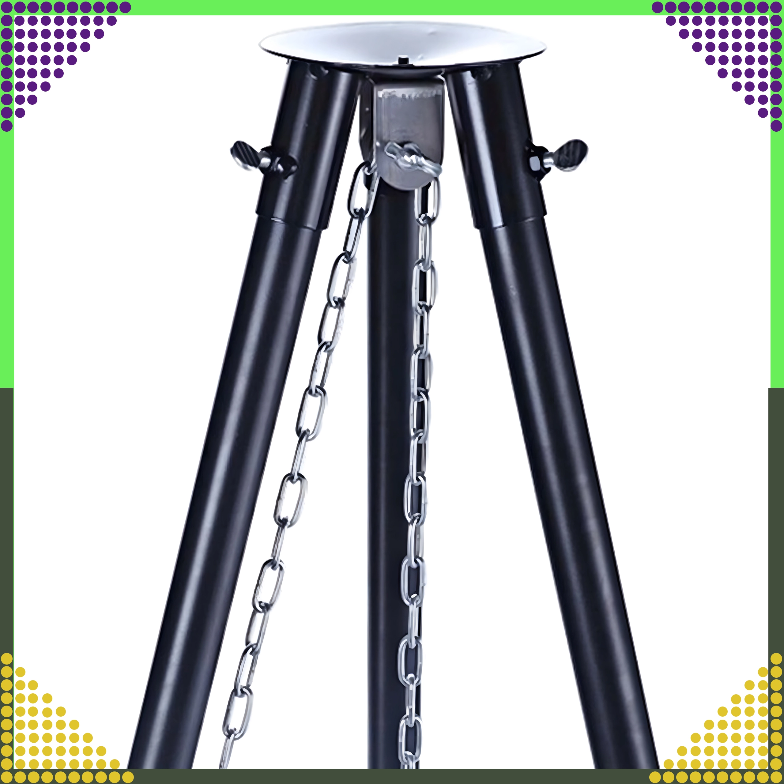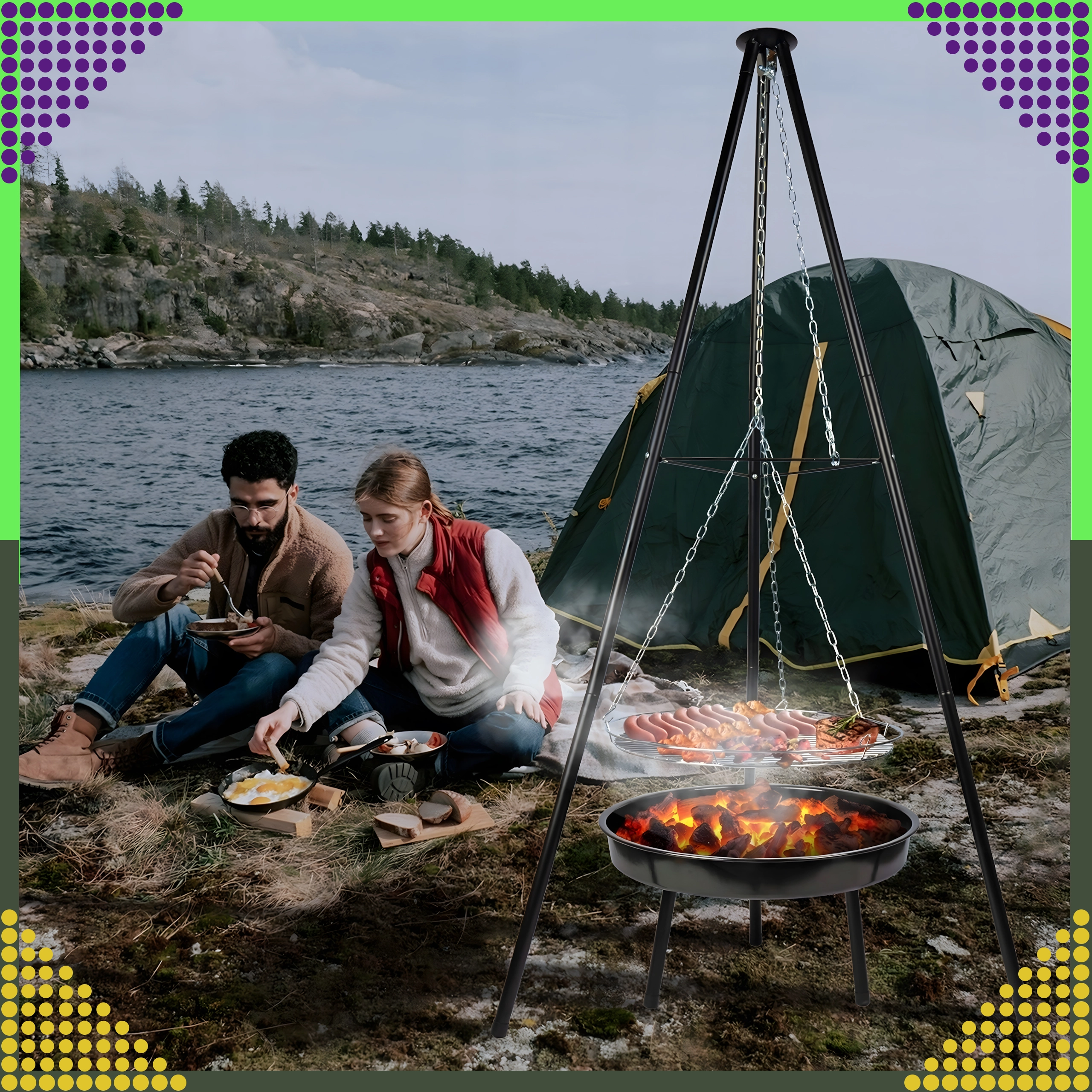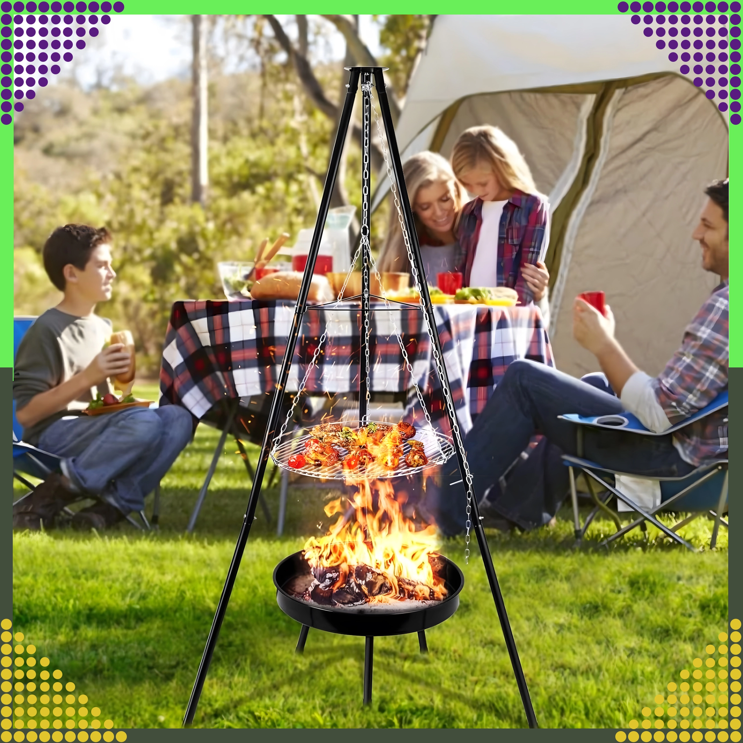 Tento elegantní a odolný zahradní trojnožkový gril je skvělým řešením pro všechny, kteří chtějí grilovat nad otevřeným ohněm, ale nemají stálé místo pro ohniště. Výškově nastavitelný rošt (Ø 50 cm) se zavěšením na řetězech umožňuje přesnou kontrolu teploty a rovnoměrné propečení masa i zeleniny. Stabilní třínohá konstrukce z práškově lakované oceli je odolná vůči vysokým teplotám a snadno se udržuje.