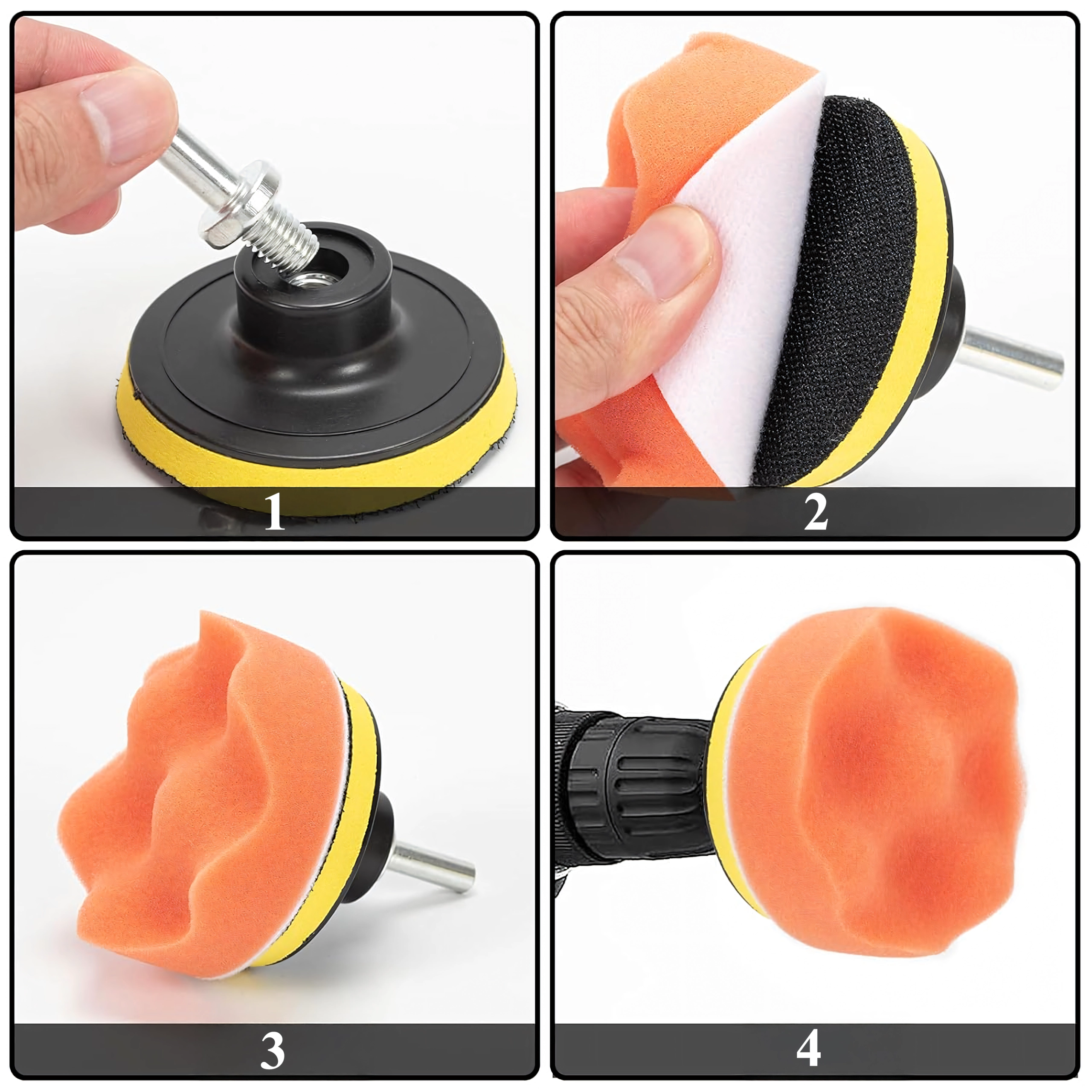Dodávaný kovový adaptér a unašeč se suchým zipem umožní nasadit pad během chvilky a bezpečně pracovat s běžnou vrtačkou či AKU šroubovákem.