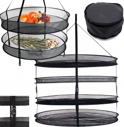 Praktická závěsná sušička s průměrem 60 cm a čtyřmi patry nabízí efektivní a šetrné sušení hub, bylinek, ovoce, zeleniny i ryb. Díky prodyšné síťovině a vertikálnímu designu cirkuluje vzduch rovnoměrně a potraviny si zachovají více cenných živin. Konstrukce je skládací, lehká a snadno přenosná – ideální do bytu, na balkon i do dílny.