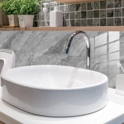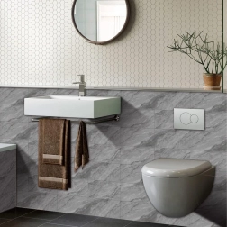 Šedé mramorové žilkování dodá stěnám elegantní a nadčasový charakter bez nákladné obkladačské práce.