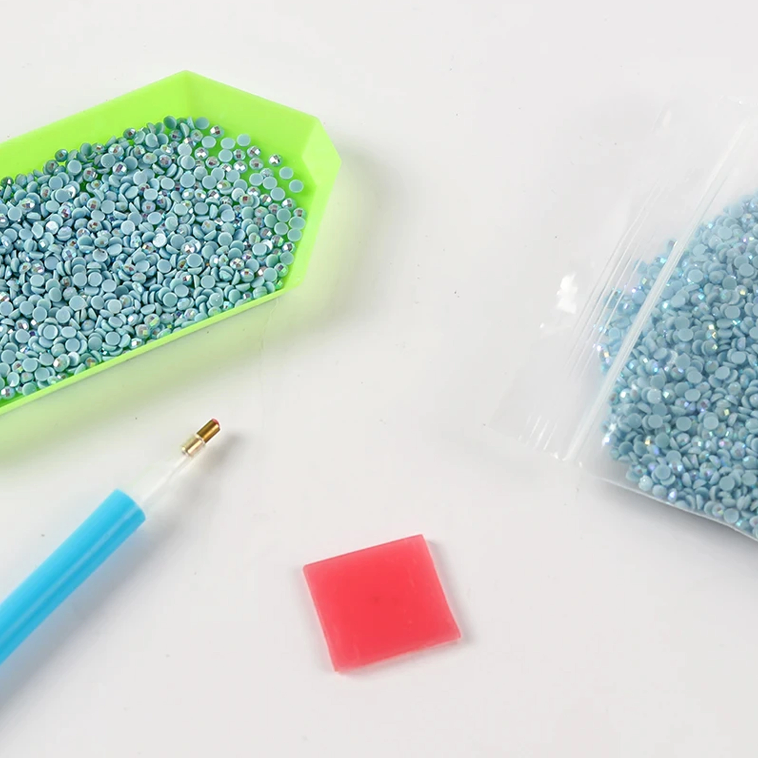 - Figurka – základ, speciální lepidlo, aplikátor/pero, tácek, sada diamantových kamínků
