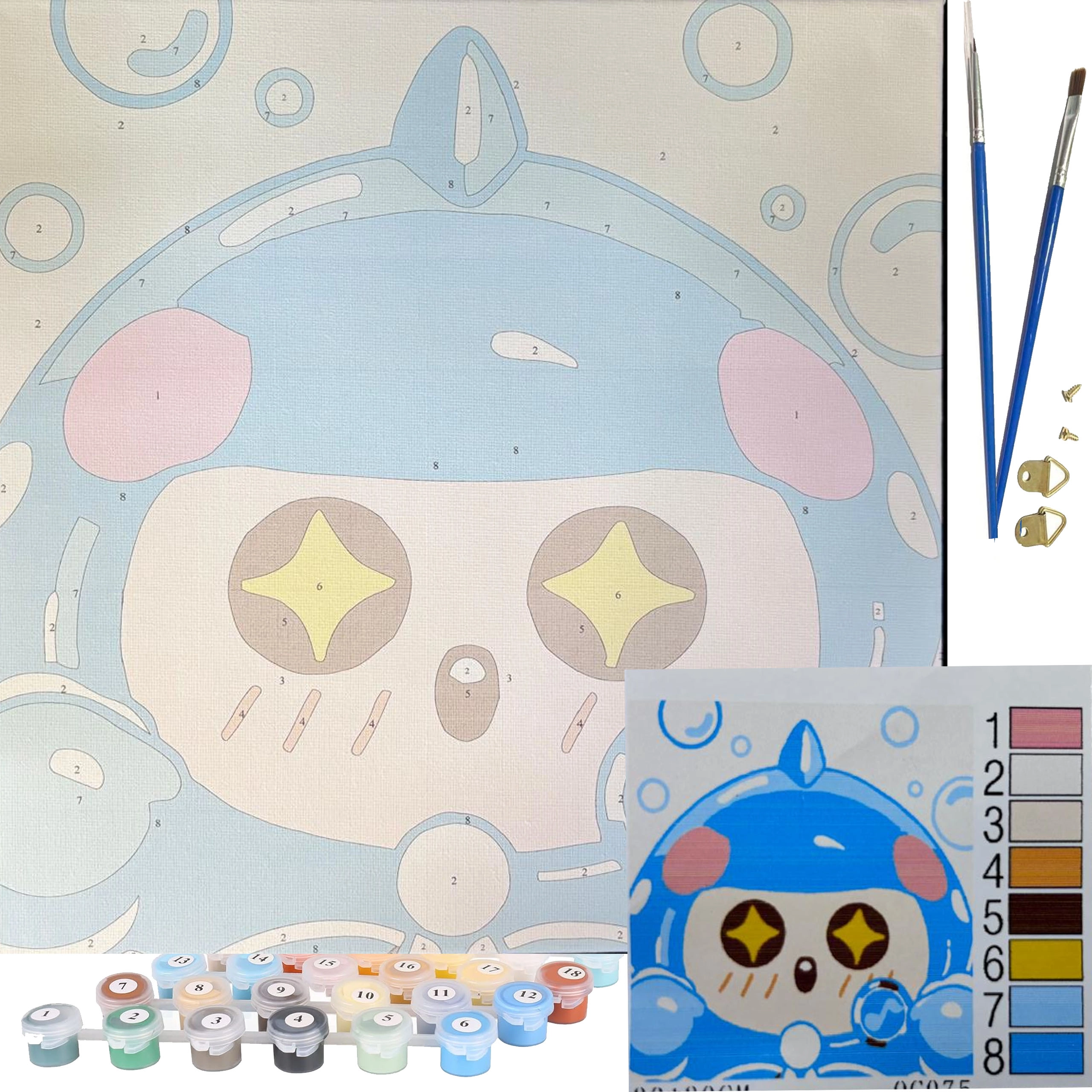 - Plátno na rámu, očíslované akrylové barvy, štětce, závěsné příslušenství