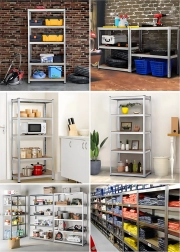 Univerzální kovový regál se stabilní ocelovou konstrukcí a pěti nastavitelnými policemi pro pořádek v garáži, sklepě i dílně. Každá police unese až 175 kg, celková nosnost 875 kg. Bezšroubové sestavení, možnost rozdělit na dva nižší regály a ochranné koncovky proti poškrábání podlahy.
