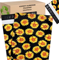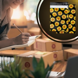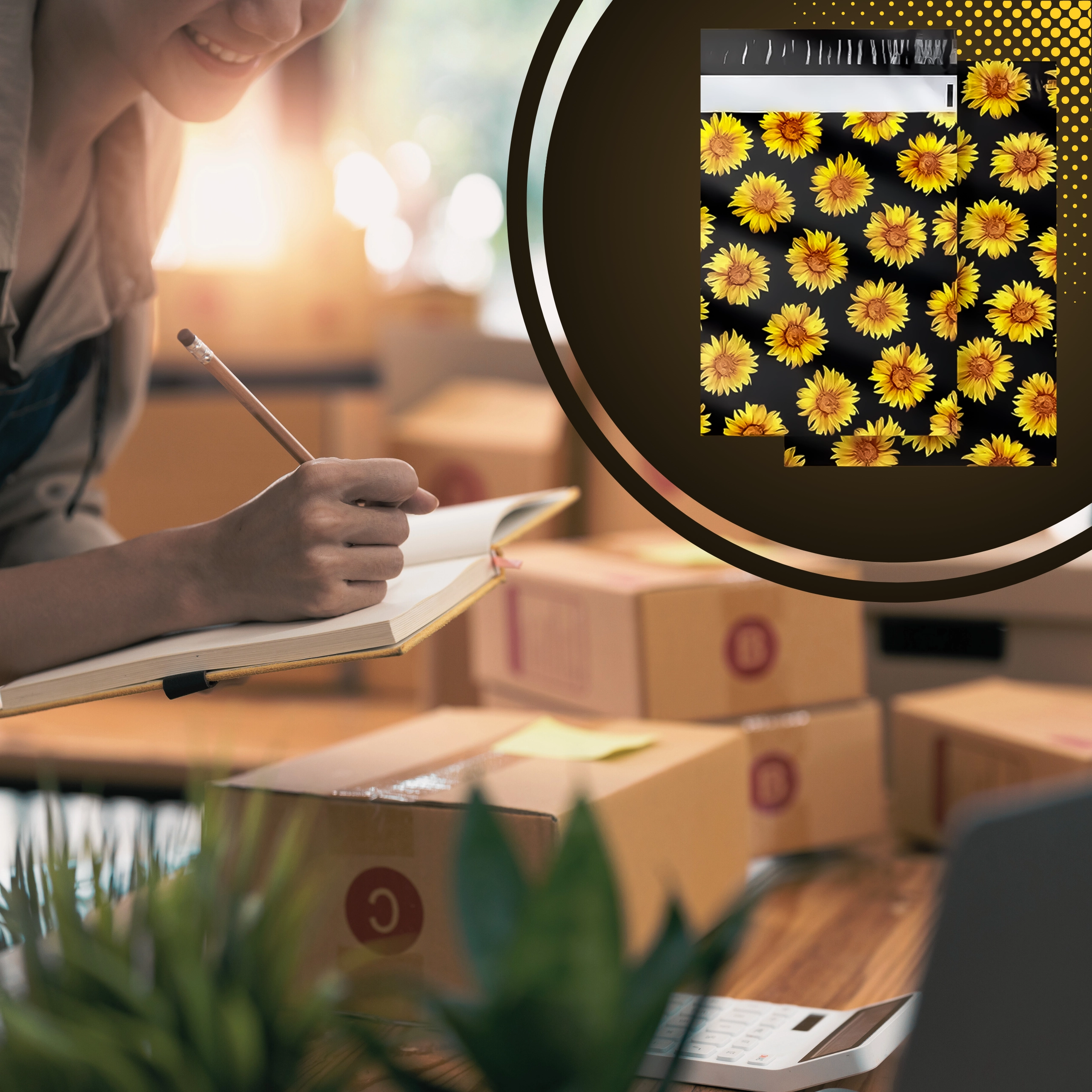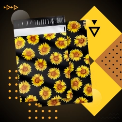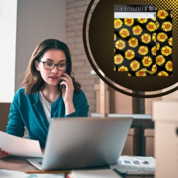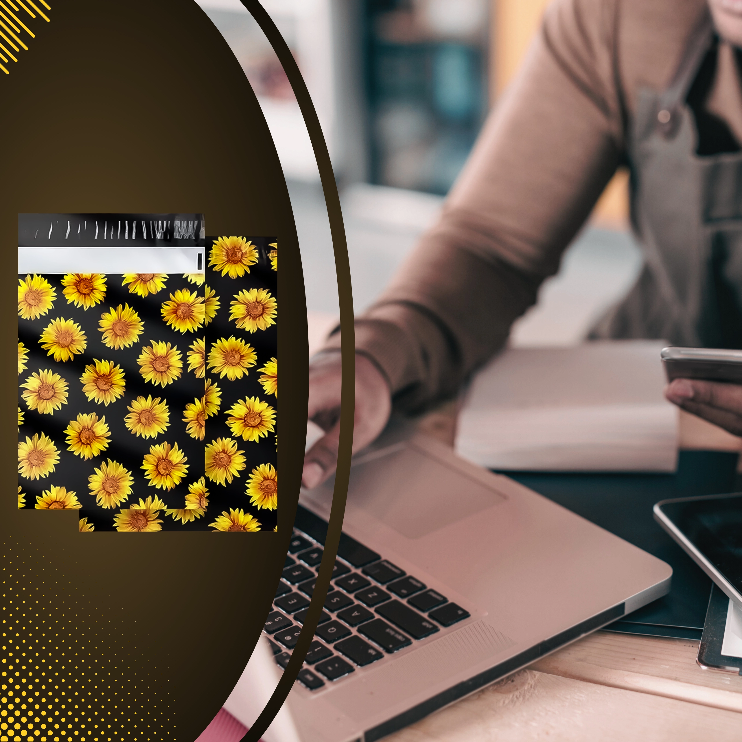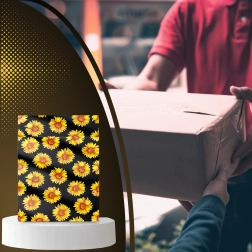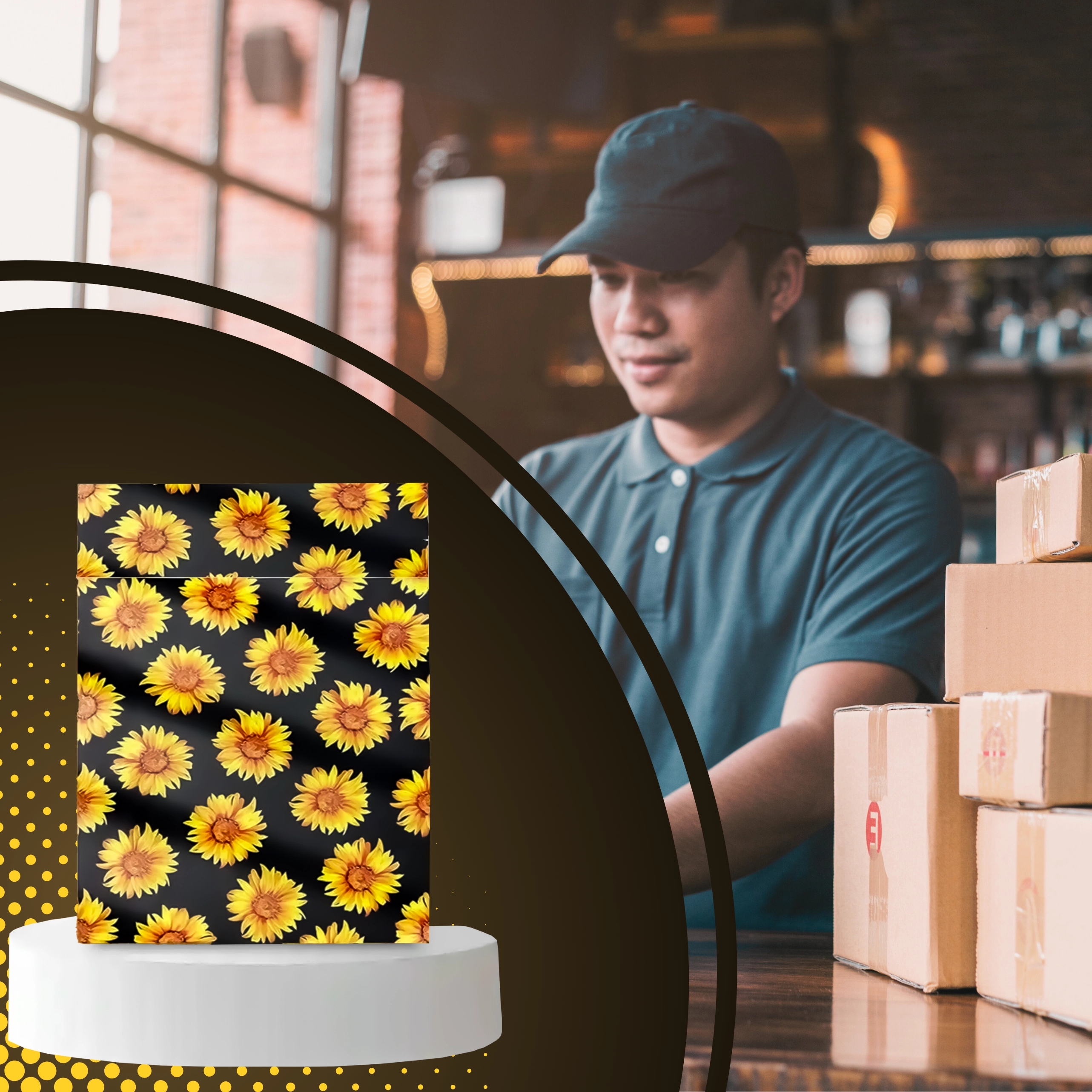 Stylový potisk slunečnic na černém pozadí zlepšuje zákaznický dojem a dělá z každé zásilky malý dárek.