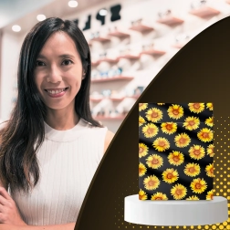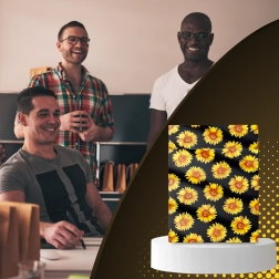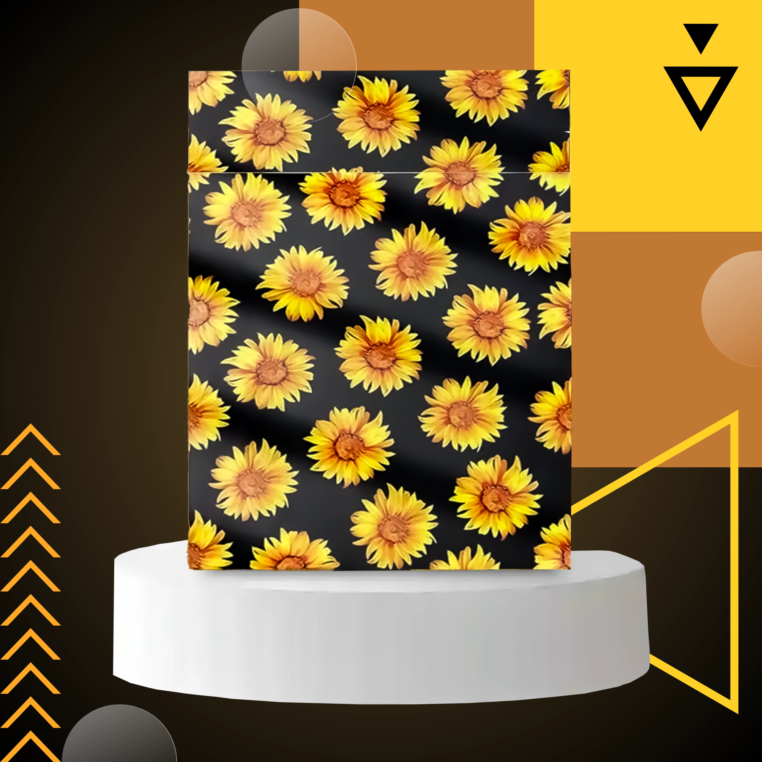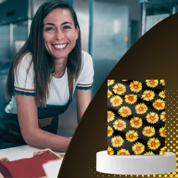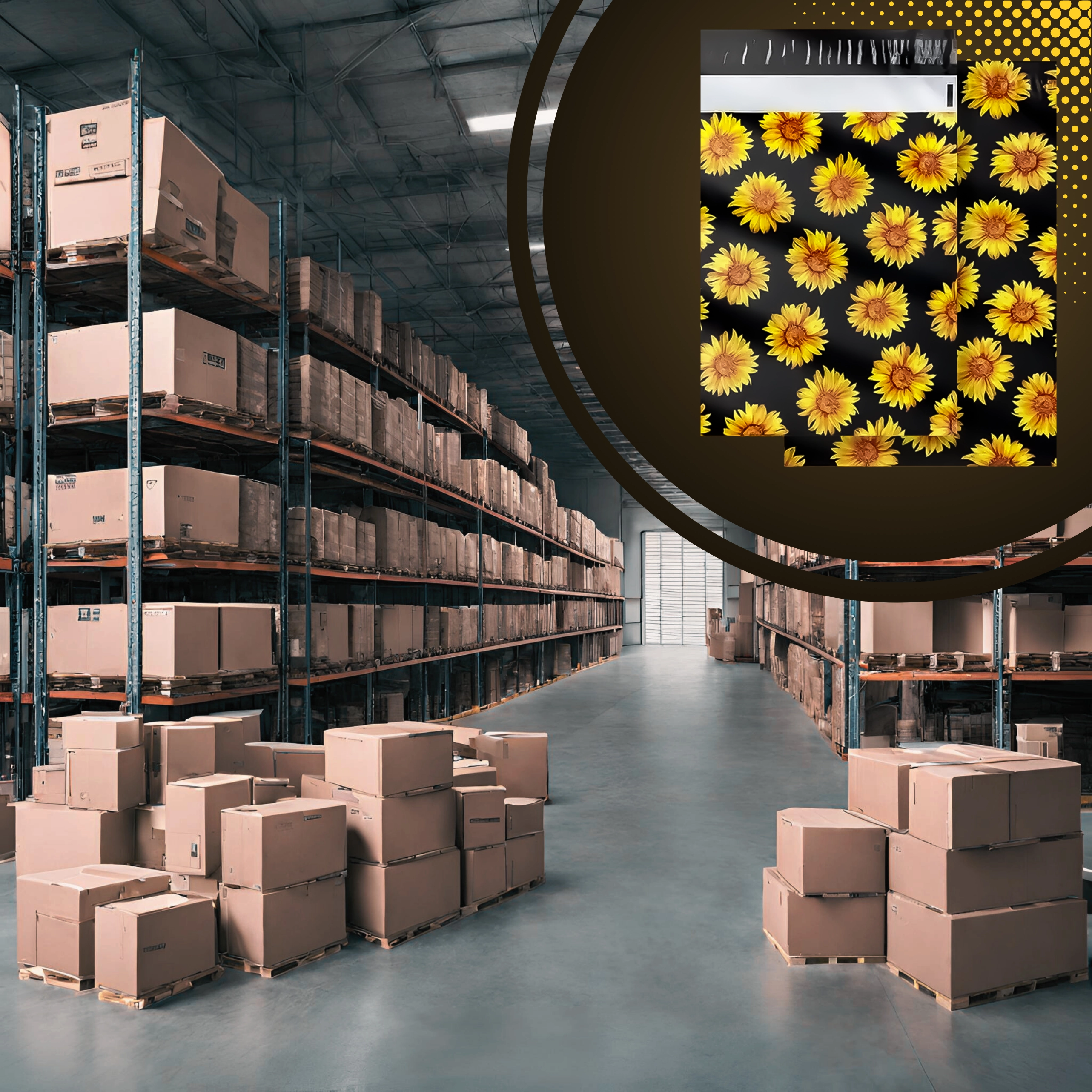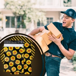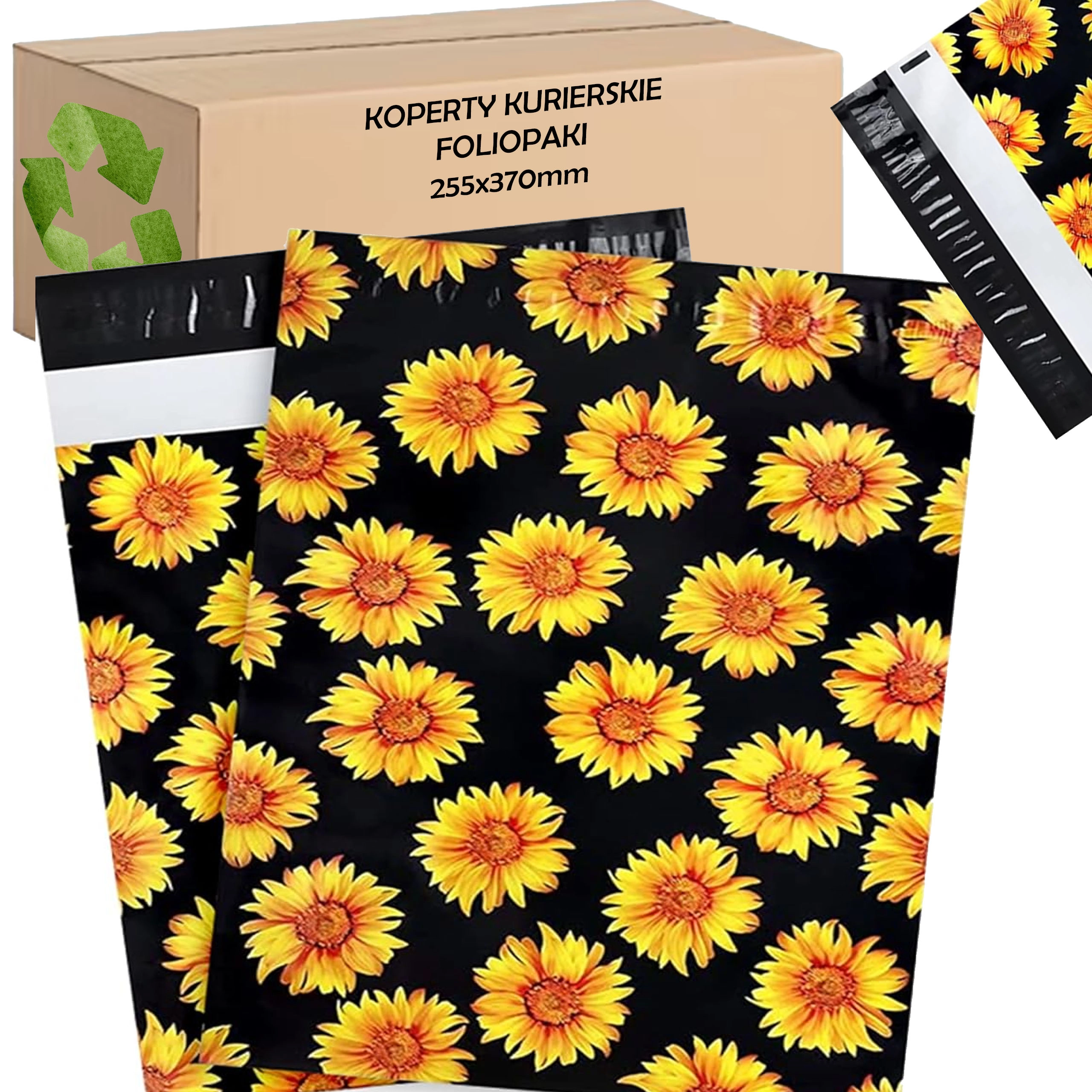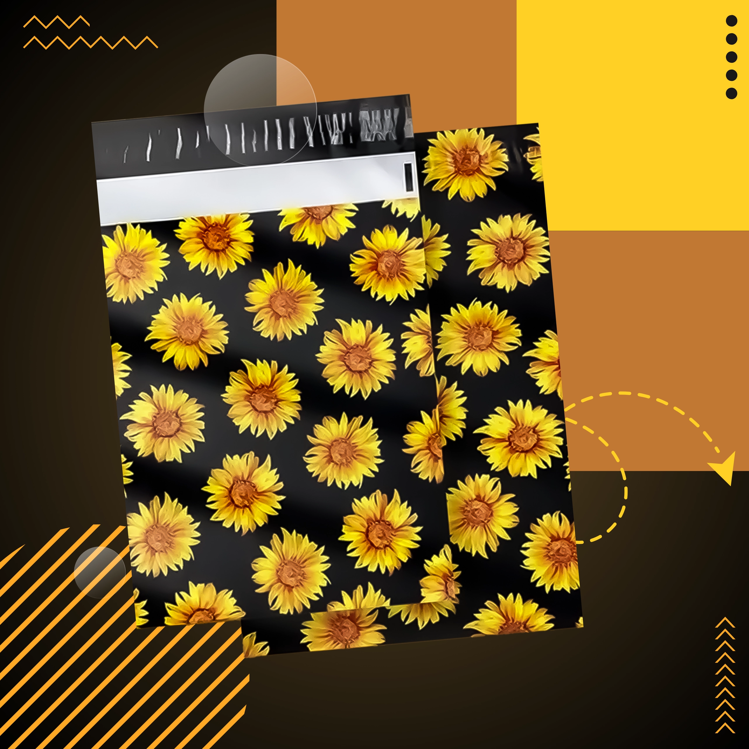 Stylový potisk slunečnic na černém pozadí zlepšuje zákaznický dojem a dělá z každé zásilky malý dárek.