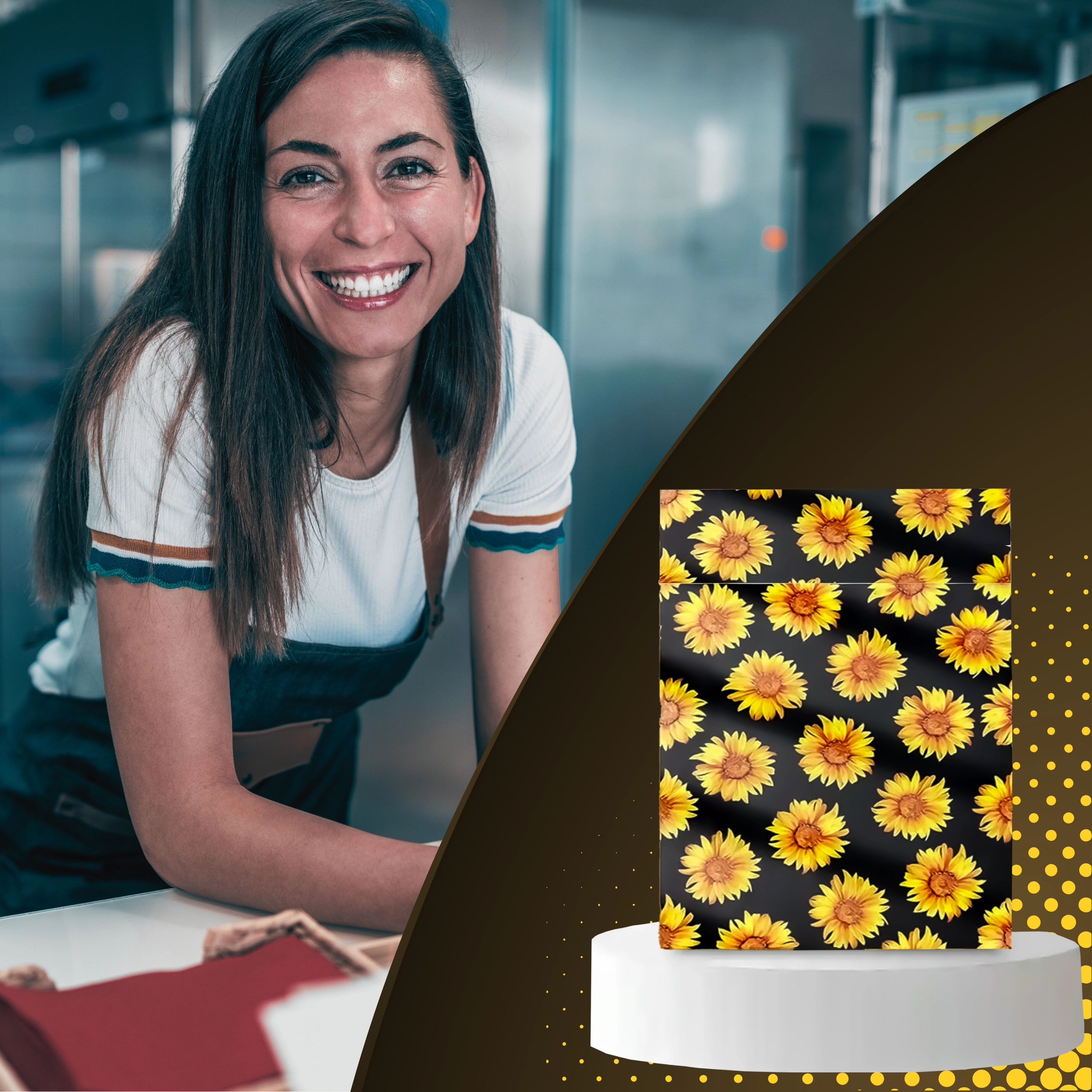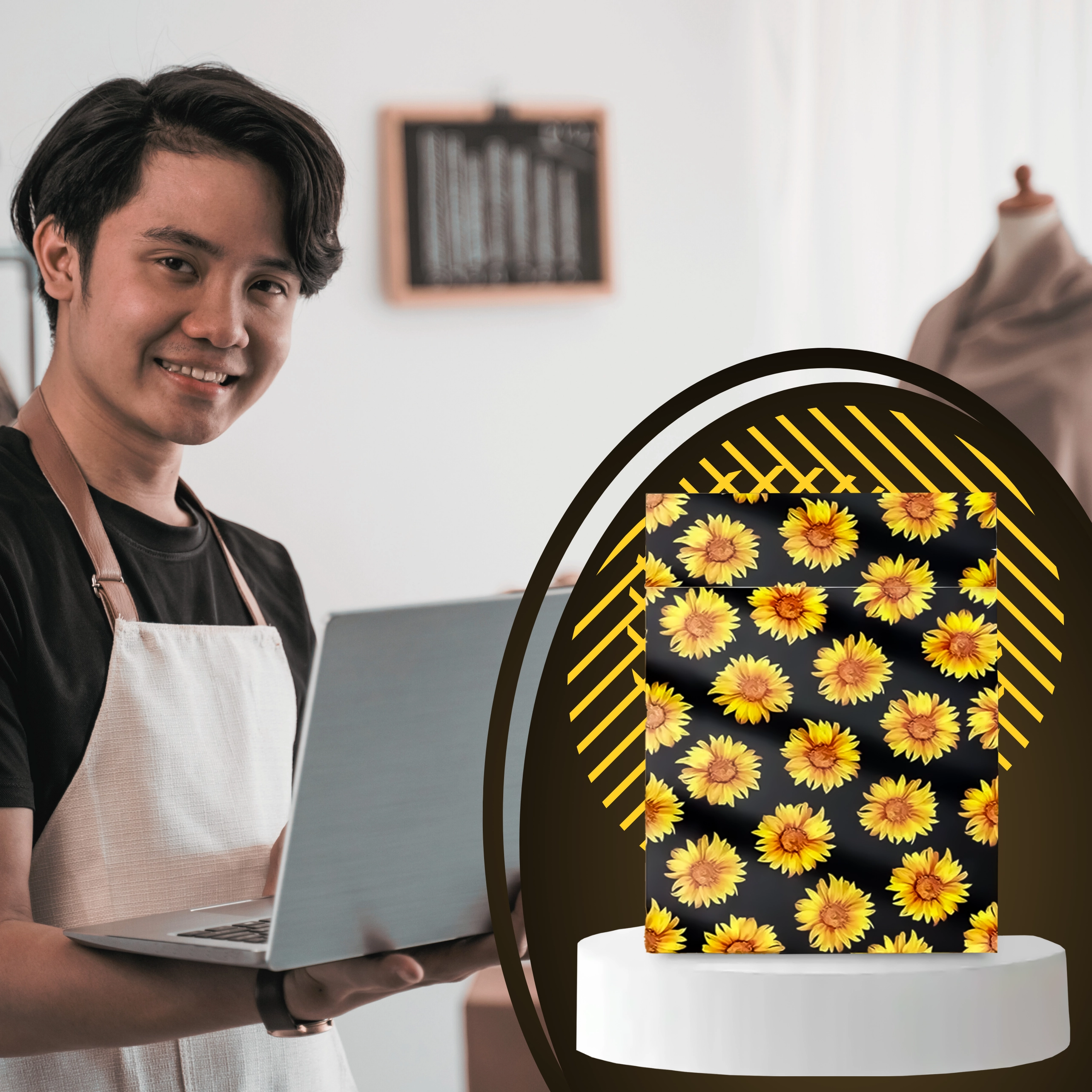 Díky univerzálnímu formátu 255 × 370 mm se skvěle hodí pro textil, doplňky, tiskoviny i drobné dárky. Matně lesklý povrch s motivem slunečnic dodá zásilkám profesionální a zapamatovatelný vzhled.