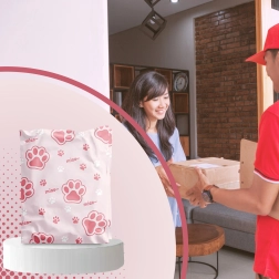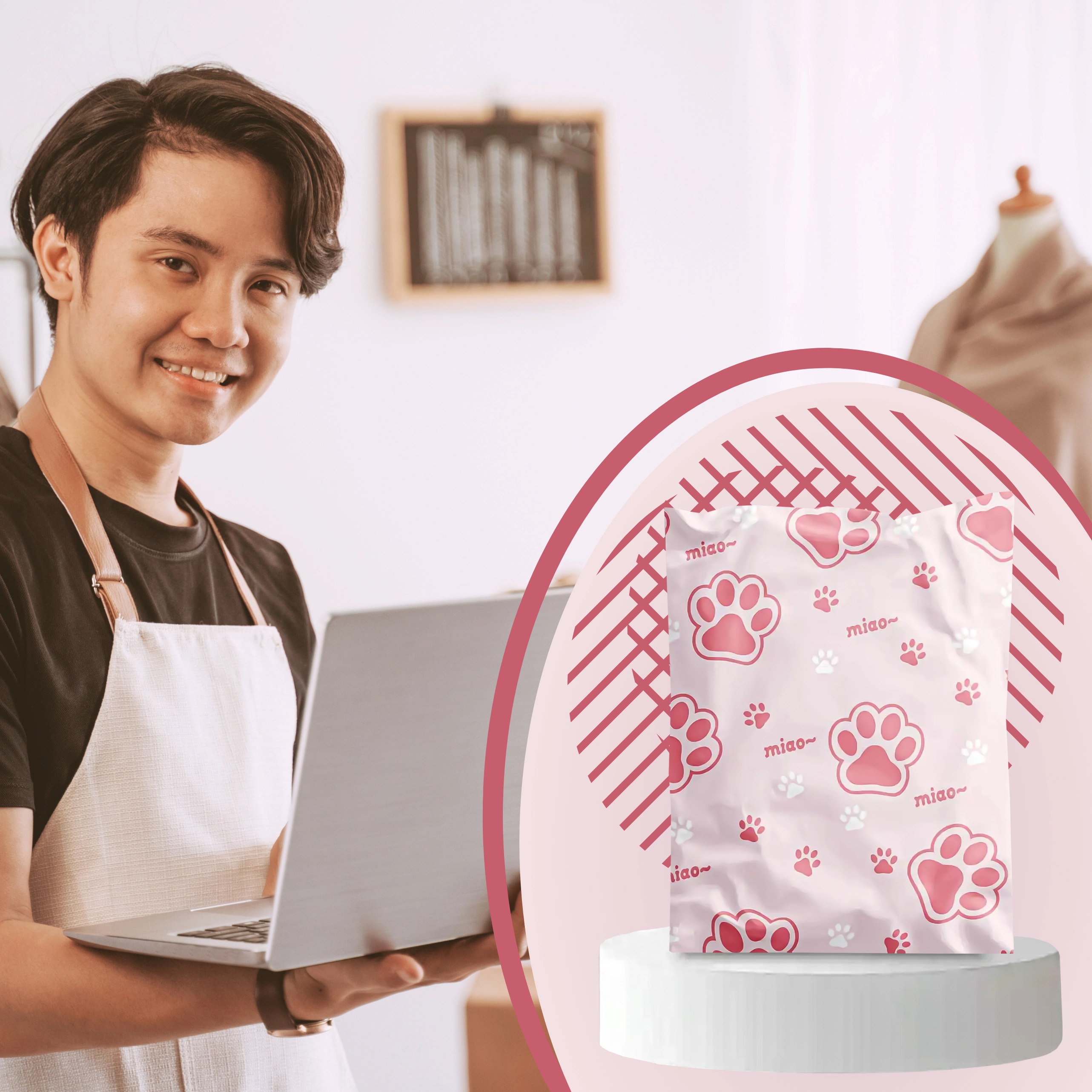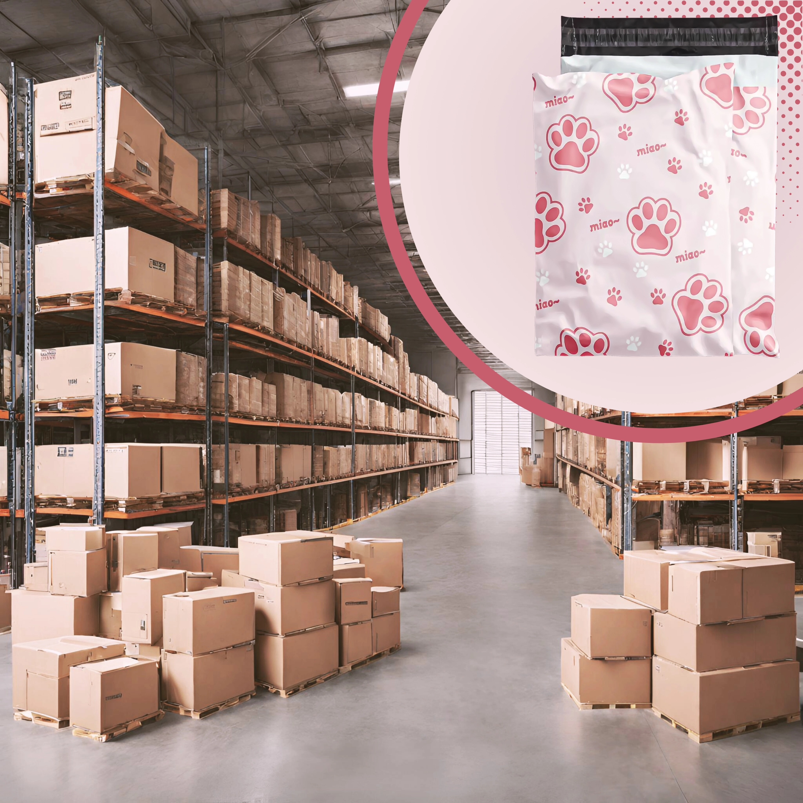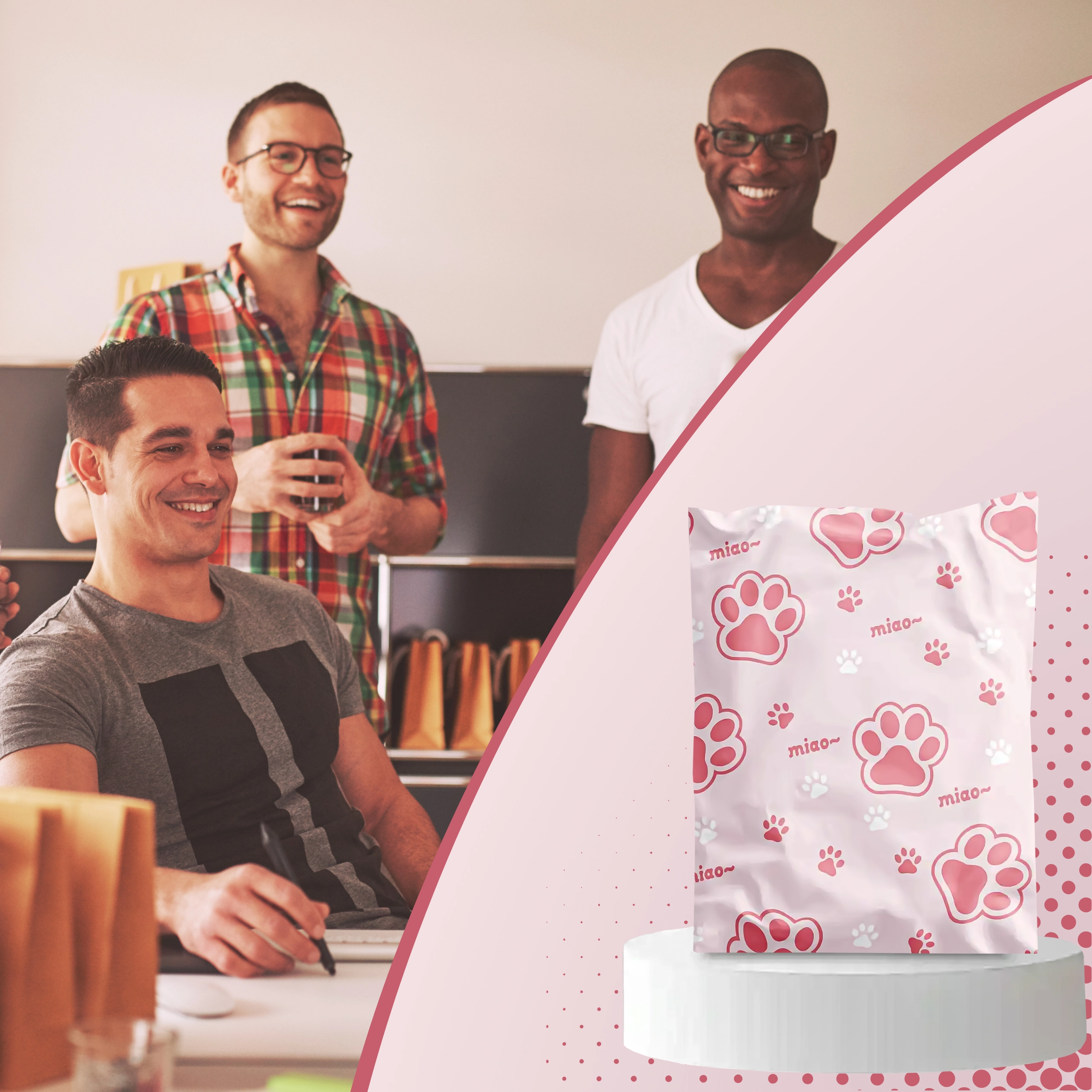 Růžovo-bílý potisk s nápisem „miao“ dodá zásilkám osobitost a vynikne mezi běžnými balíky.