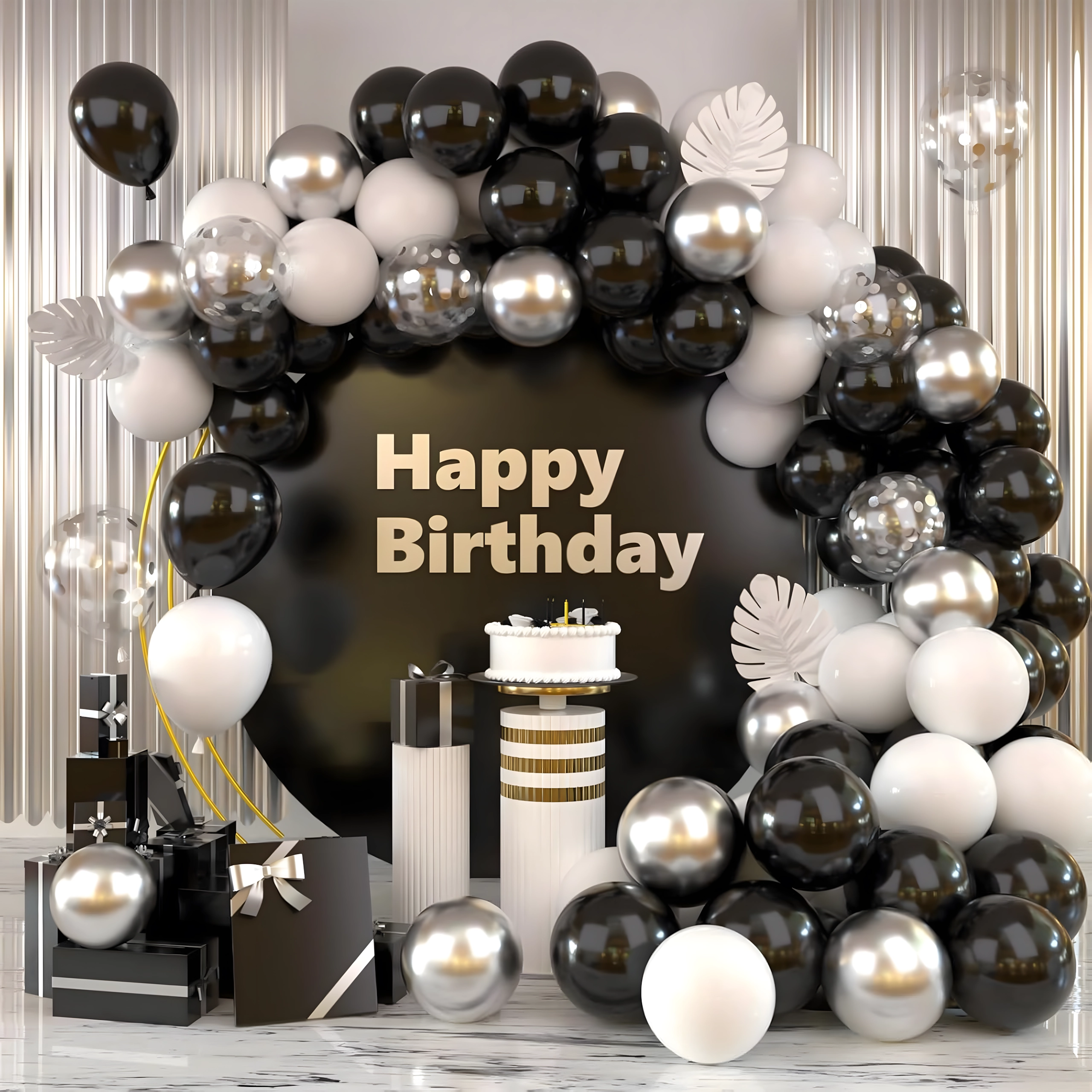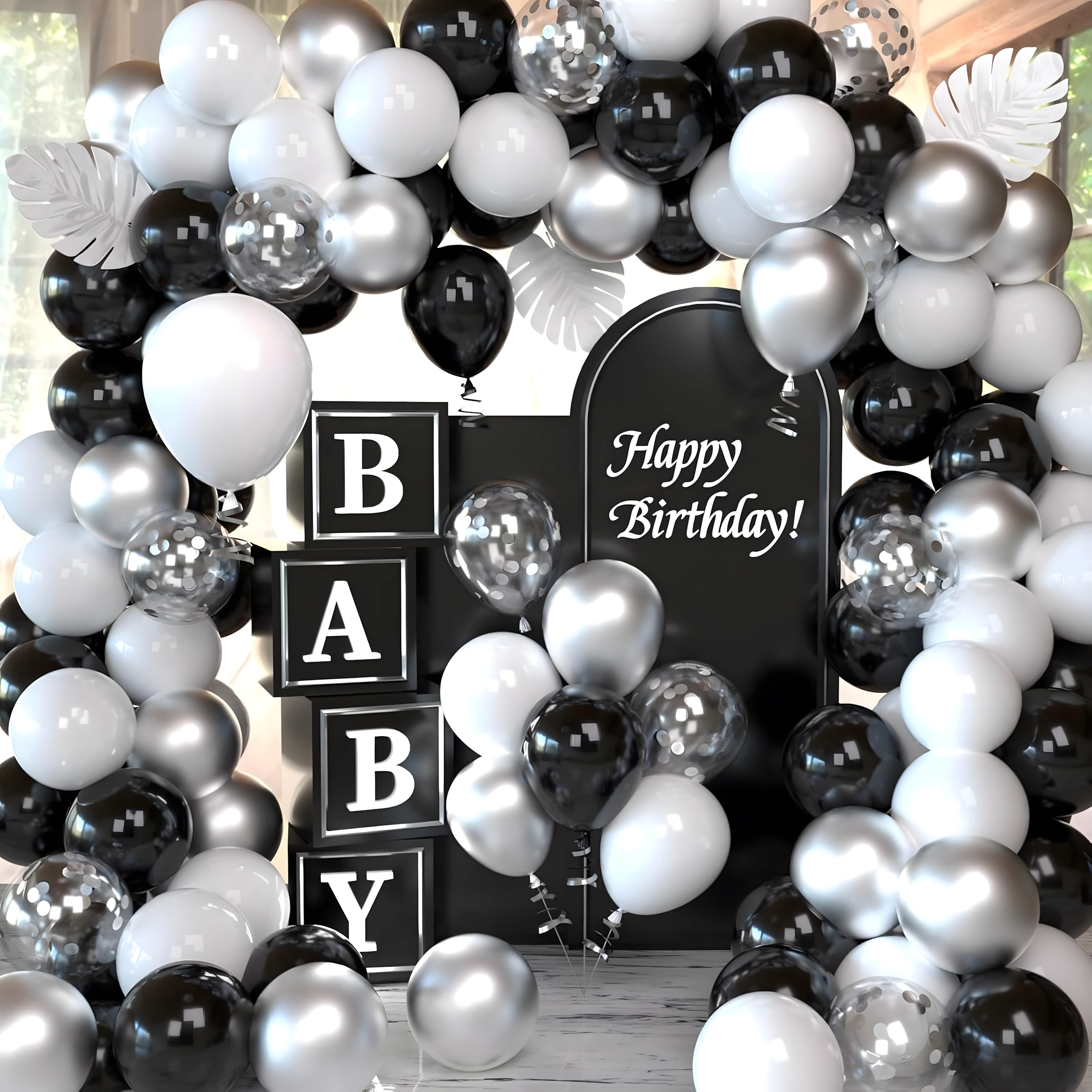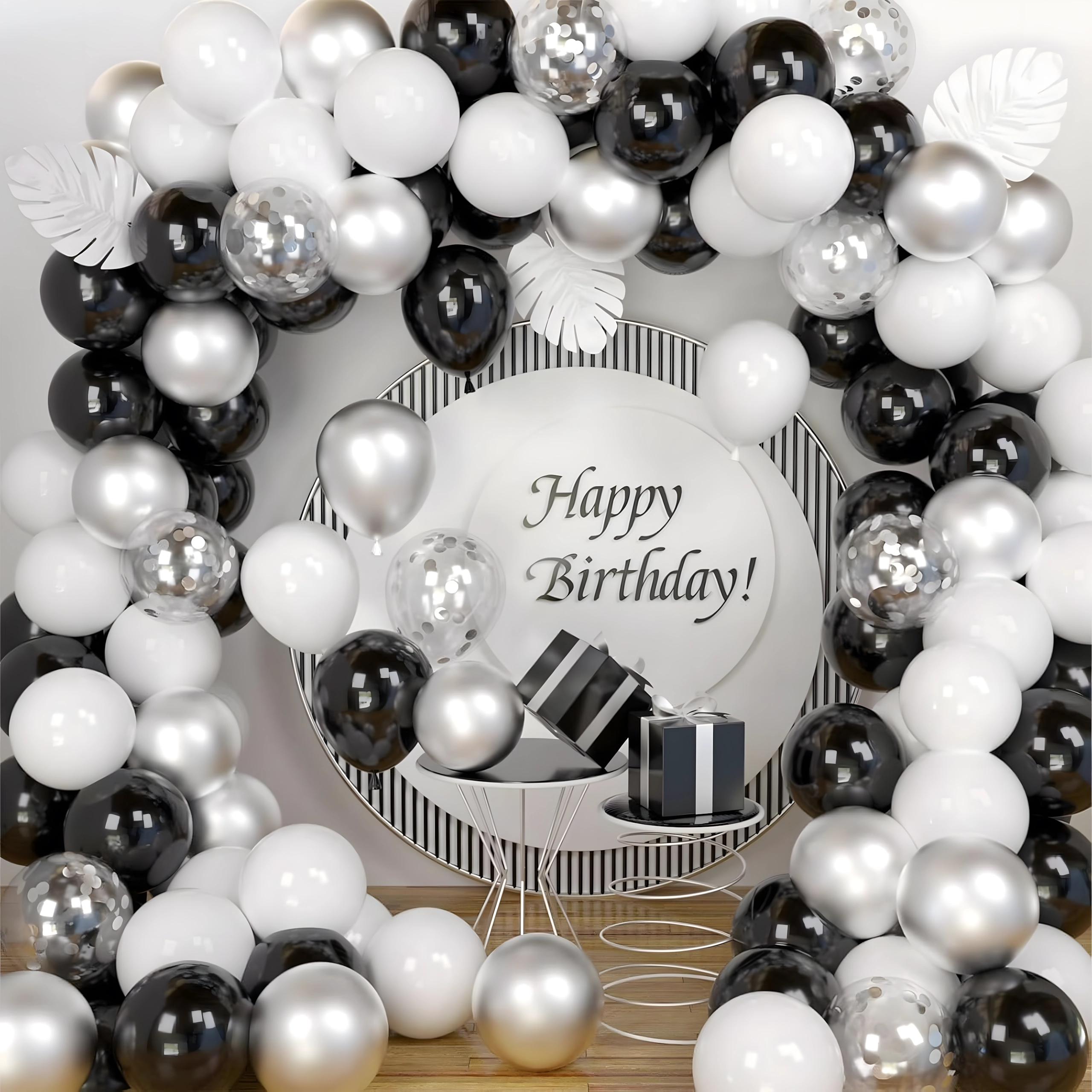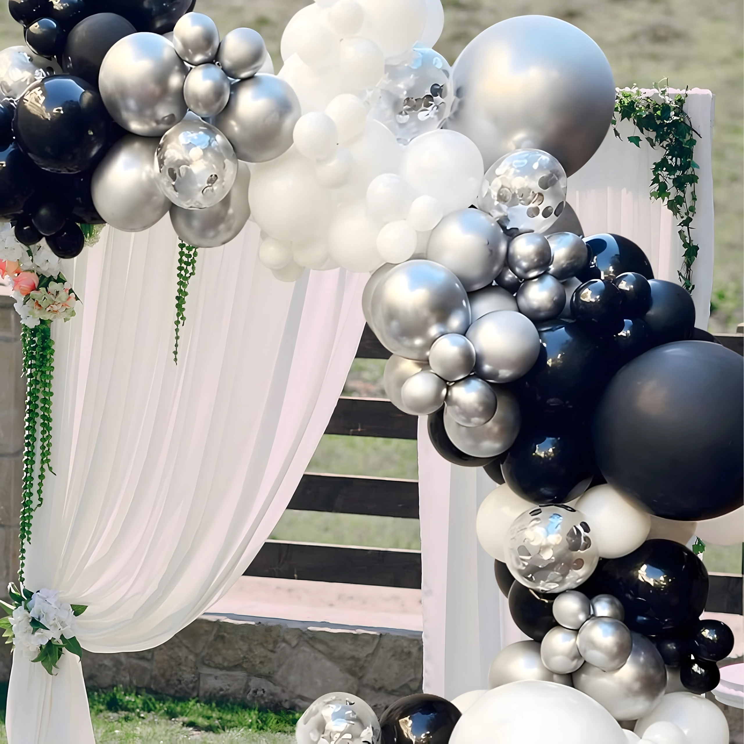 Stylová girlanda z balónků v kombinaci černé, stříbrné a bílé barvy pro narozeniny, svatby, silvestr i eventy. Snadná montáž, efektní barvy a perfektní foto pozadí pro každou oslavu.