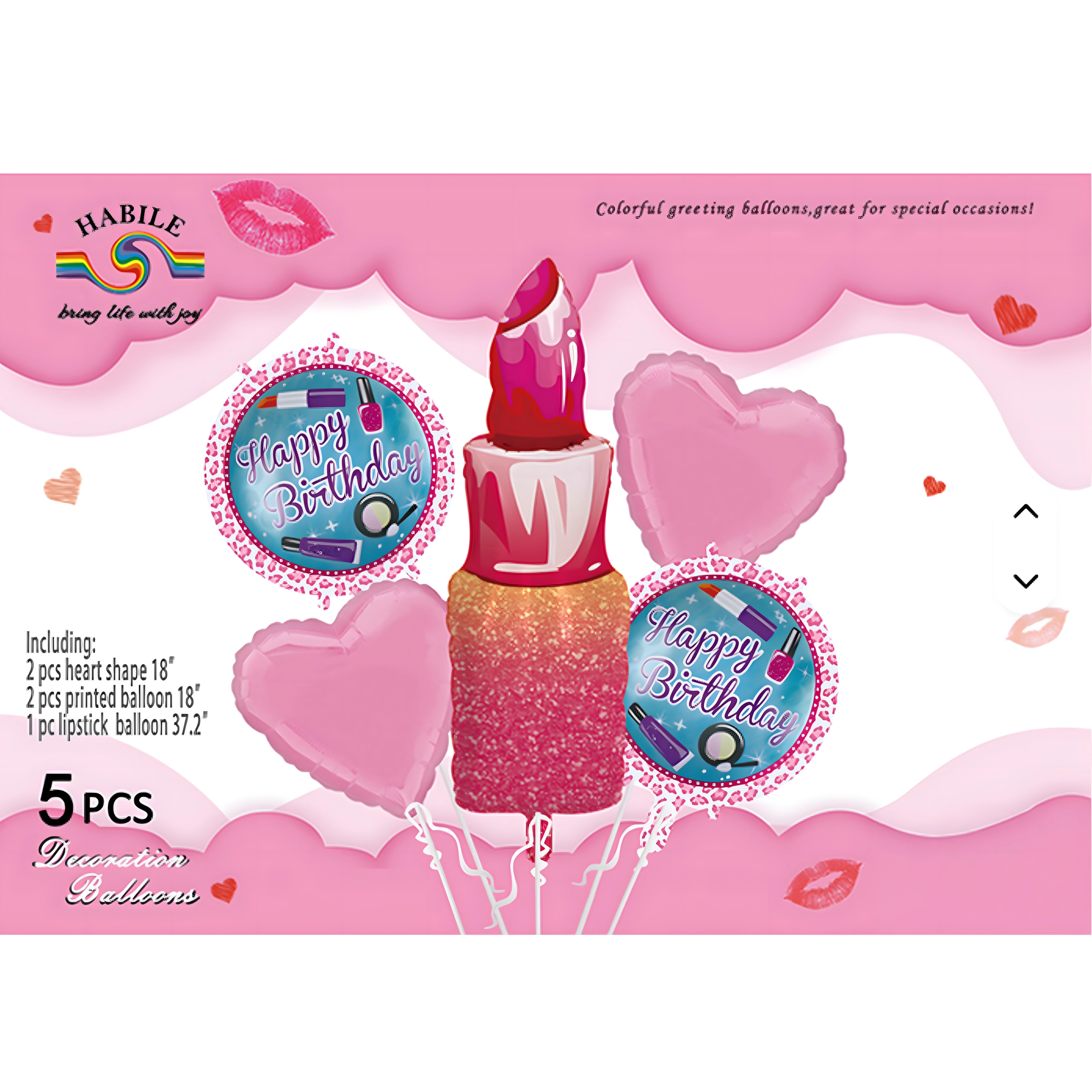 Stylová sada narozeninových balónků pro dívky obsahuje 5 kusů: rtěnku, rty, 2 balónky s nápisem Happy Birthday a srdce. Skvělé pro narozeniny, rozlučku se svobodou a další dámské oslavy.