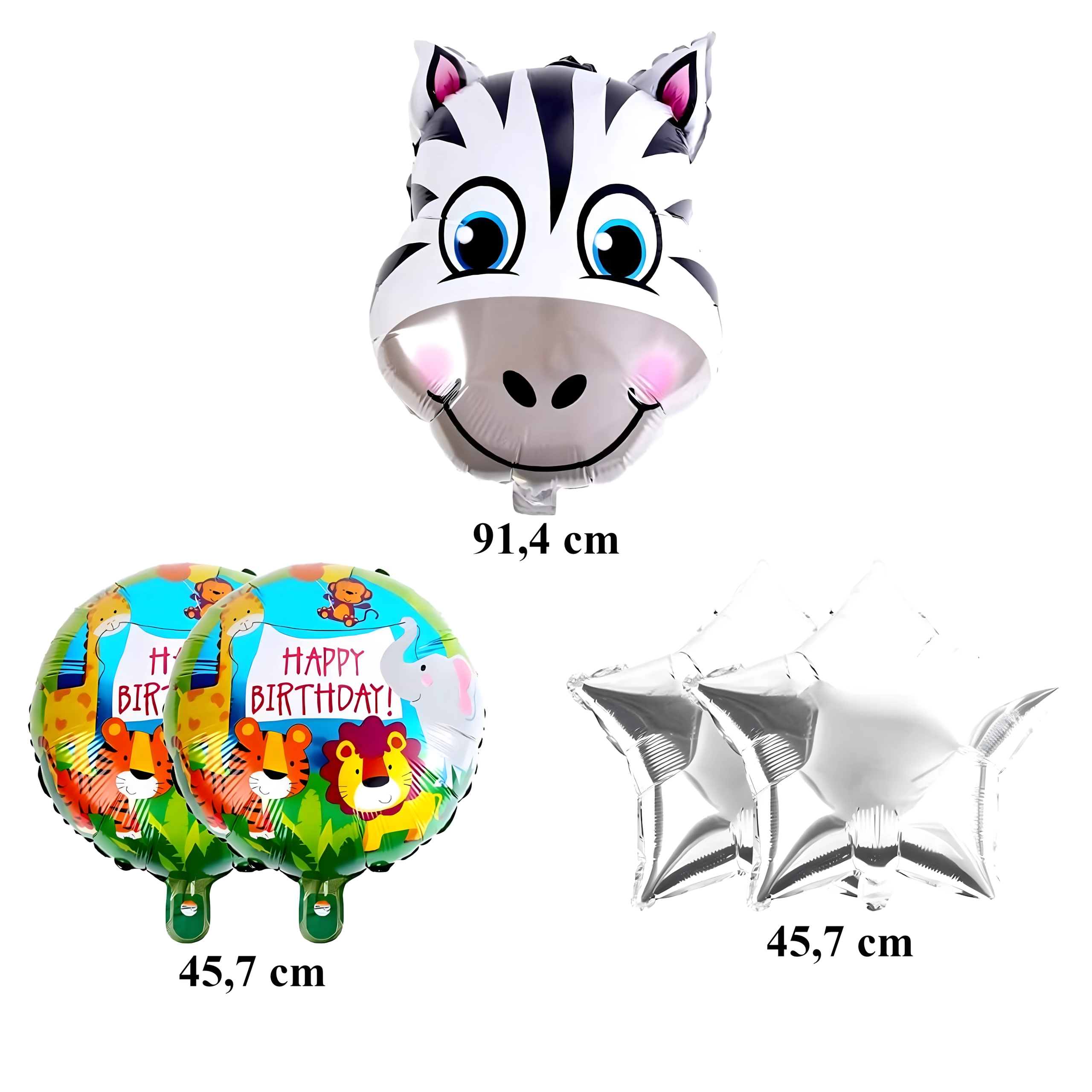 Veselá sada balónků se žirafou rozjasní každou dětskou oslavu. V balení najdete 1 fóliový balónek žirafa, 2 balónky s nápisem HAPPY BIRTHDAY a 2 zlaté hvězdičky – ideální pro narozeniny ve stylu zoo/safari.