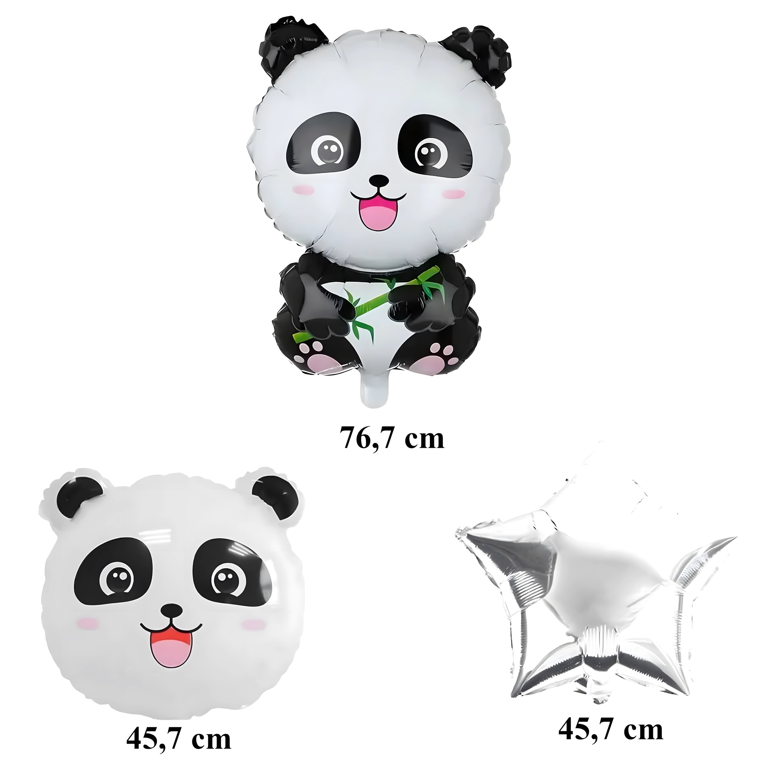Roztomilá sada balónků s motivem pandy rozzáří každou dětskou oslavu. Najdete v ní 1 velký balónek panda, 2 balónky s nápisem HAPPY BIRTHDAY a 2 stříbrné hvězdičky – ideální výzdoba pro narozeniny v zoo/safari stylu.