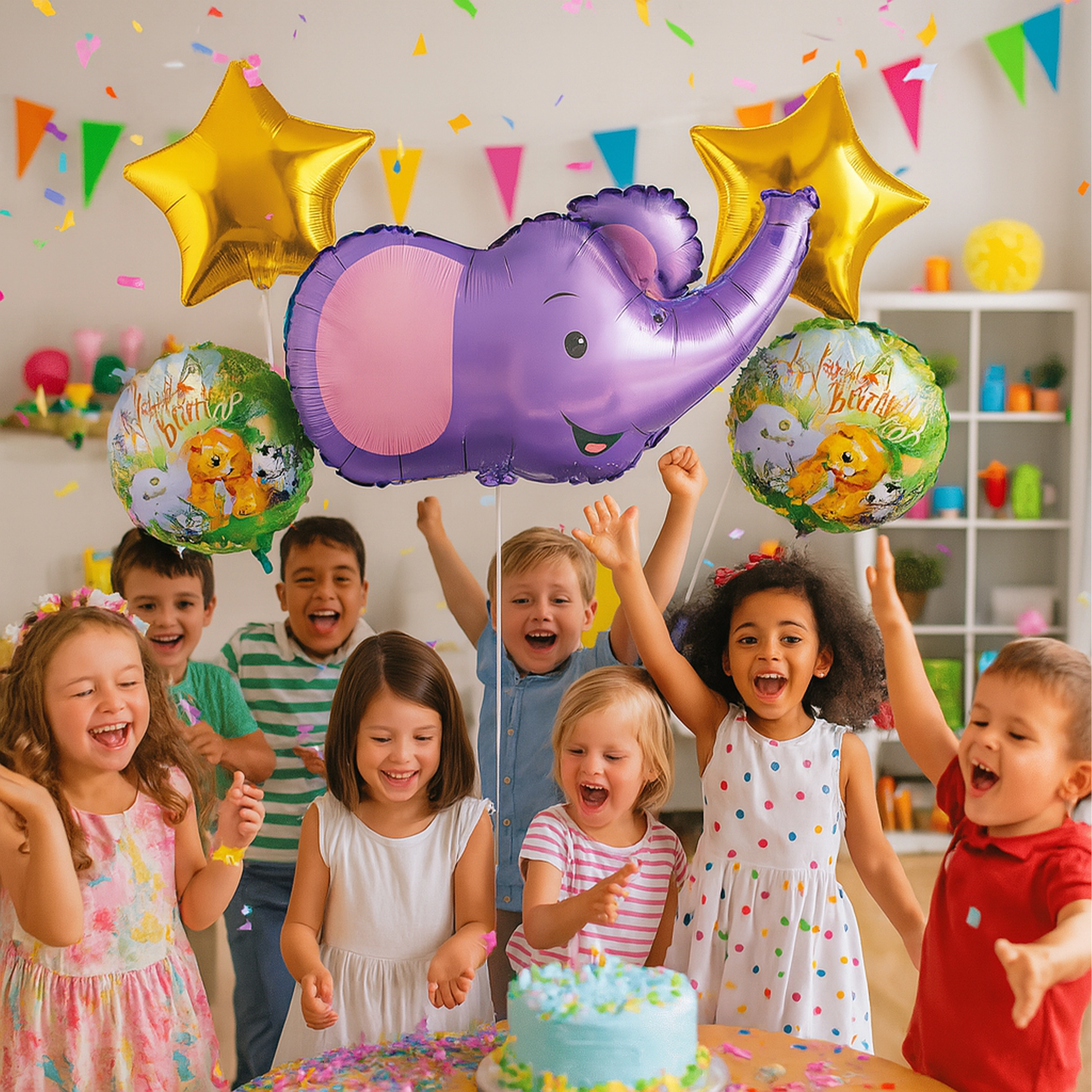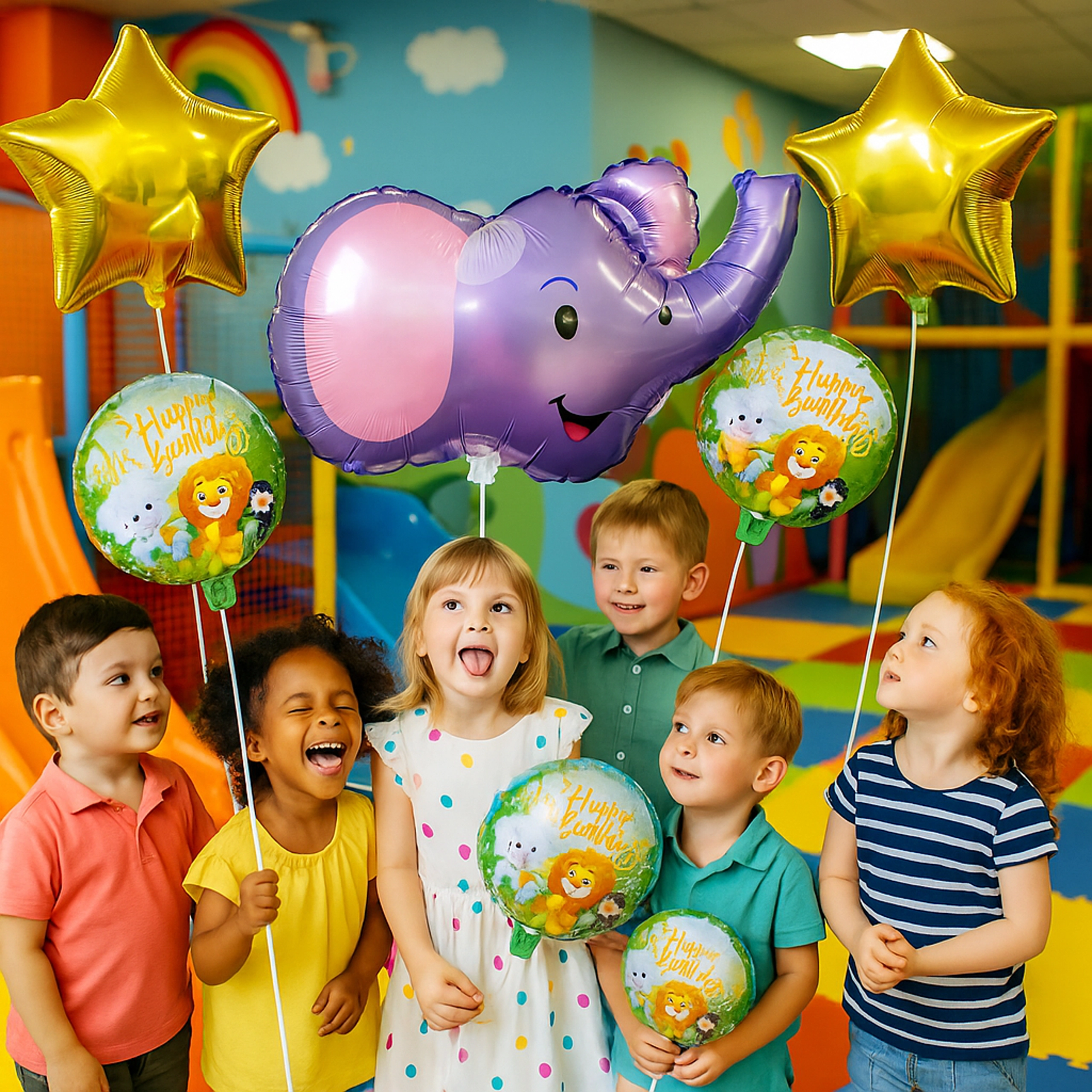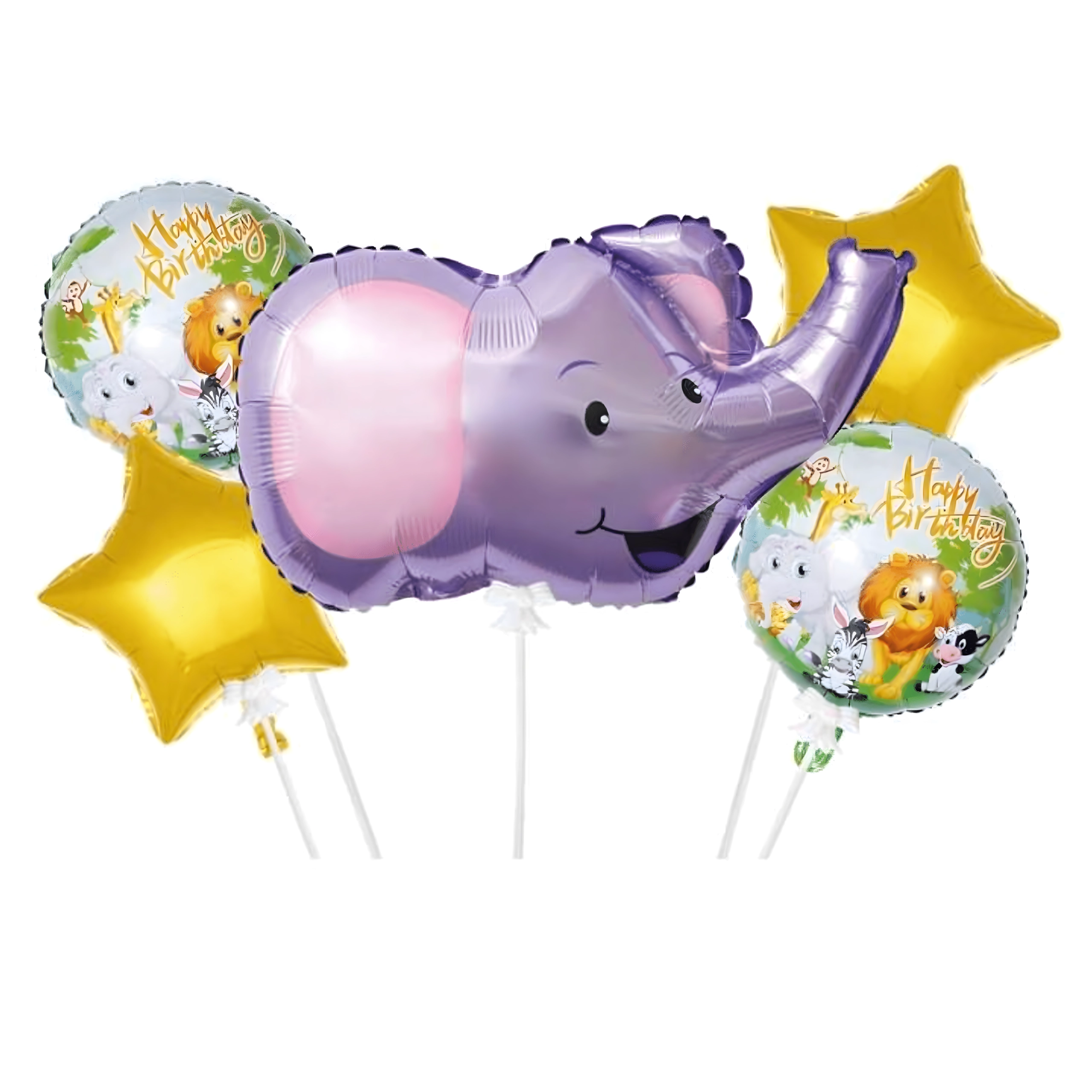 Tato barevná sada balónků dodá každé oslavě nezapomenutelnou atmosféru. Kombinace veselého slona, elegantních zlatých hvězdiček a narozeninových nápisů vytvoří okamžitou party dekoraci bez zdlouhavé přípravy.