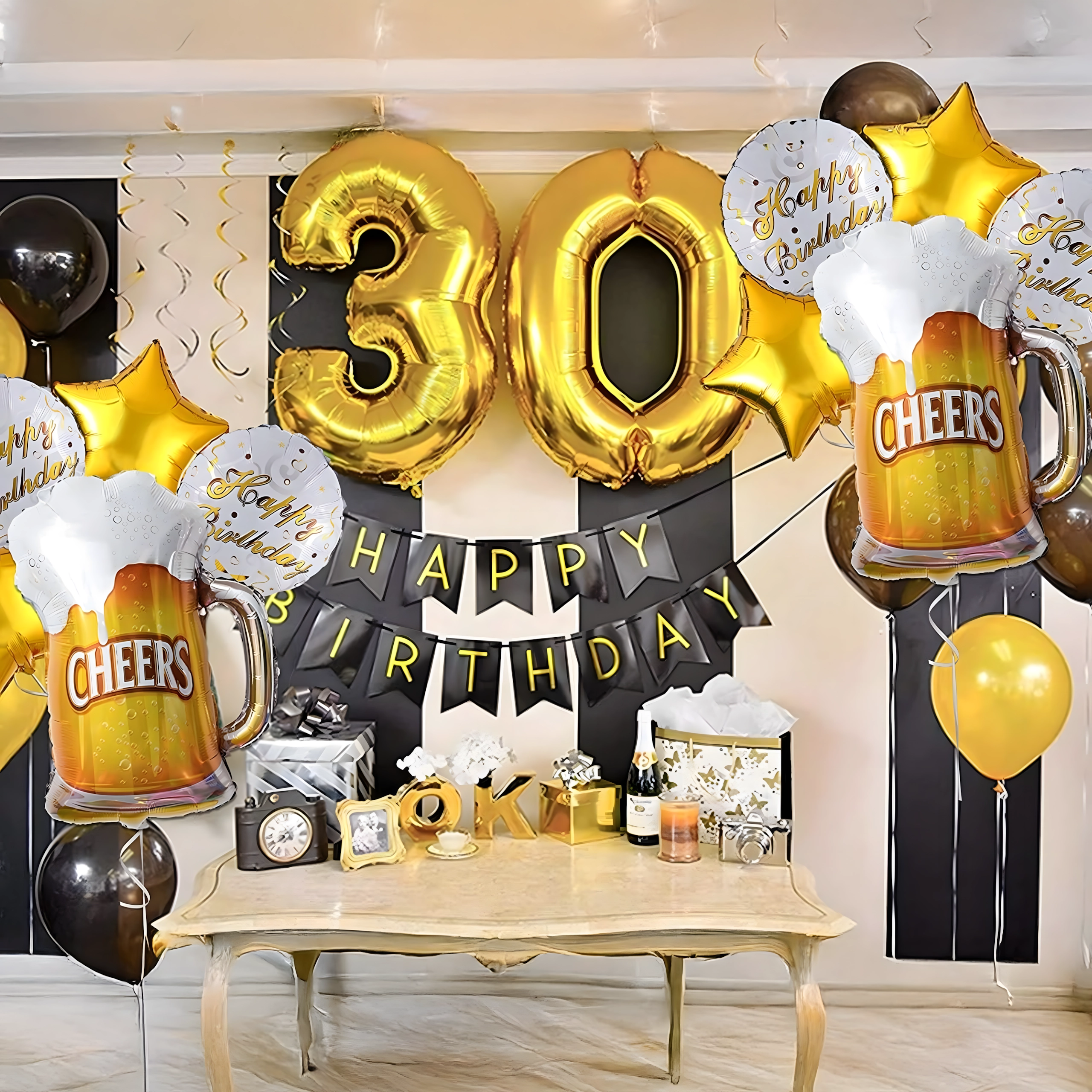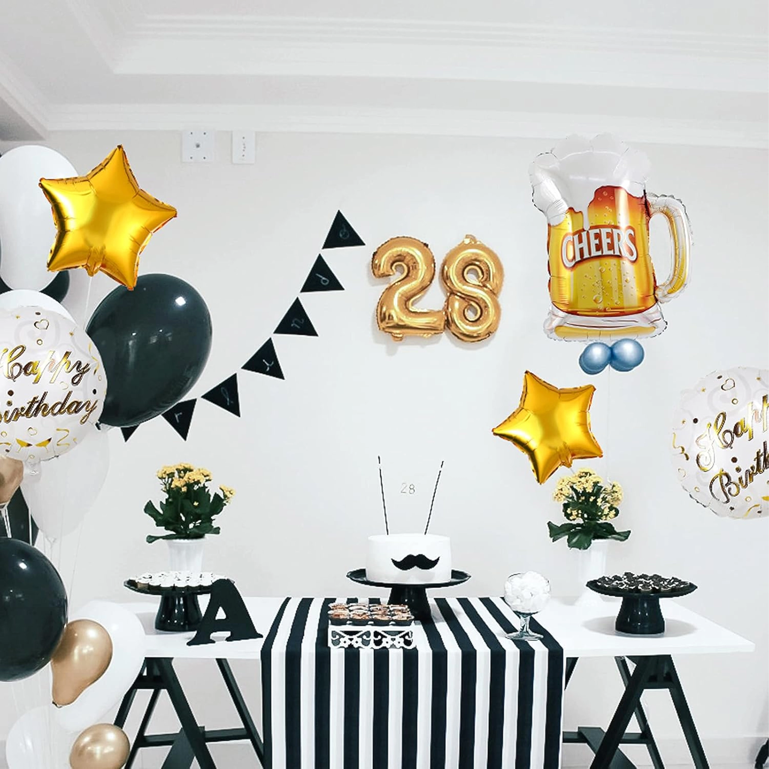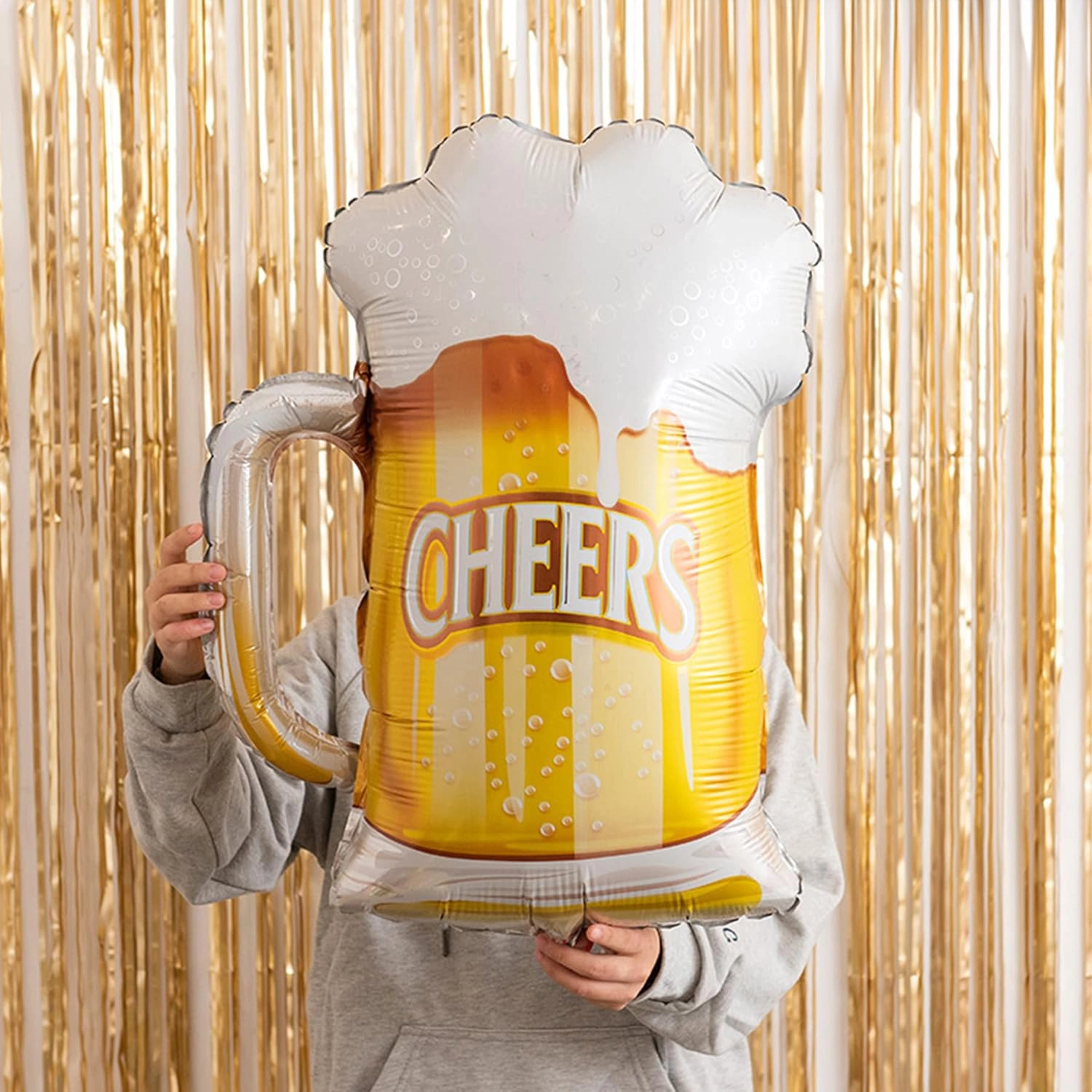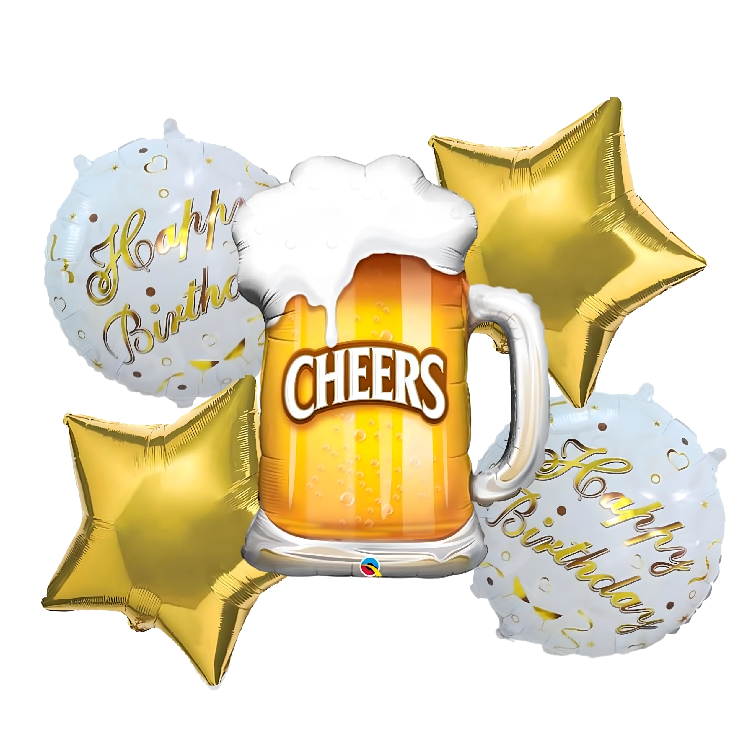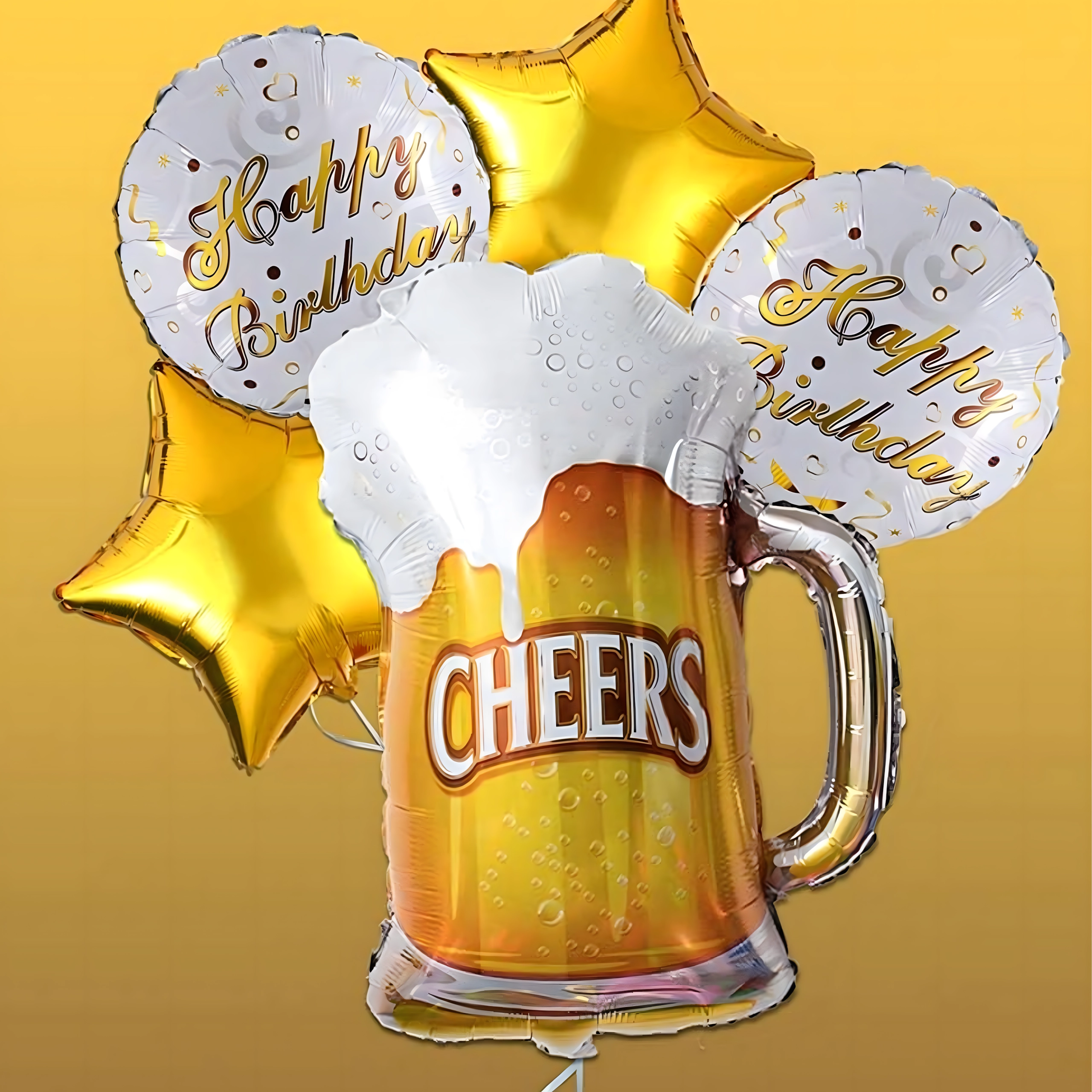 Stylová sada foliových balónků CHEERS s motivem pivního půllitru, dvěma nápisy Happy Birthday a dvěma zlatými hvězdami je skvělou volbou pro narozeniny dospělých, rozlučku se svobodou i firemní večírek. Snadno se nafukuje heliem nebo vzduchem a vytváří okamžitý party efekt.