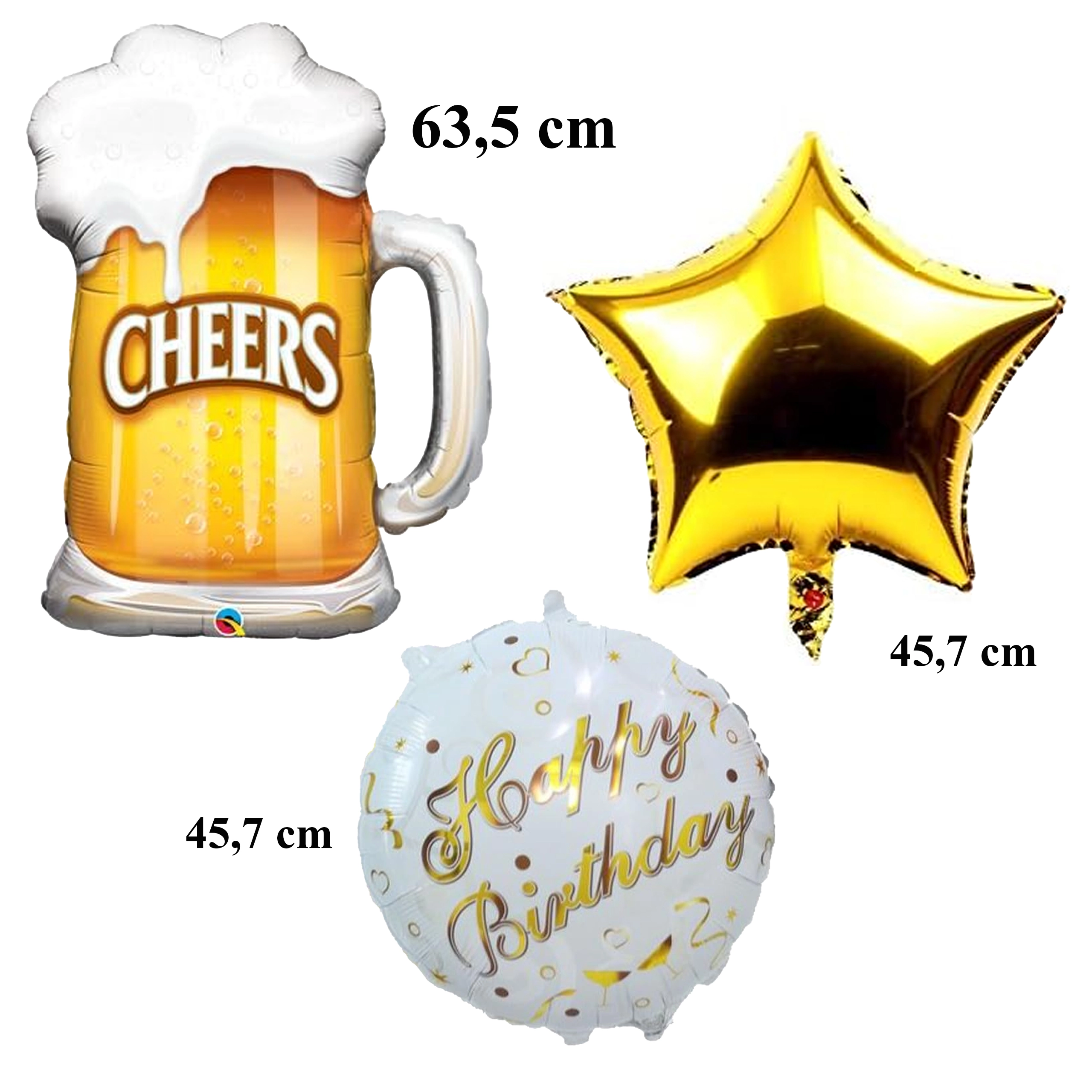 Tato designová sada balónků „CHEERS“ dodá vaší párty jedinečnou atmosféru. Dominantou je fóliový balónek ve tvaru kuflu piva, který doplňují dva balónky s nápisem Happy Birthday a dvě zlaté hvězdy. Kombinace motivů je ideální pro oslavy dospělých.