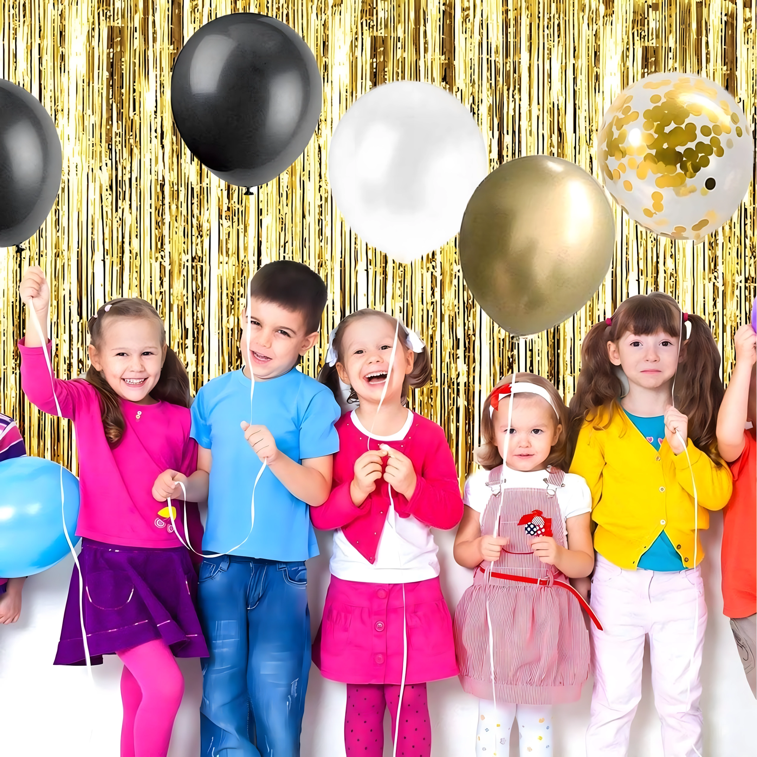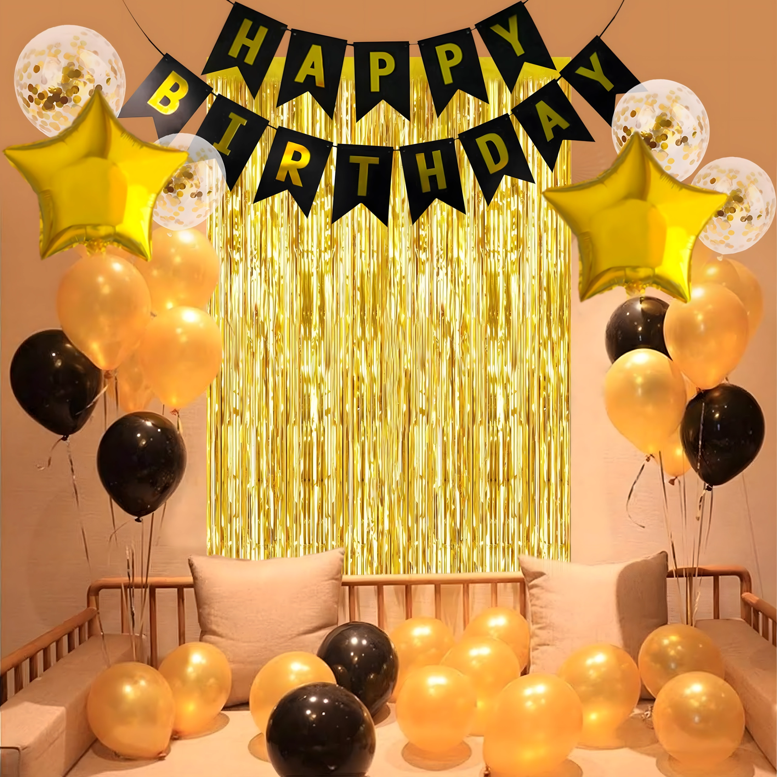 Tato komplexní dekorativní sada je ideální pro vytvoření výrazné narozeninové scény v černo‑zlatém provedení. Kombinace různých typů balónků a závěsné dekorace zajistí efektní pozadí pro fotografie i hlavní narozeninový stůl.