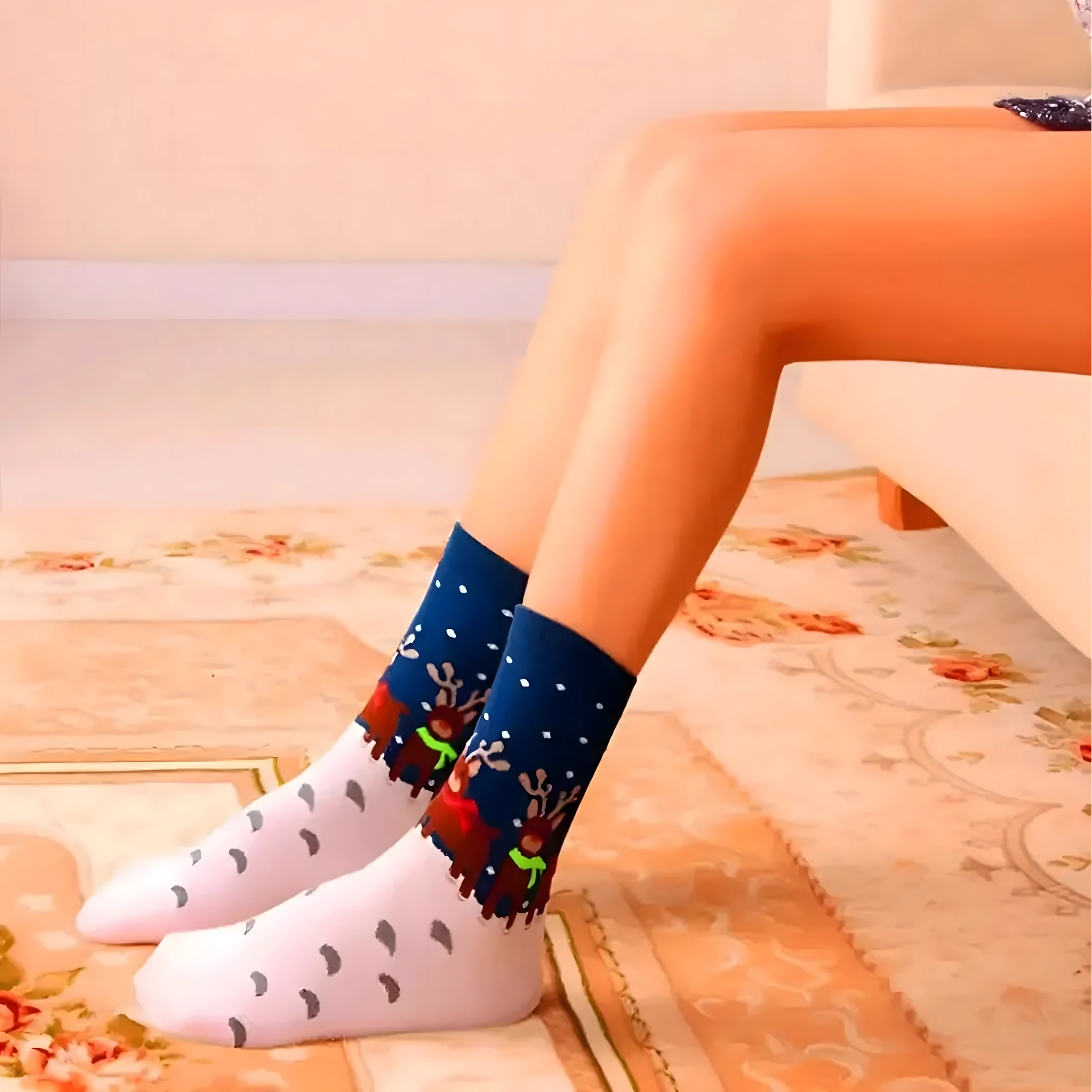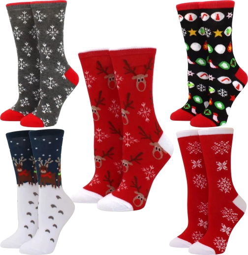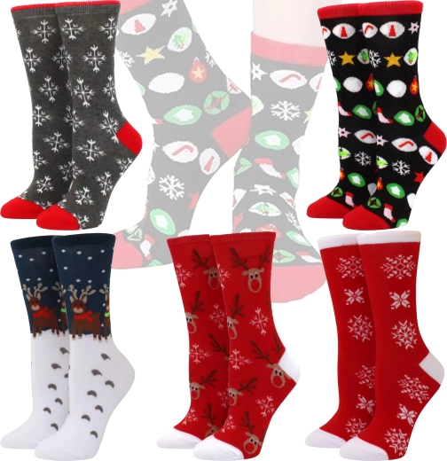 Stylový set 5 párů vánočních bavlněných ponožek pro pohodlí a radost v zimních dnech. Z vysoce kvalitní bavlny – měkké, prodyšné a příjemné na dotek. Veselé motivy jako sobíci, stromečky a sněhové vločky navodí sváteční atmosféru. Skvělý dárek na Vánoce i Mikuláše.