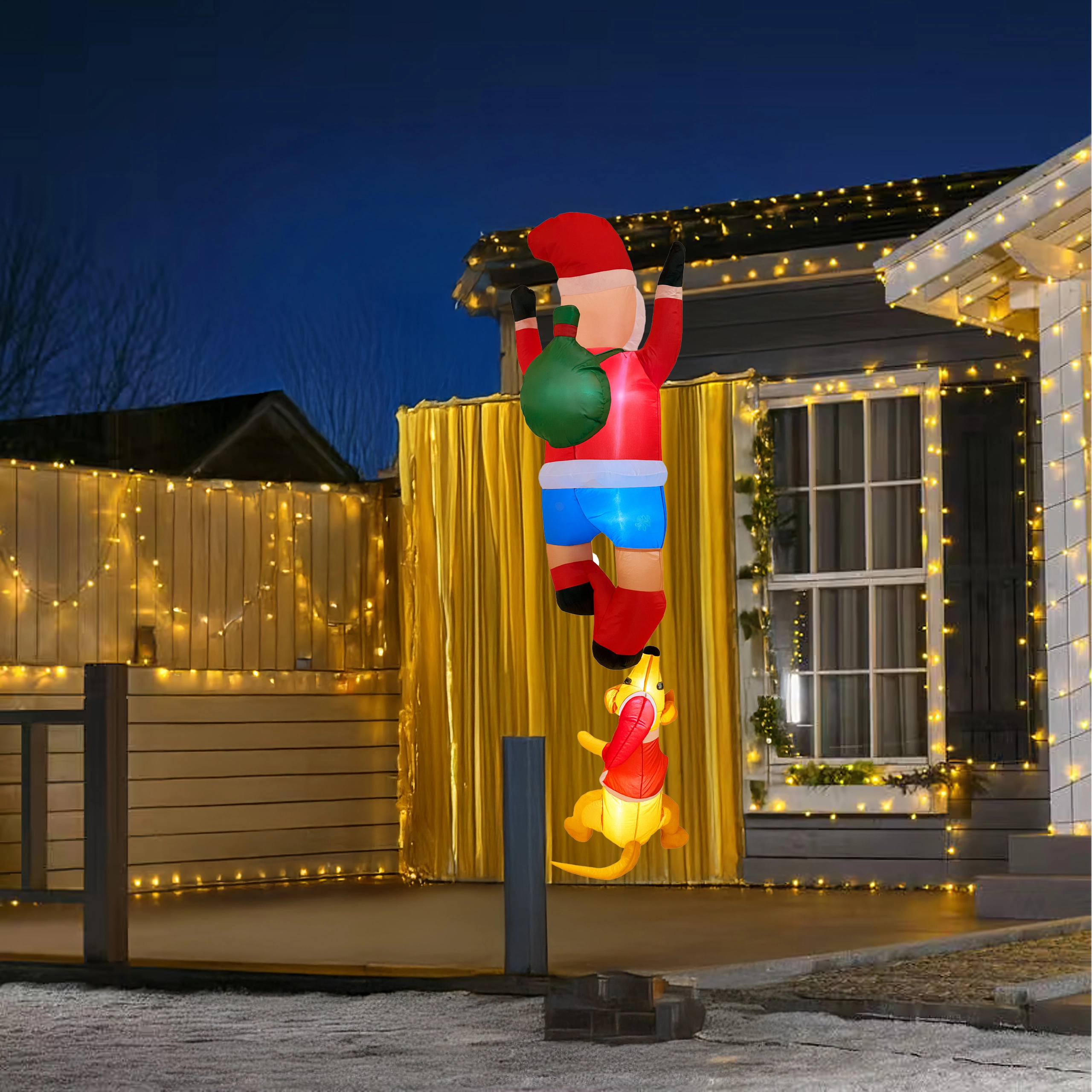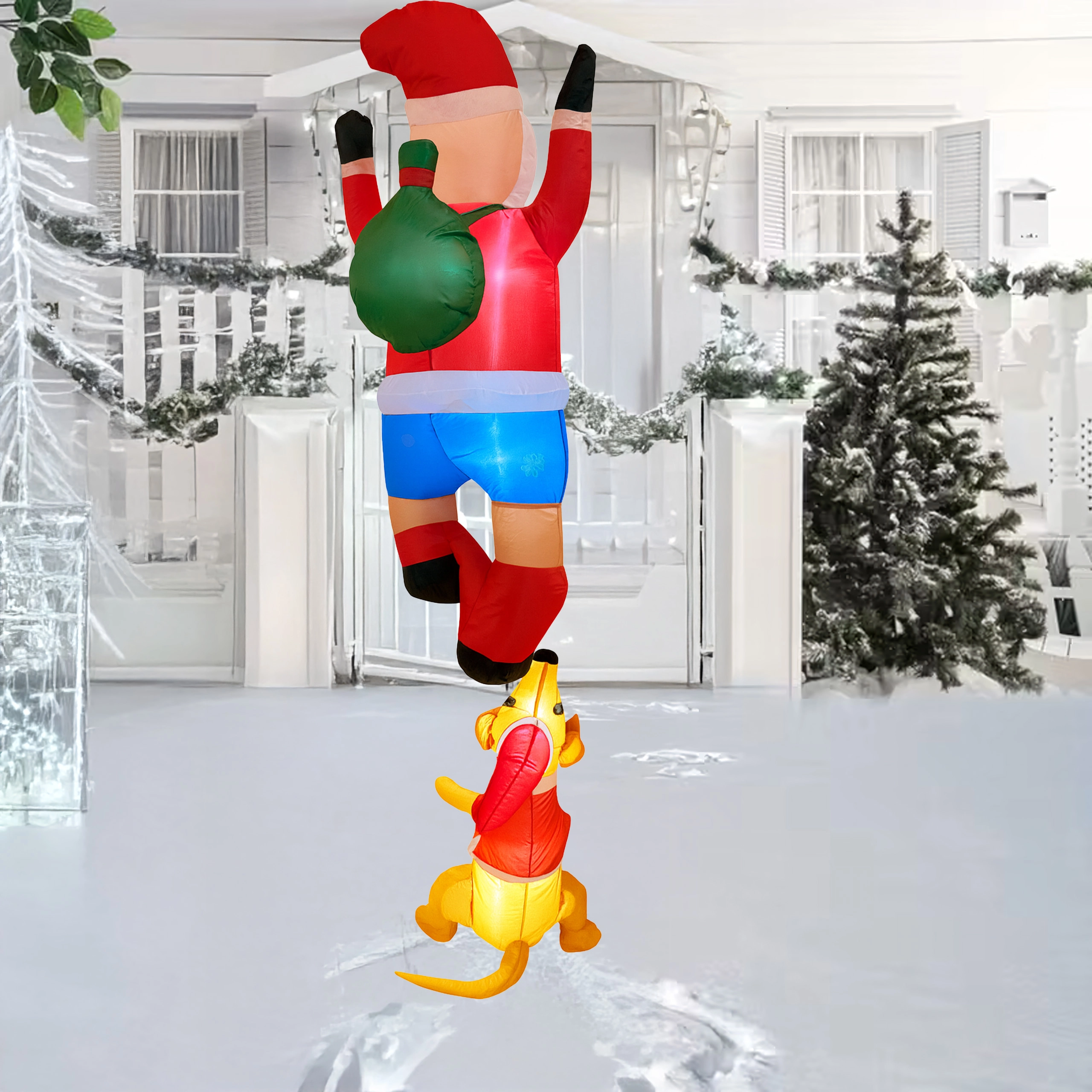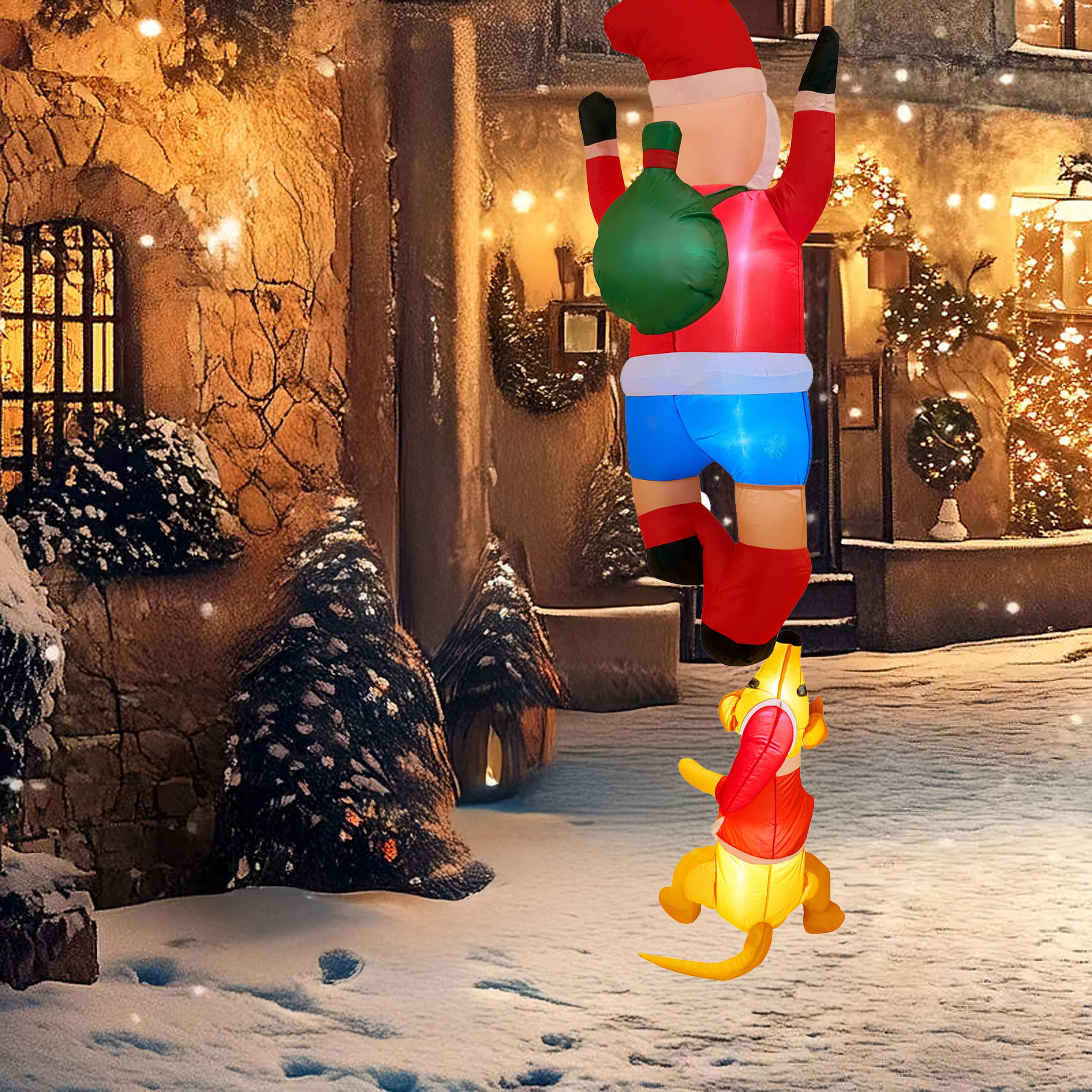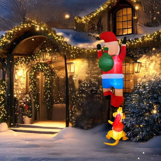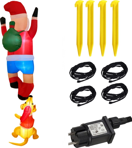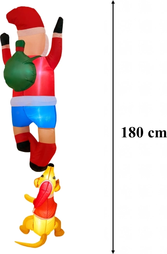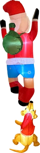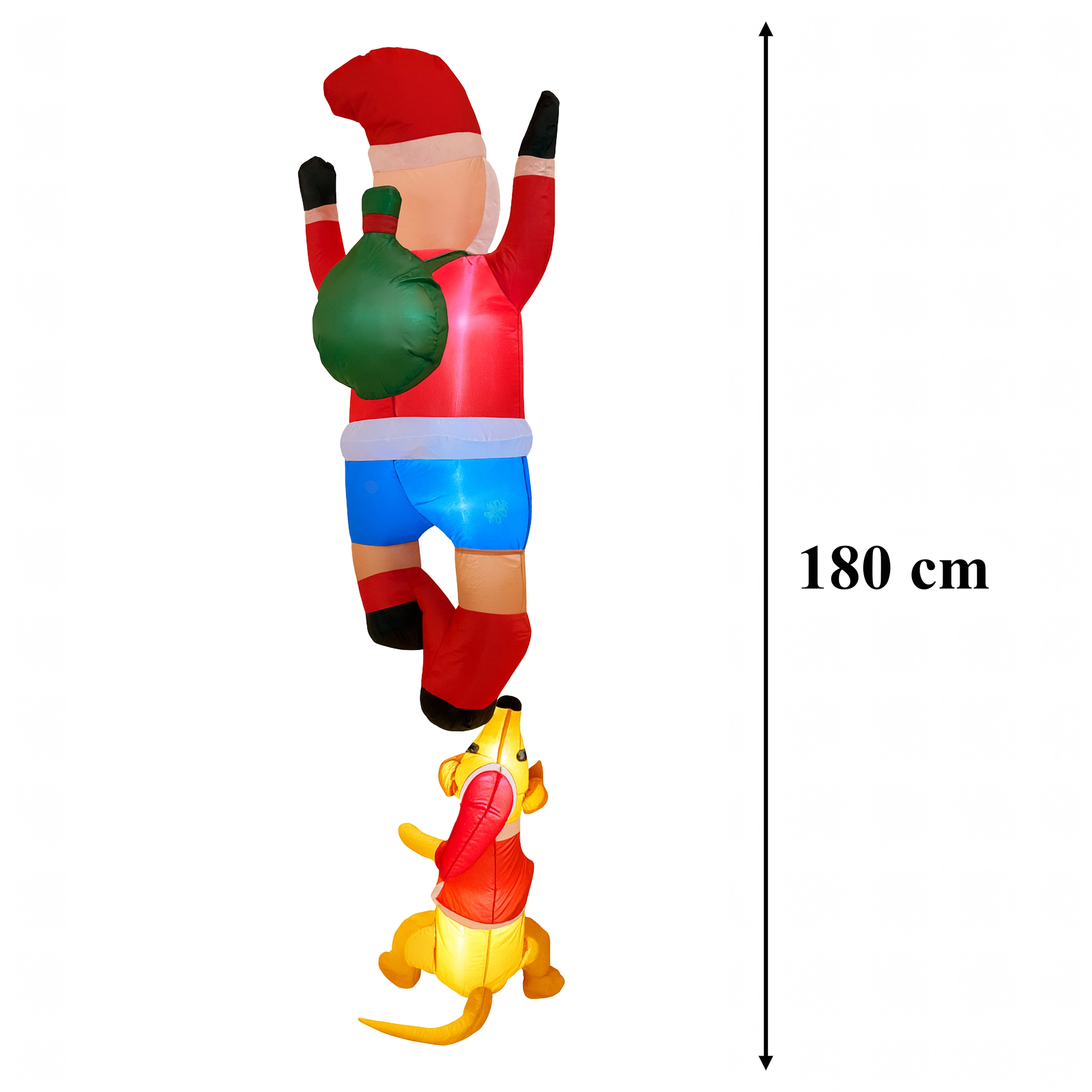 Nafukovací Santa s sobem 1,8 m je originální a zábavná vánoční dekorace, která vytvoří kouzelnou atmosféru doma i na zahradě. Díky integrovanému LED podsvícení a nápaditému designu přitahuje pozornost a vykouzlí úsměv dětem i dospělým. Je vyrobena z odolné polyesterové tkaniny vhodné pro použití v interiéru i exteriéru.