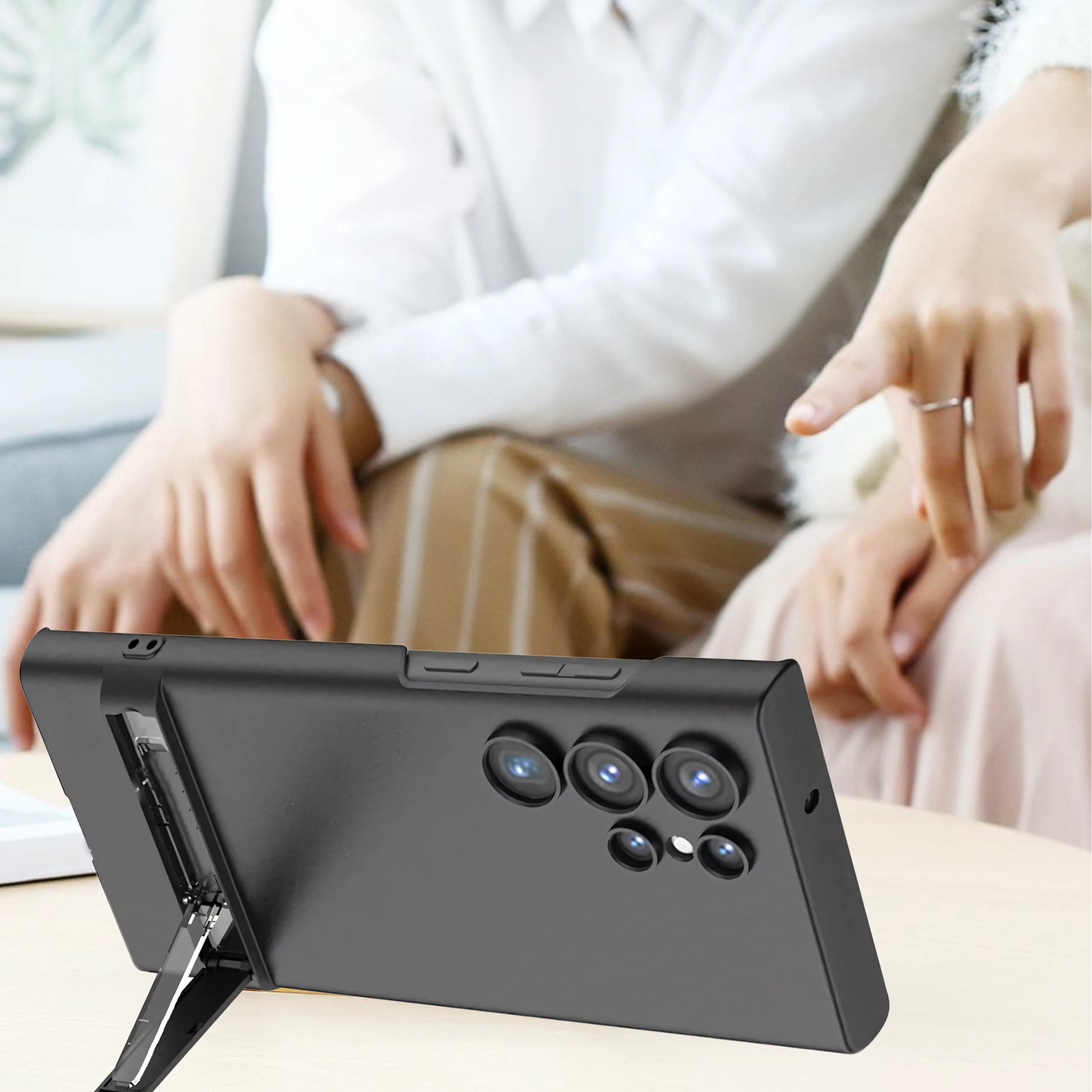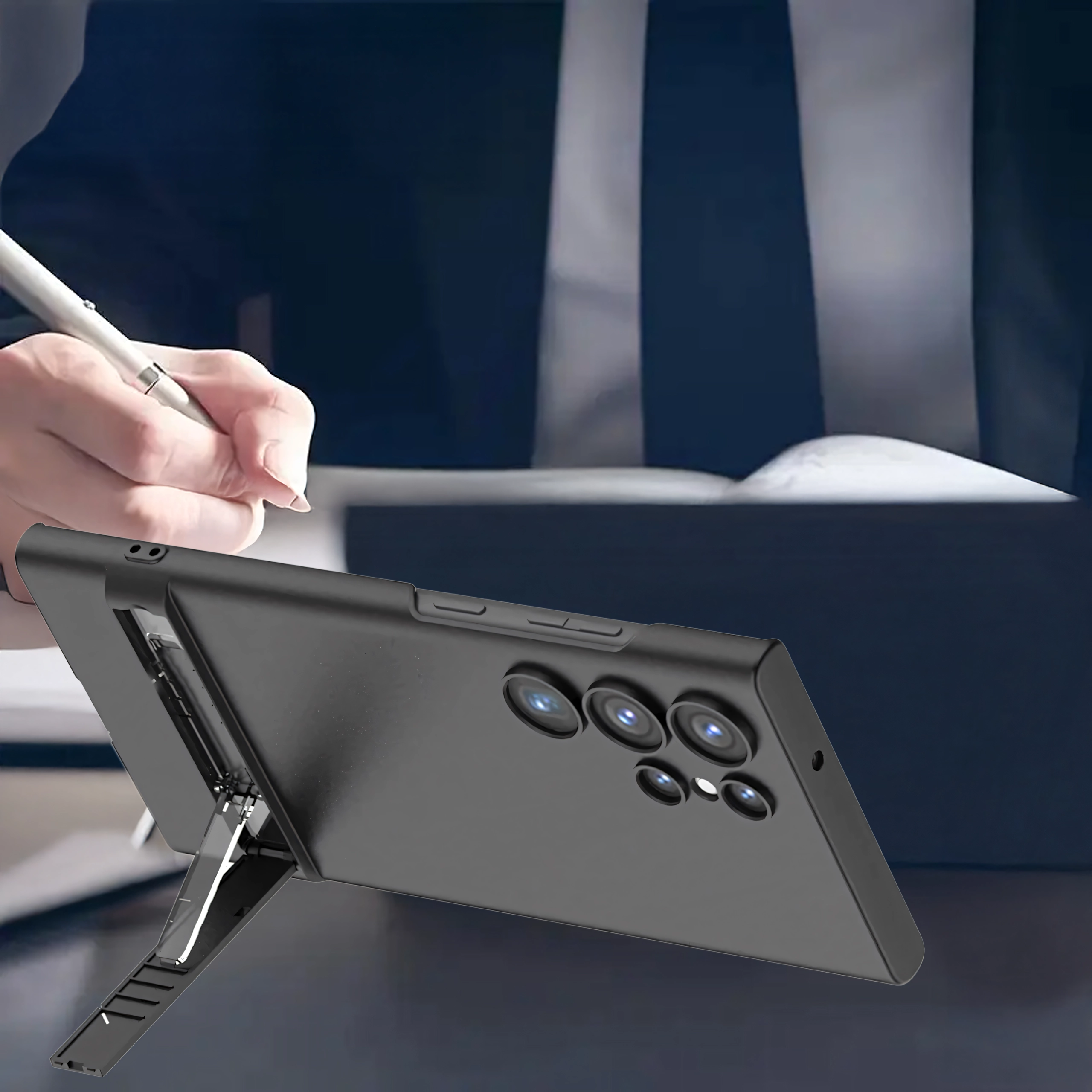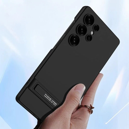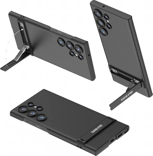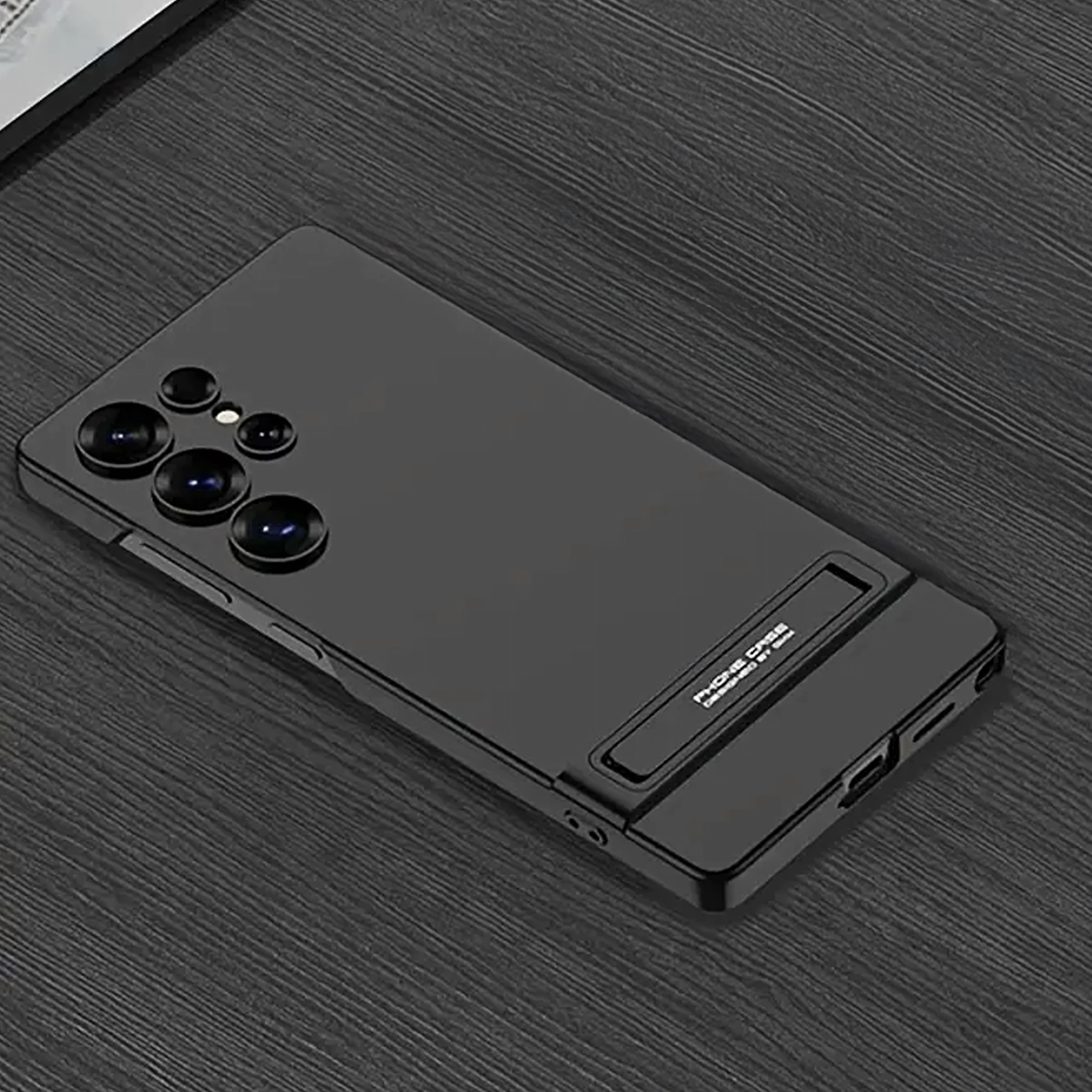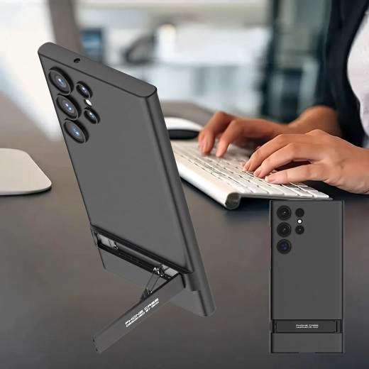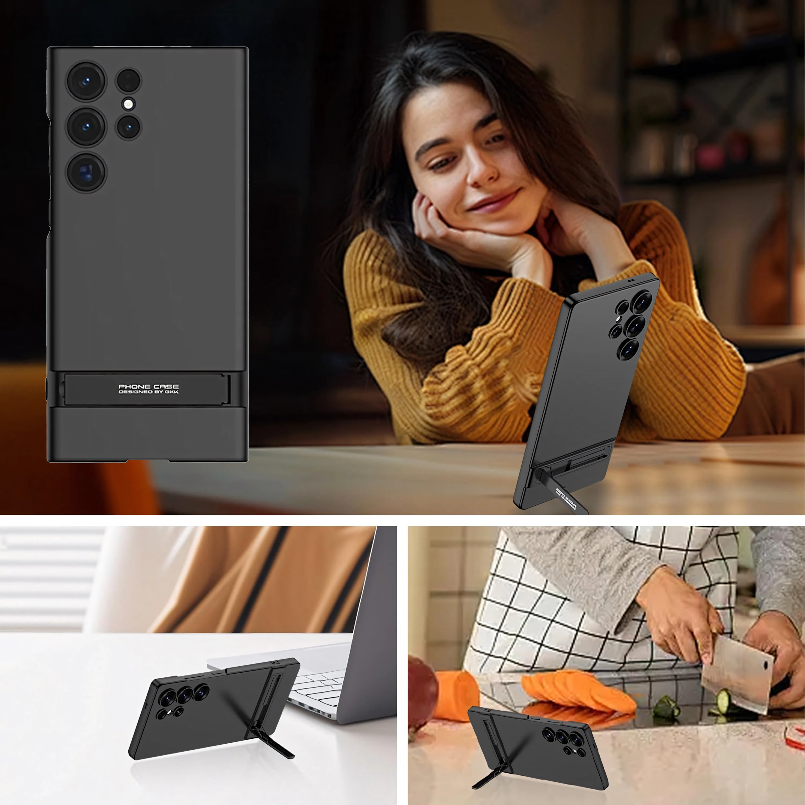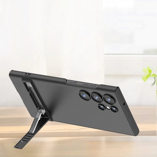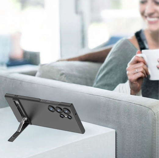 Stylové a odolné pouzdro pro Samsung Galaxy S24 Ultra v elegantní černé barvě. Nabízí štíhlý profil, spolehlivou ochranu proti poškrábání a pádům a praktický integrovaný stojánek pro pohodlné sledování videí a videohovory.
